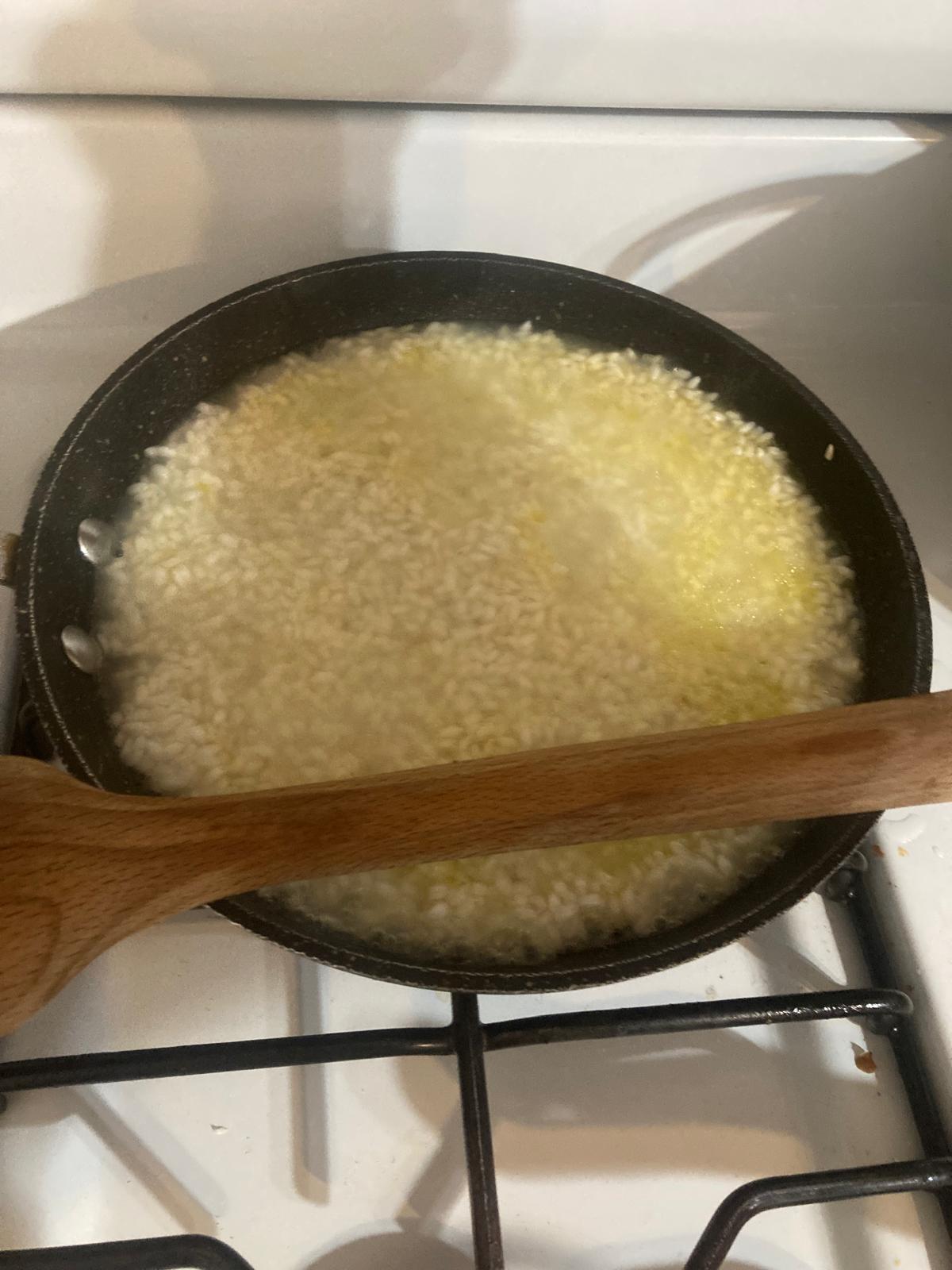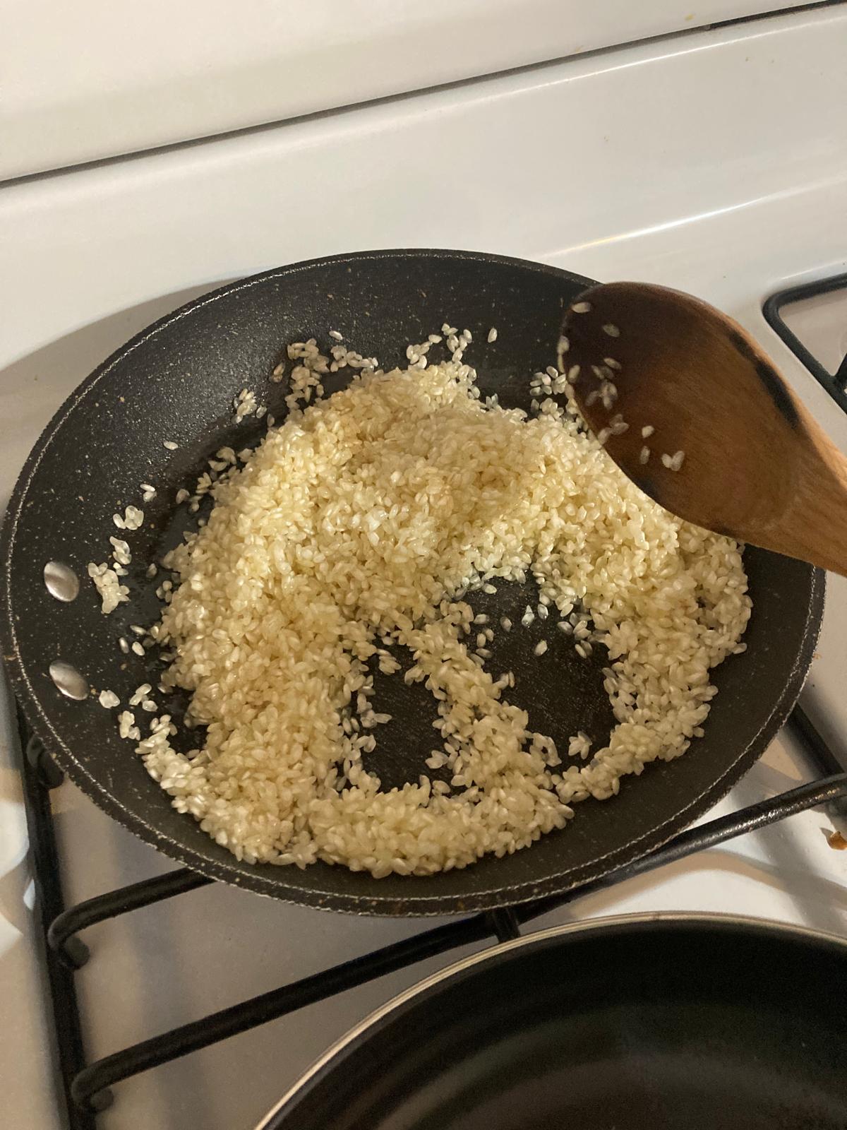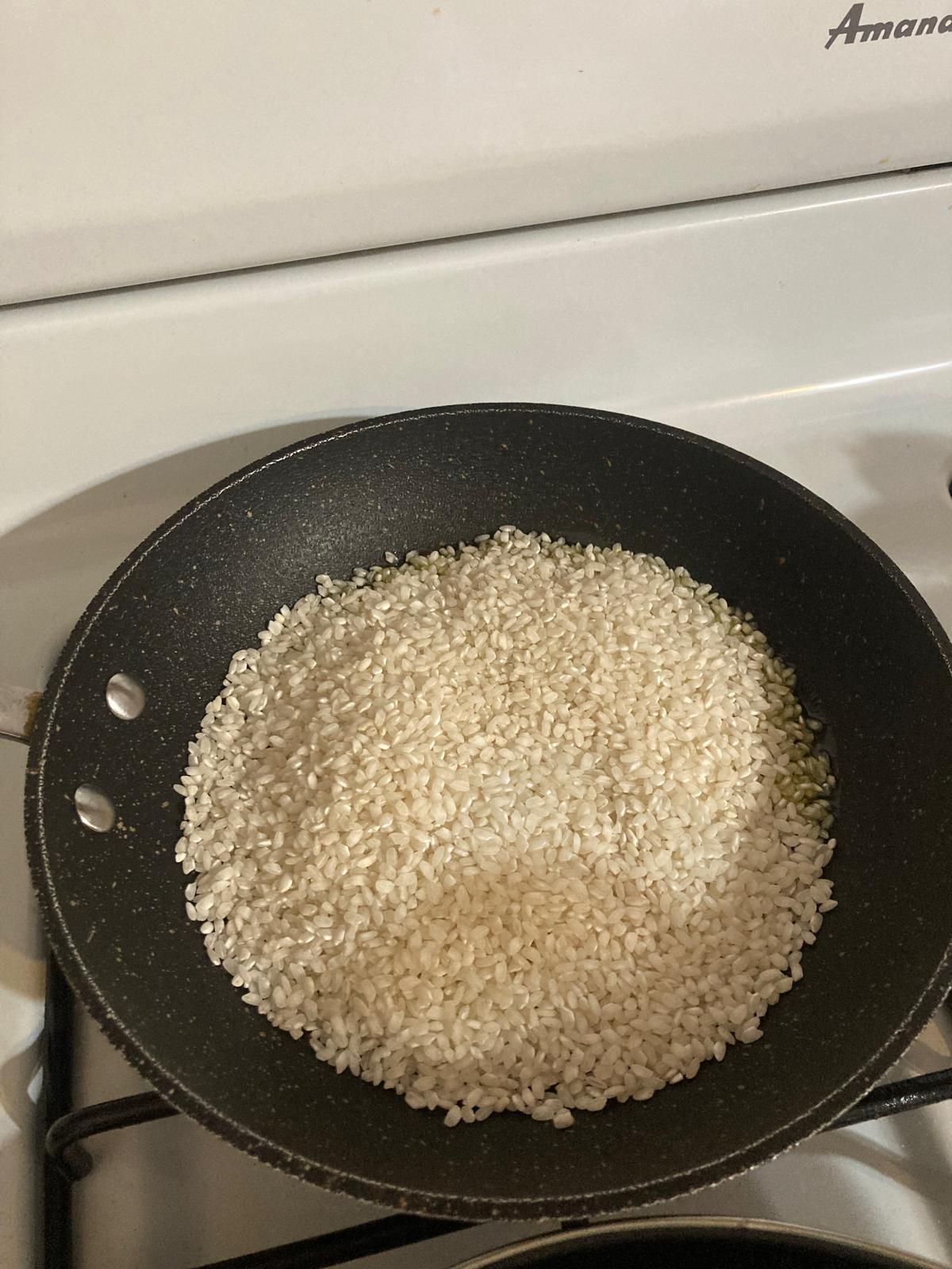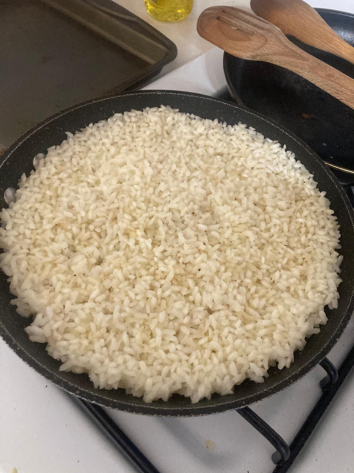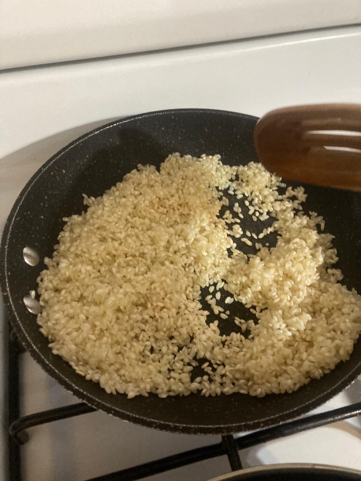 - Ponemos el aceite en la sartén a fuego medio. Metemos el arroz y lo dejamos en el aceite unos 3-5 minutos, sin que se tueste.