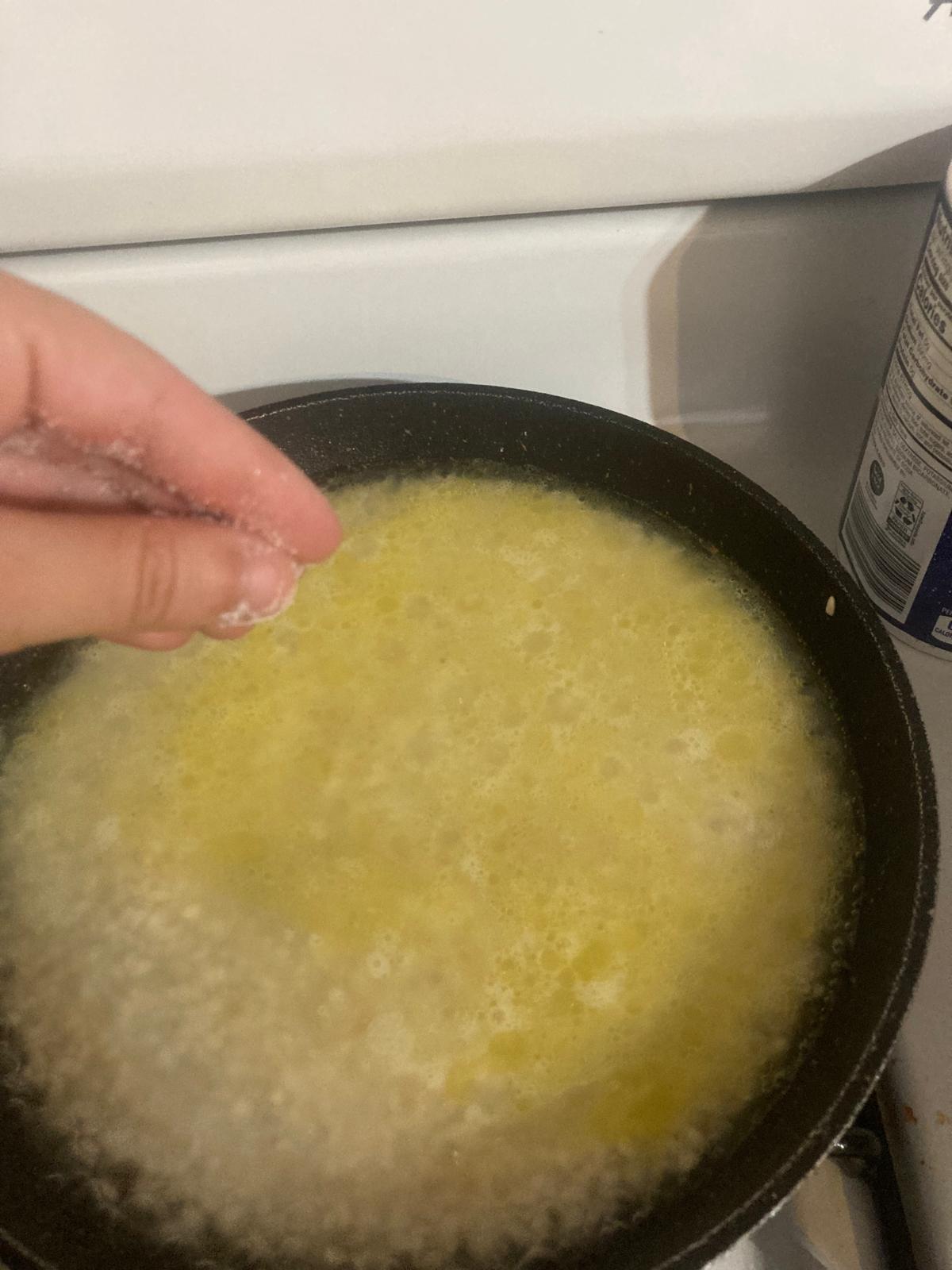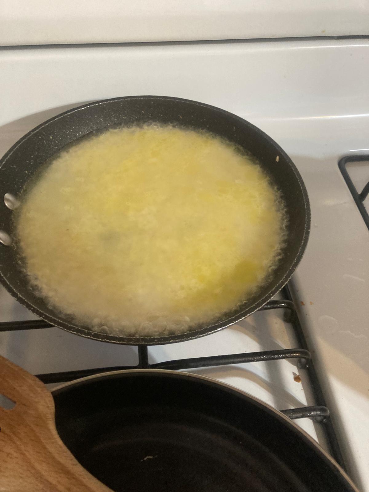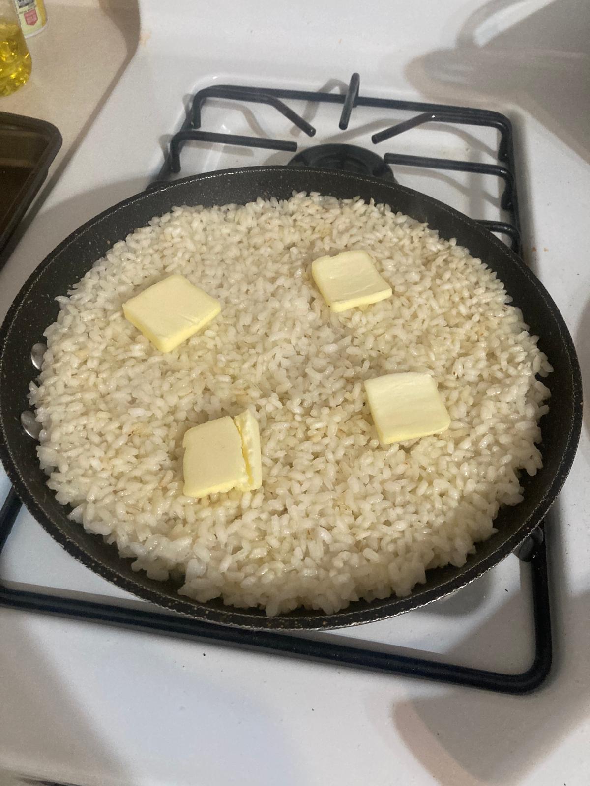 - Cuando el agua esté casi totalmente absorbida y el arroz a buen punto, ponemos la mantequilla por encima.