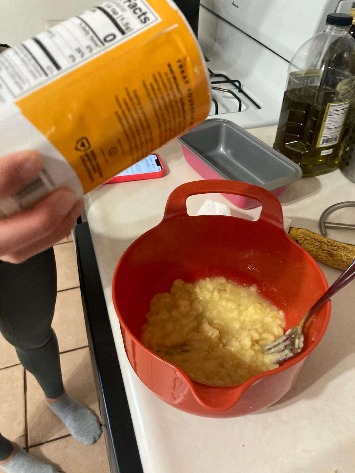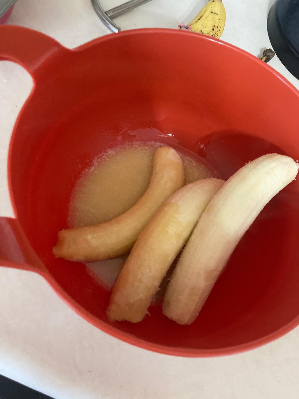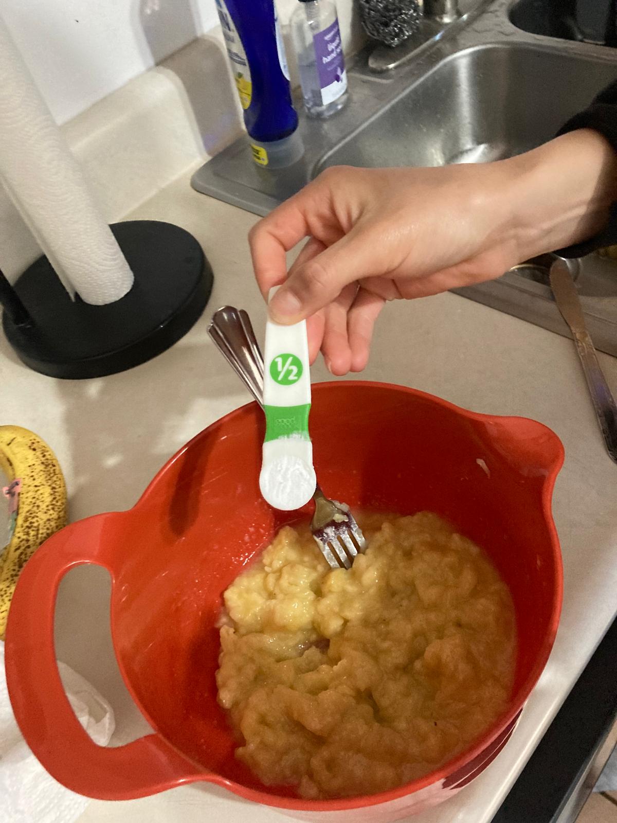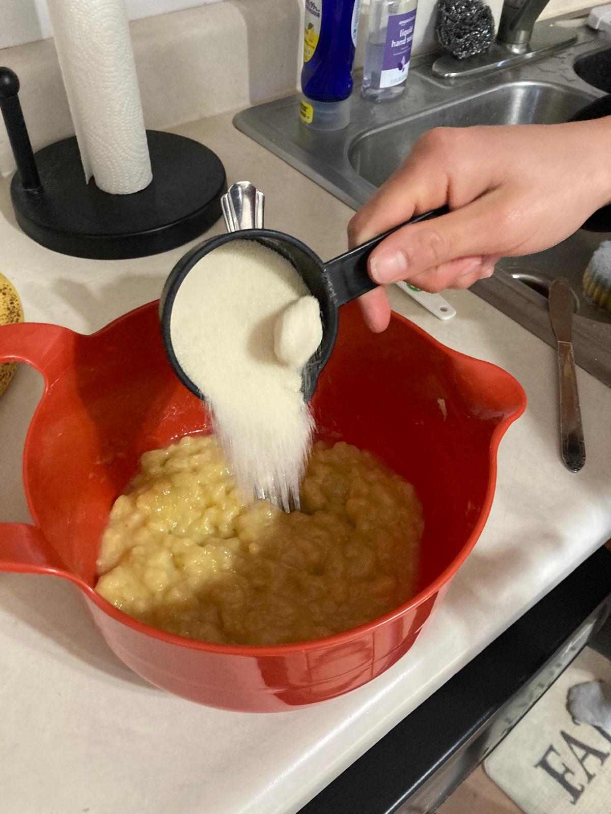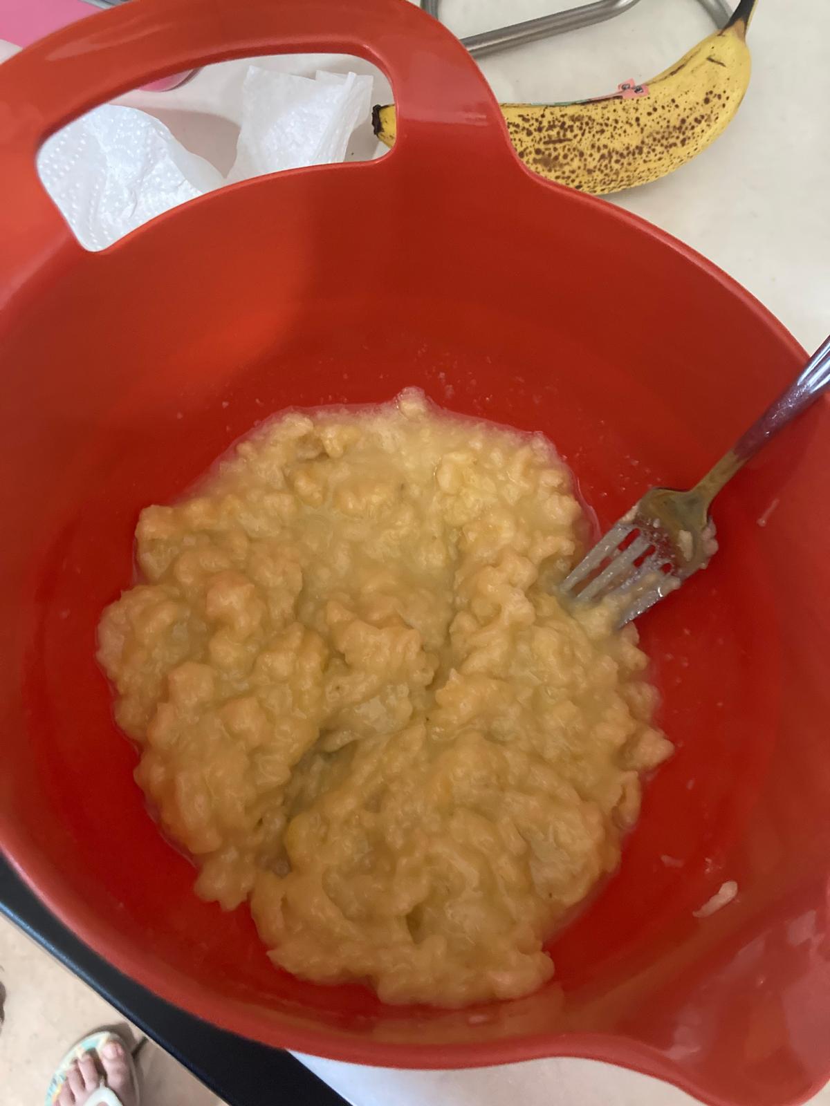 - In the mixing bowl, mash the bananas and add the melted butter. The bananas can be left a little chunky for consistency.
