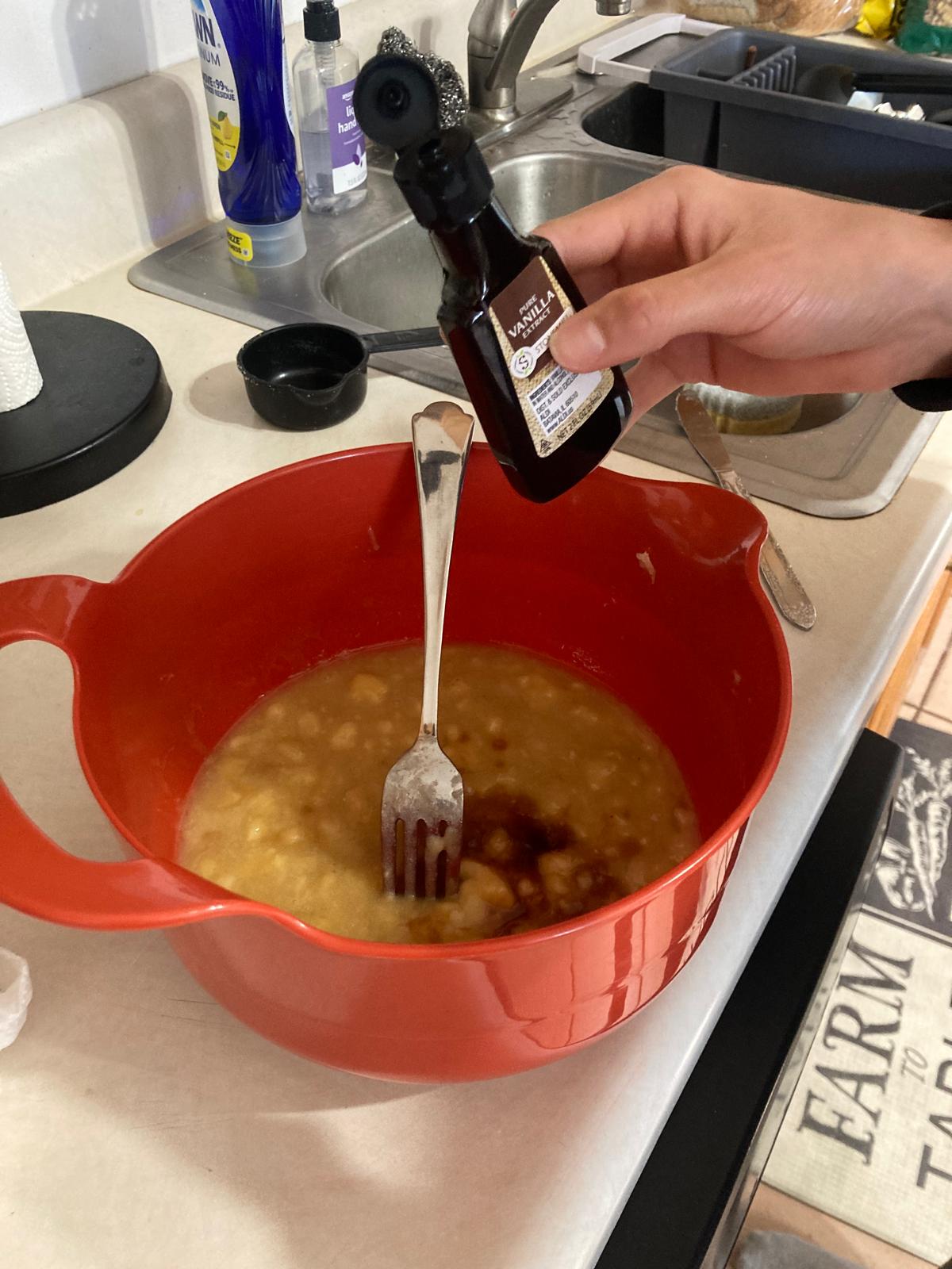 - Add the salt, baking soda, sugar, vanilla extract. Mix as we add each of the ingredients.
