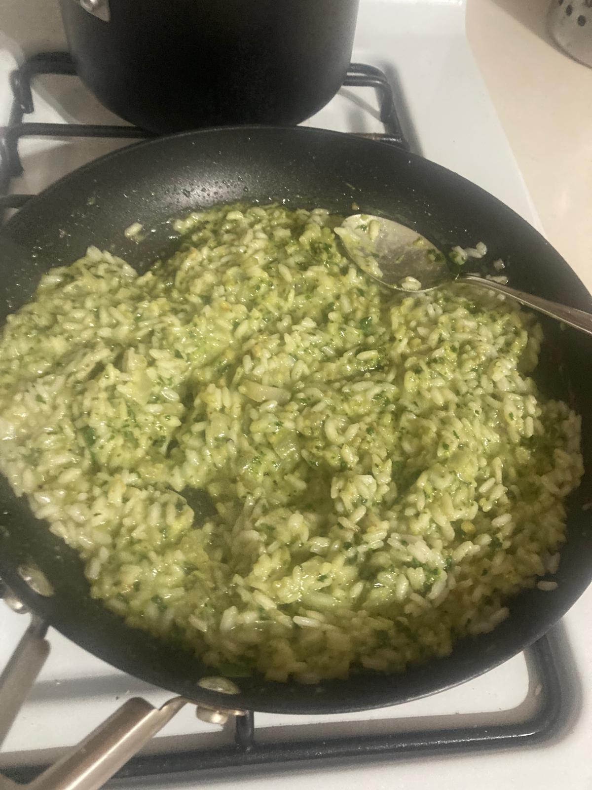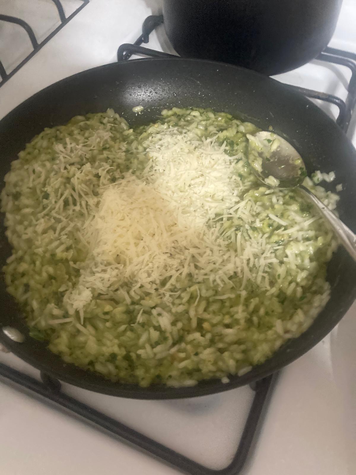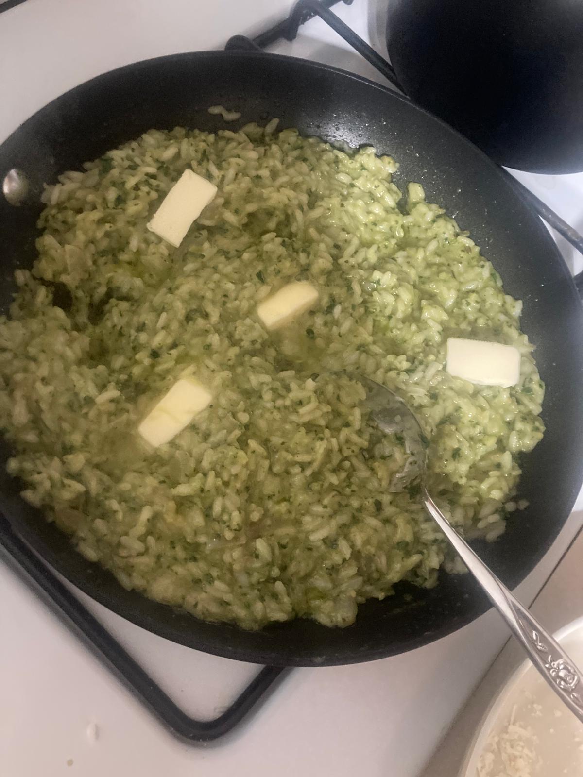 - Cuando el arroz esté cocido, y quedando en él un poco de agua, introducimos la pasta de albahaca y mezclamos. En este momento, añadimos más queso parmesano. Acabamos con un poco de mantequilla, que se derrita por encima. Removemos y servimos.