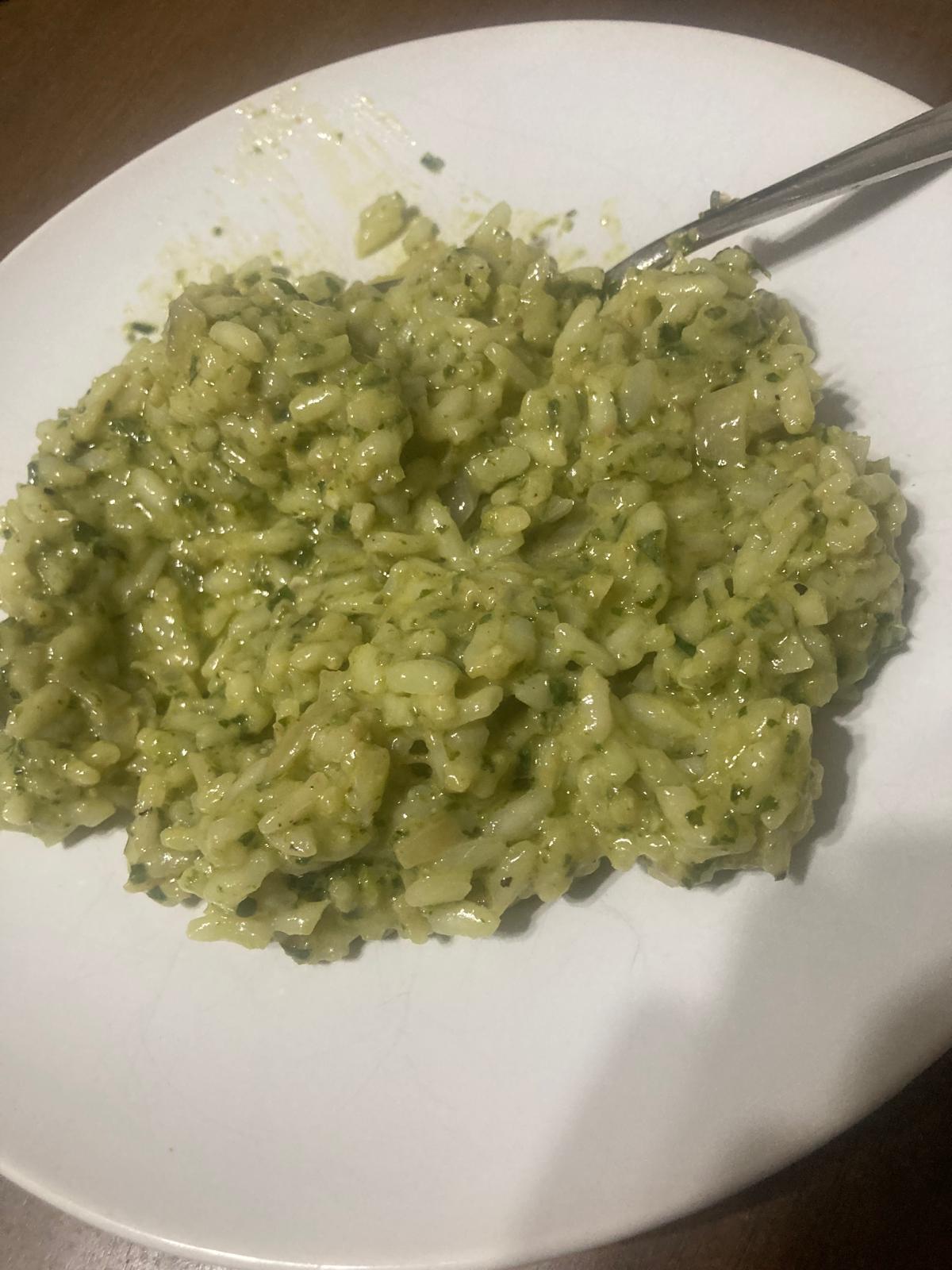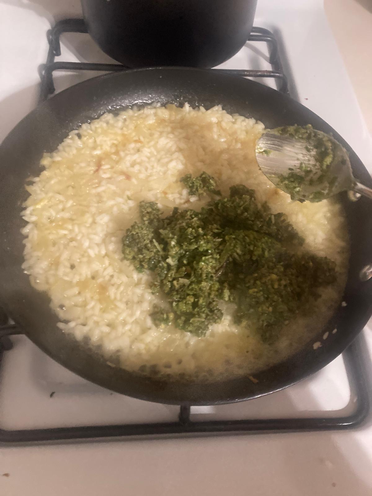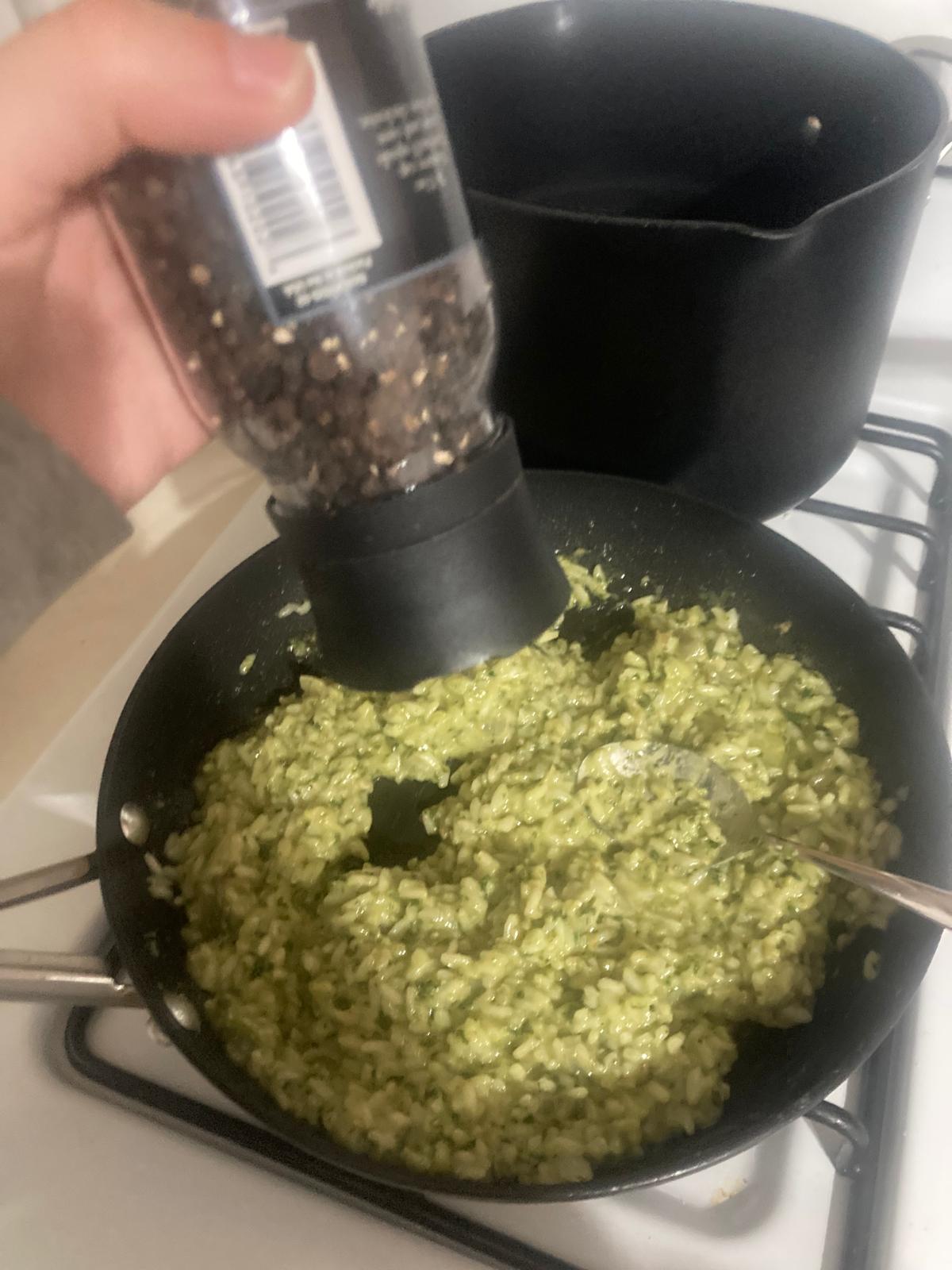 - Cuando el arroz esté cocido, y quedando en él un poco de agua, introducimos la pasta de albahaca y mezclamos. En este momento, añadimos más queso parmesano. Acabamos con un poco de mantequilla, que se derrita por encima. Removemos y servimos.
