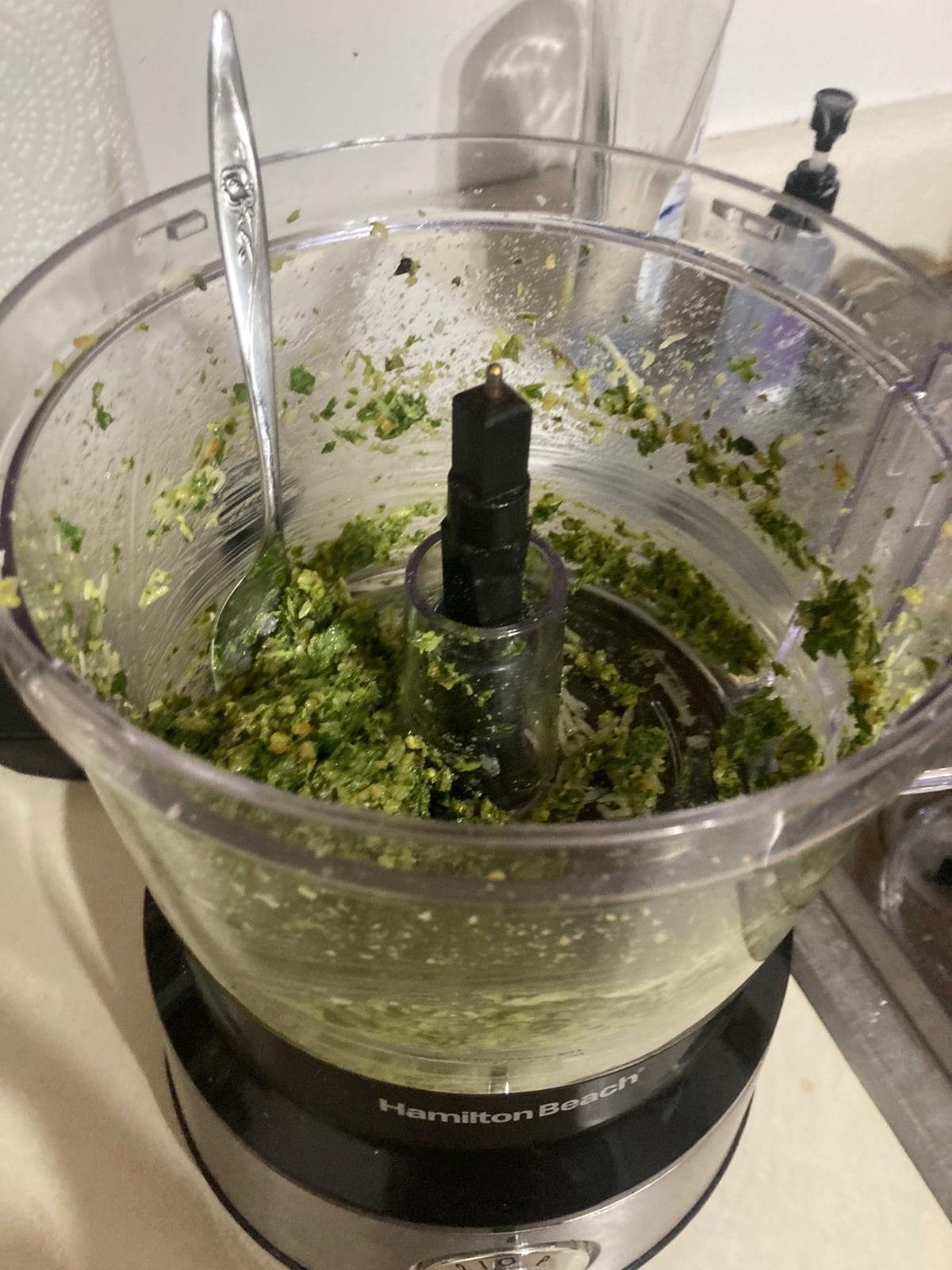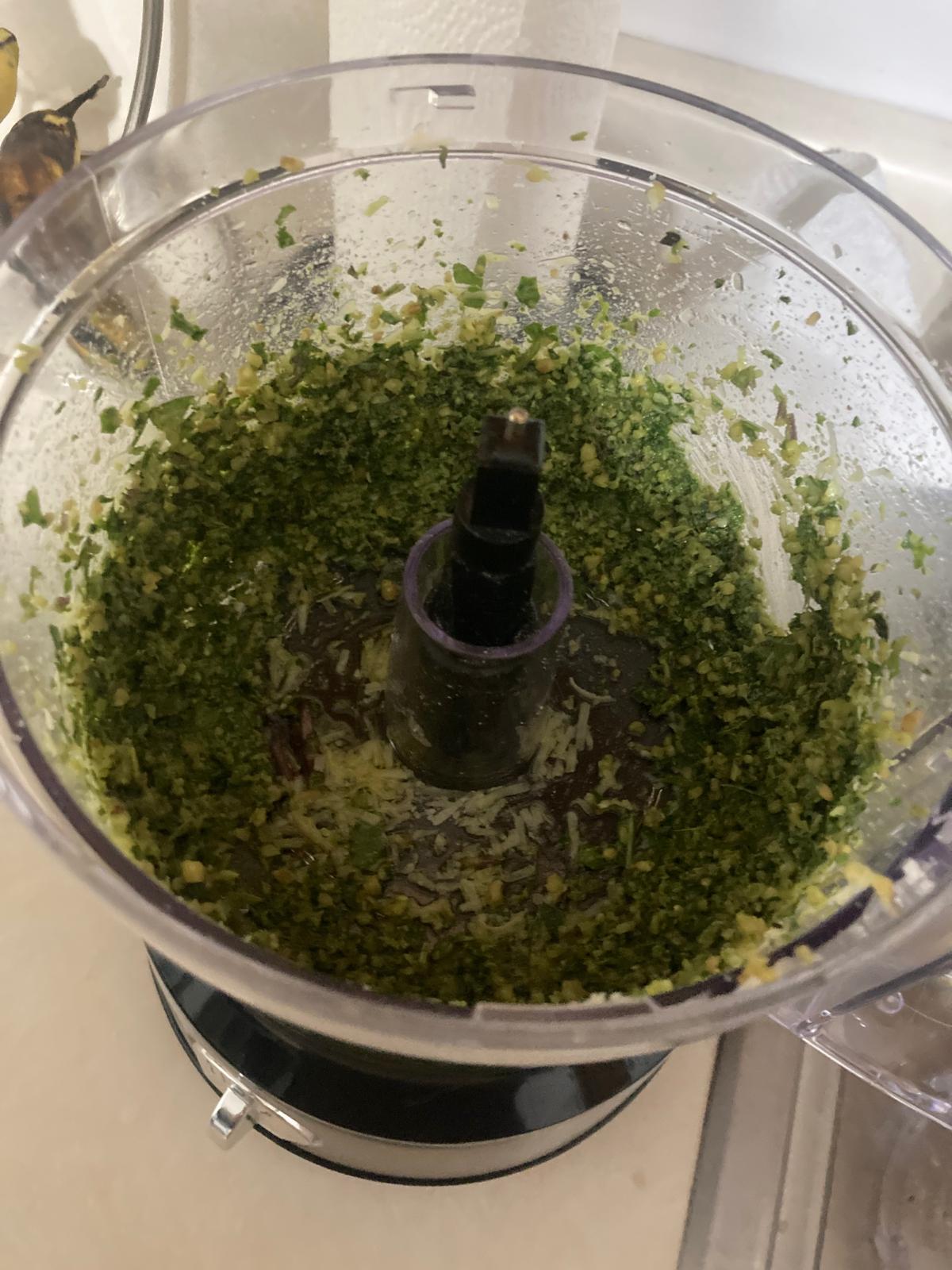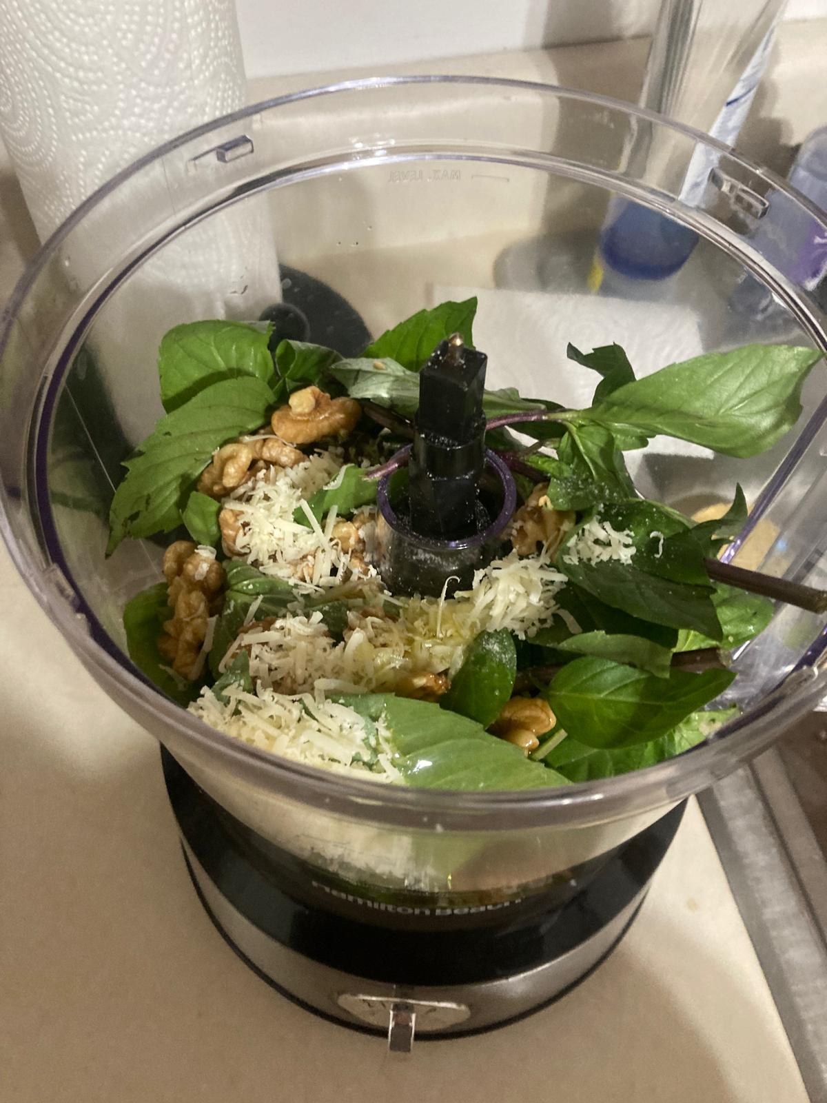 - Triturar la albahaca, nueces, 1 cucharada de parmesano rallado, 2 cucharadas de aceite, y una pizca de sal. Triturar hasta que quede una mezcla cremosa. Añadir más aceite si es necesario.