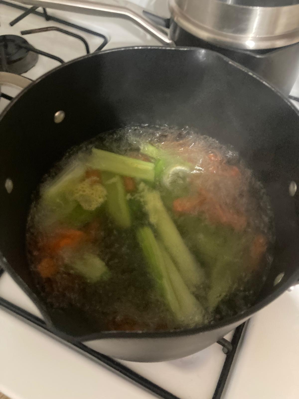 - Preparamos un caldo de verduras: Hervimos agua en la olla, echamos un poco de sal, pelamos y cortamos en trozos grandes la zanahoria y el apio, y los ponemos a hervir un buen rato hasta que el agua coja los sabores, unos 40min a 1h a fuego lento.