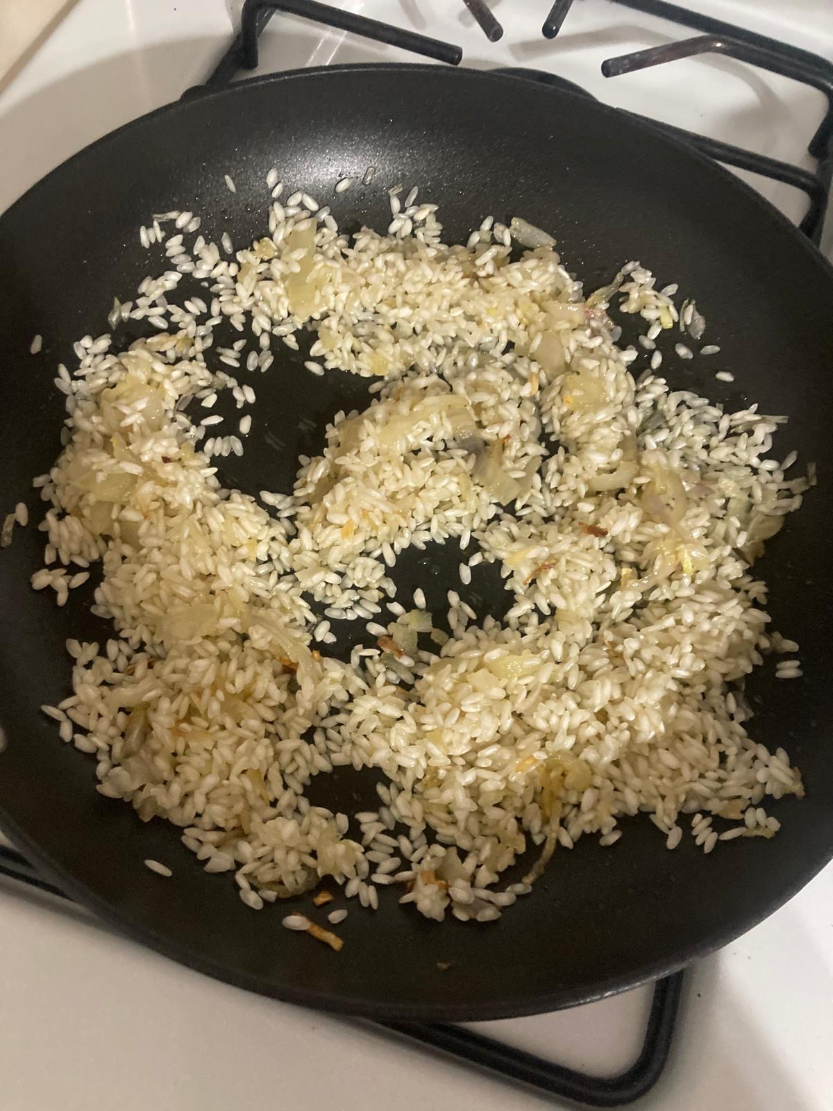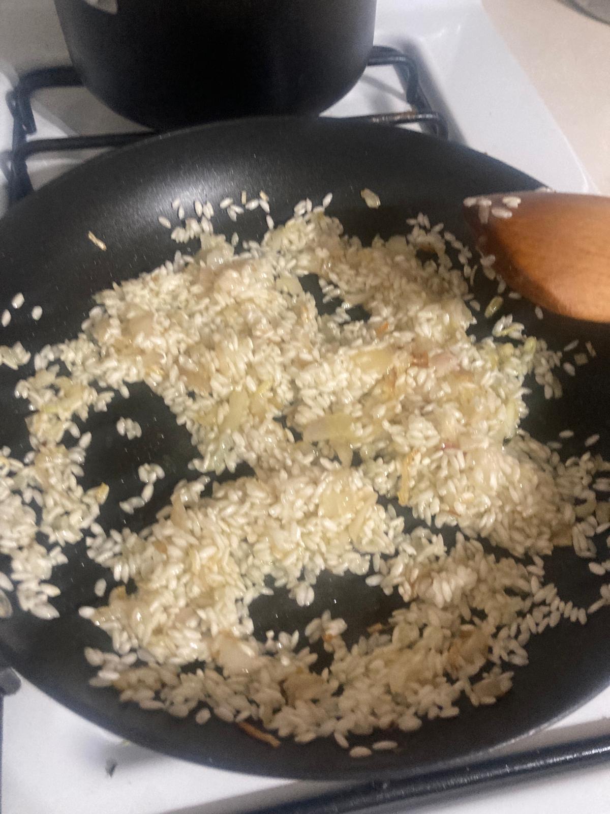 - En una sartén, echamos un poco de aceite y salteamos la chalota. Echamos el arroz y lo tostamos un poco.