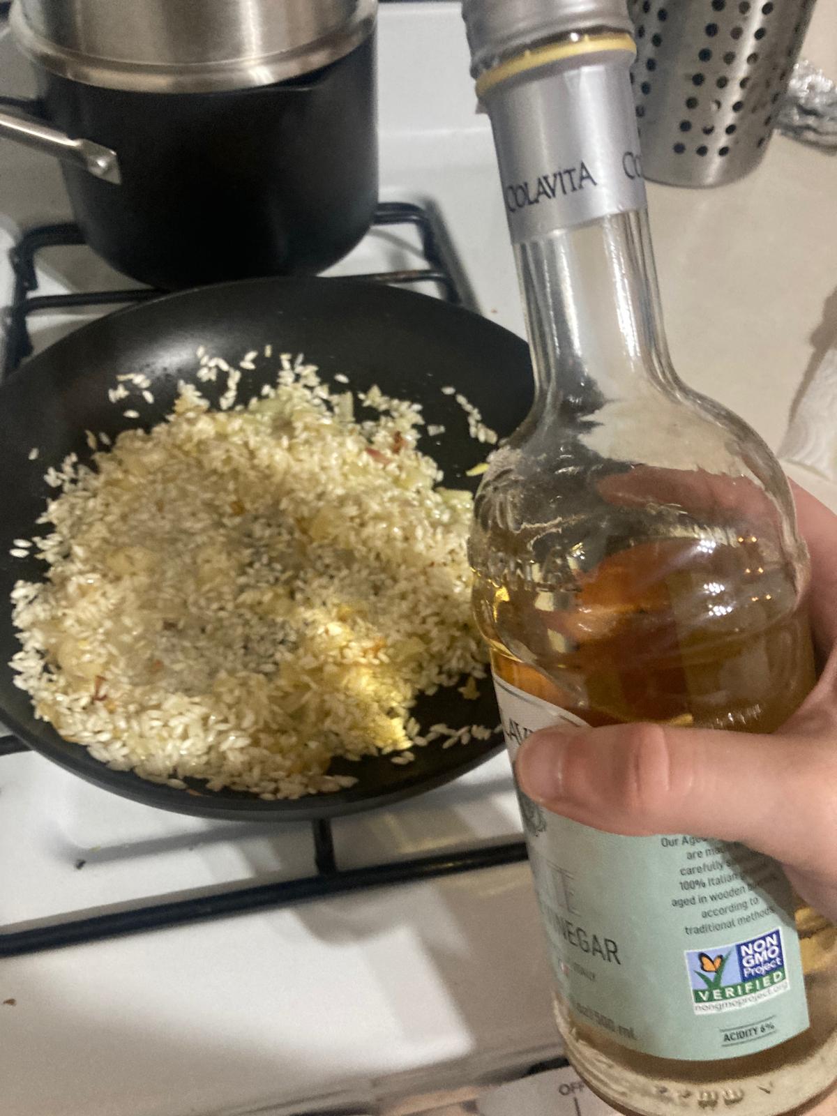 - Echamos la taza de vino o el chorro de vinagre y dejamos que el alcohol se evapore. Añadimos poco a poco el caldo de verduras y que el arroz de vaya haciendo. Salamos.