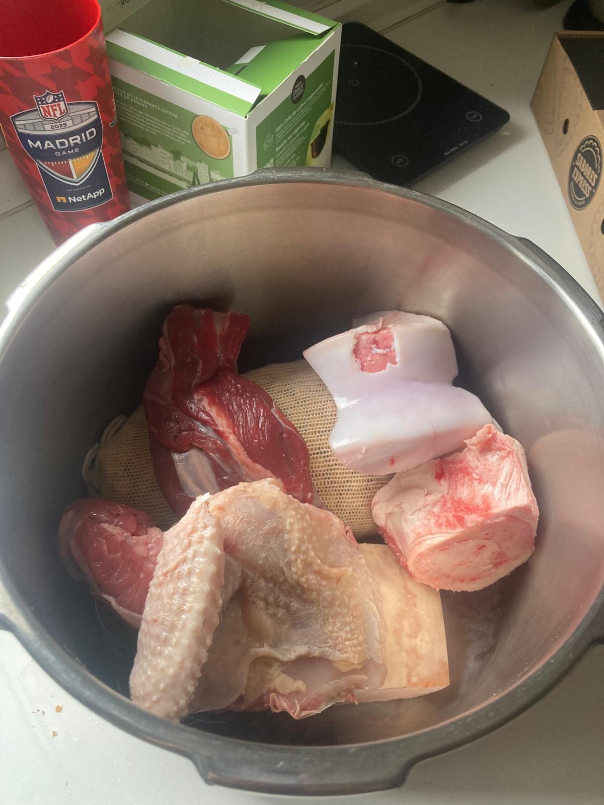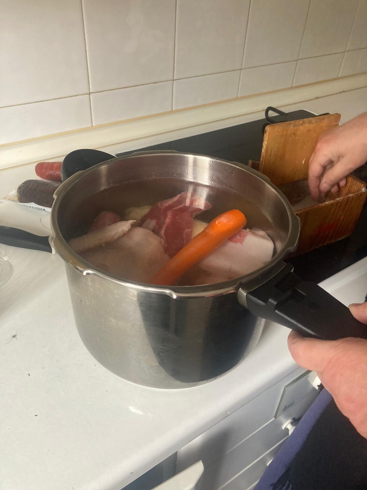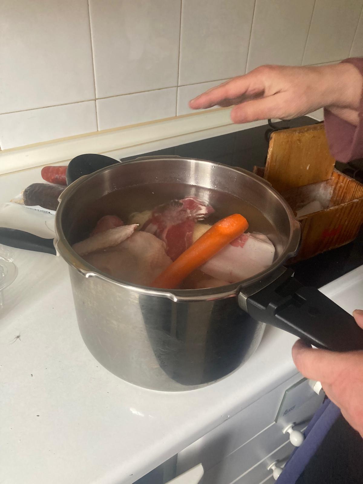 - Echamos 2 puádos de sal y lo ponemos en la olla exprés a fuego alto a 2atm. Cuando empieze a echar vapor, bajamos a fuego bajo y lo dejamos cocinar unos 40min.