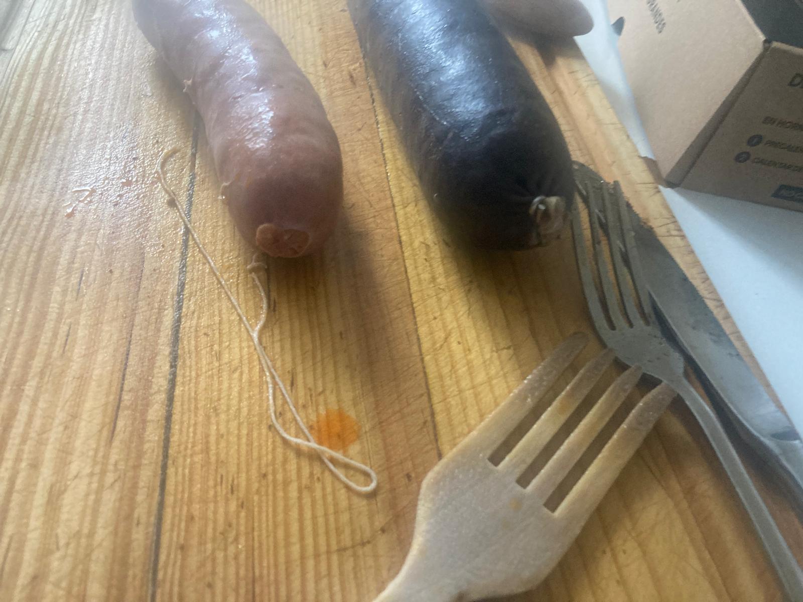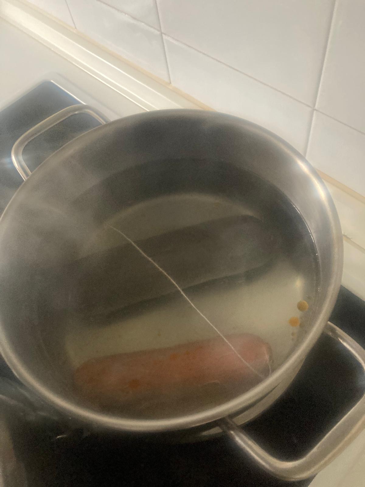 - Cuando queden unos 20 minutos para que se terminen de hacer los garbanzos, heremos el chorizo y la morcilla. Primero ponemos a hervir agua. Punzamos el chorizo y la morcilla con un tenedor. Cuando el agua esté hirviendo, los cocemos unos 15min, hasta que esté la piel más blanca. Para comprobar que están cocinados, los podemos pinchar y ver si sale limpio el punzón.