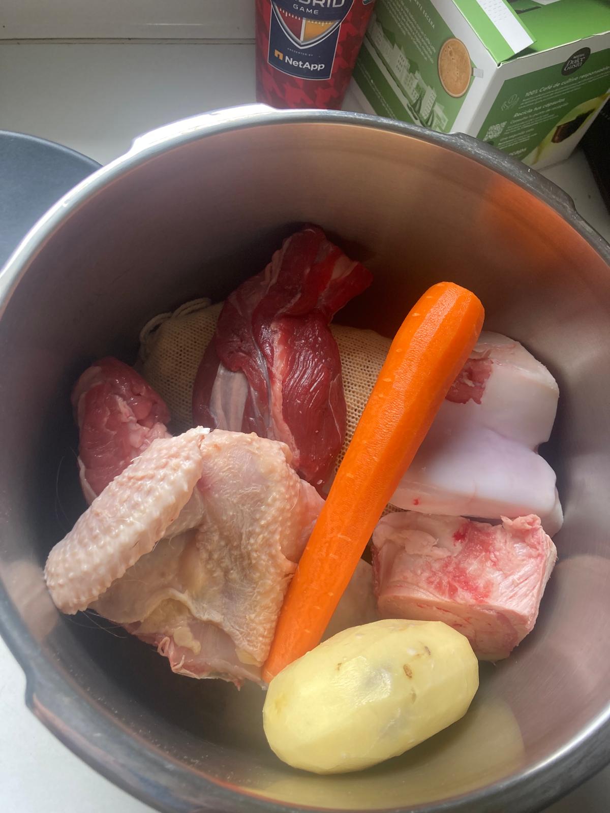 - Pelamos la zanahoria y la patata. Introducimos todos los ingredientes excepto el chorizo y la morcilla en la olla y los cubrimos bien de agua, de ahí sacaremos la sopa.