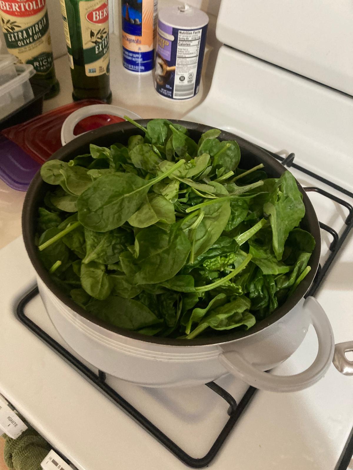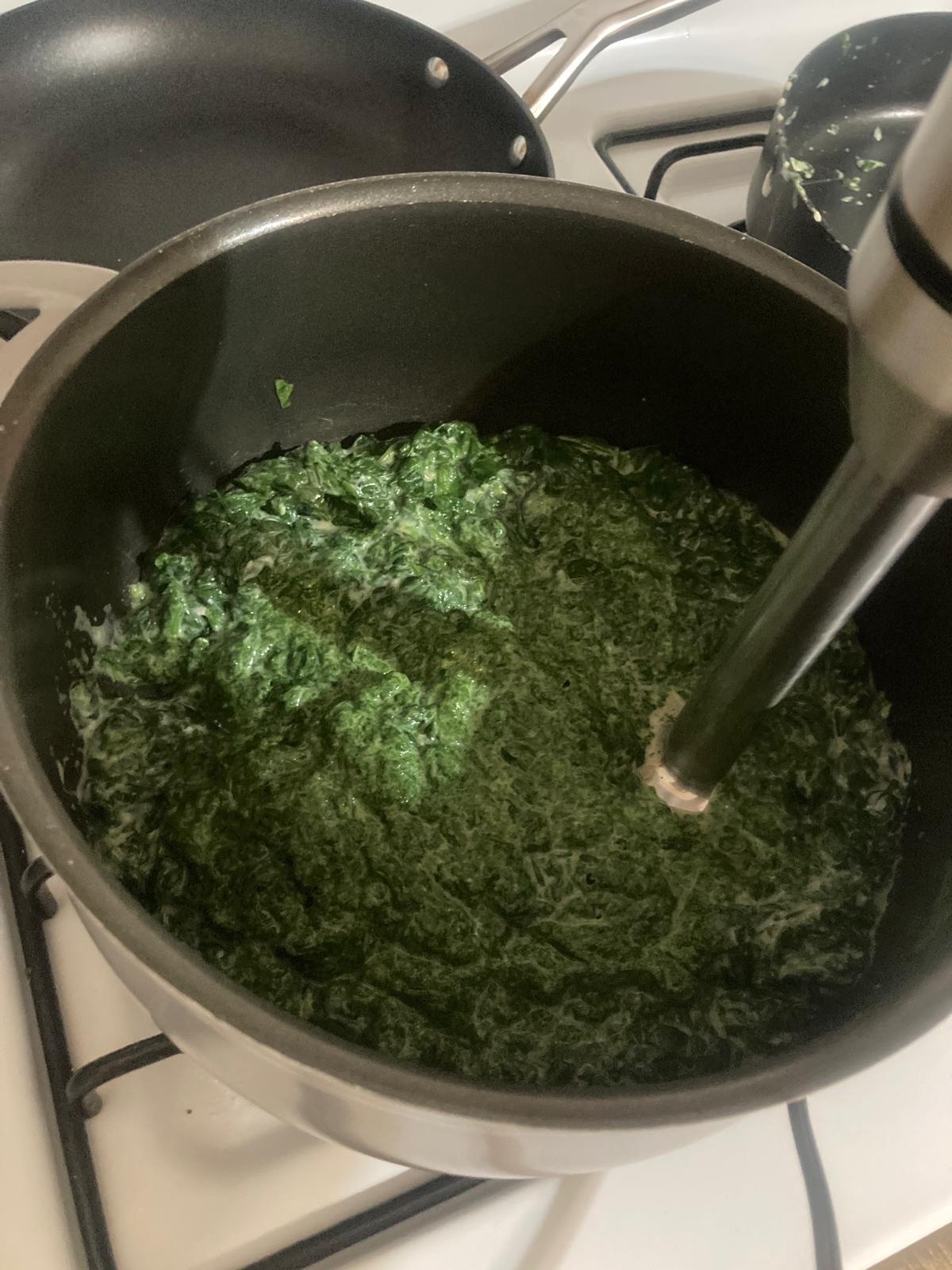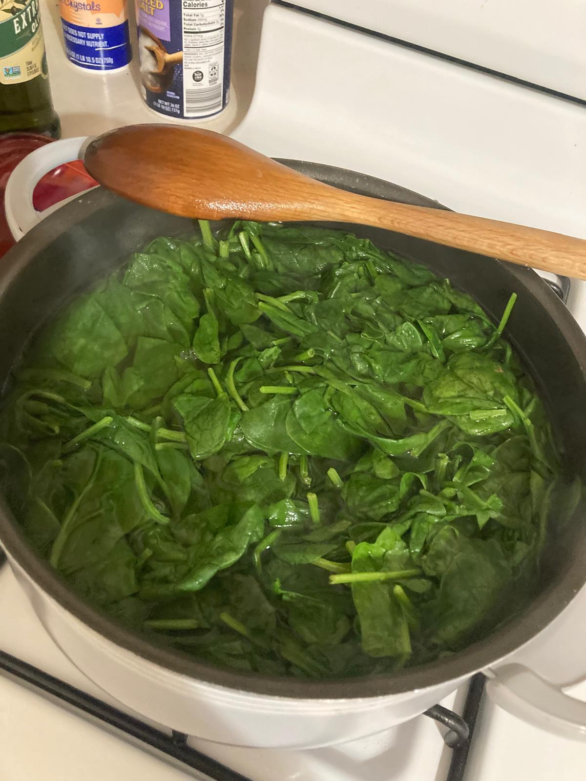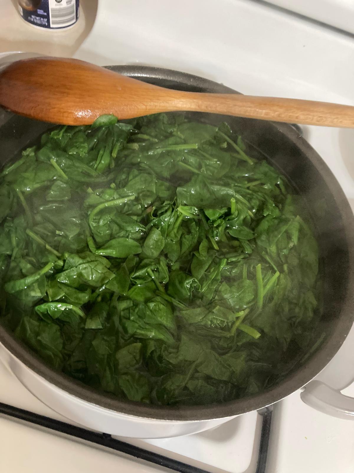 - En una olla, hervir agua y echar las espinacas para cocerlas.