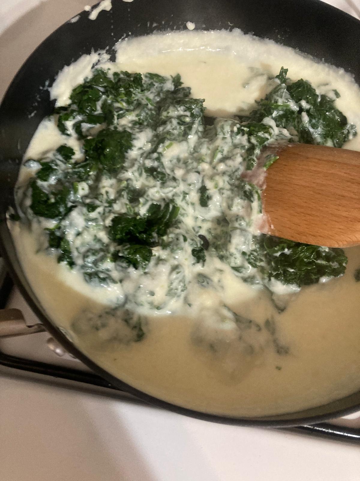 - Vamos aƱadiendo las espinacas en la bechamel poco a poco y removemos muy bien.