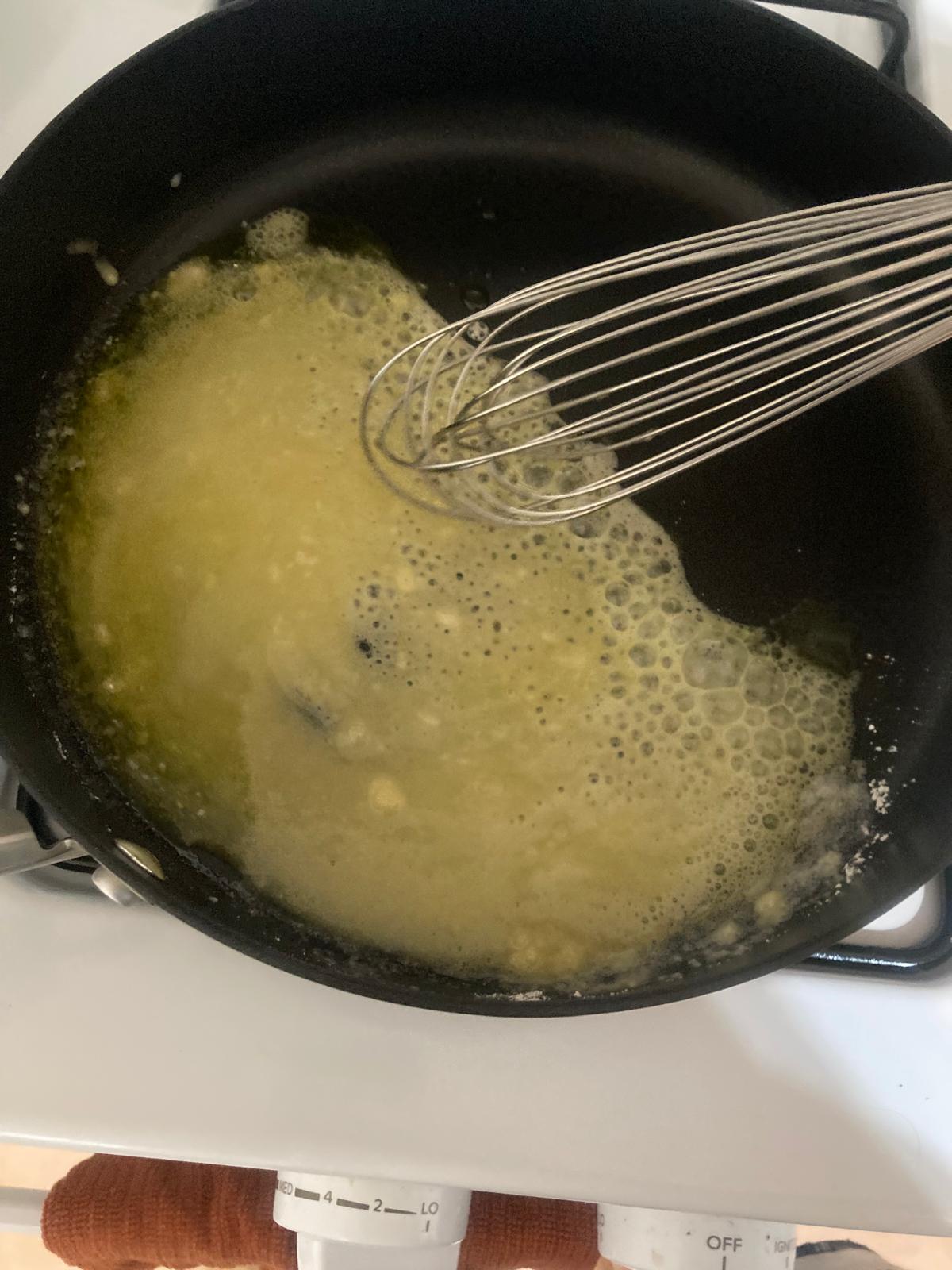 - Hacemos la bechamel: En una sart'en, ponemos a derretir la mantequilla con el aceite. A;adimos la harina, damos unas vueltas hasta que se forme una masa, y vamos incorporando poco a poco la leche y removiendo hasta que se quede la consistencia que queramos y no tenga grumos. Salamos ligeramente.