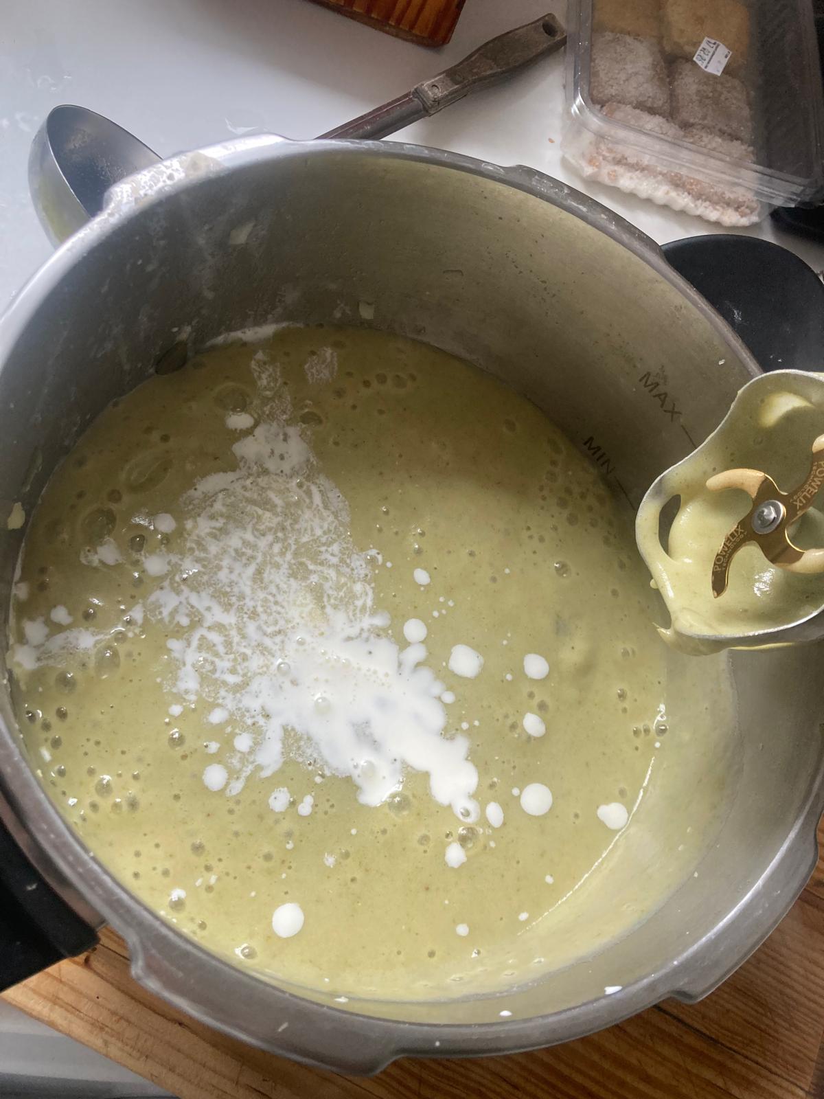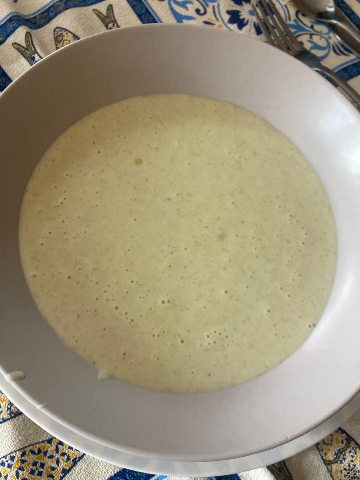 - Trituramos con una batidore. Se quedará una pasta espesa. Vamos echando la nata poco a poco hasta que quede el espesor que queramos, no tiene que ser muy líquida. Rectificamos la sal si es necesario.
