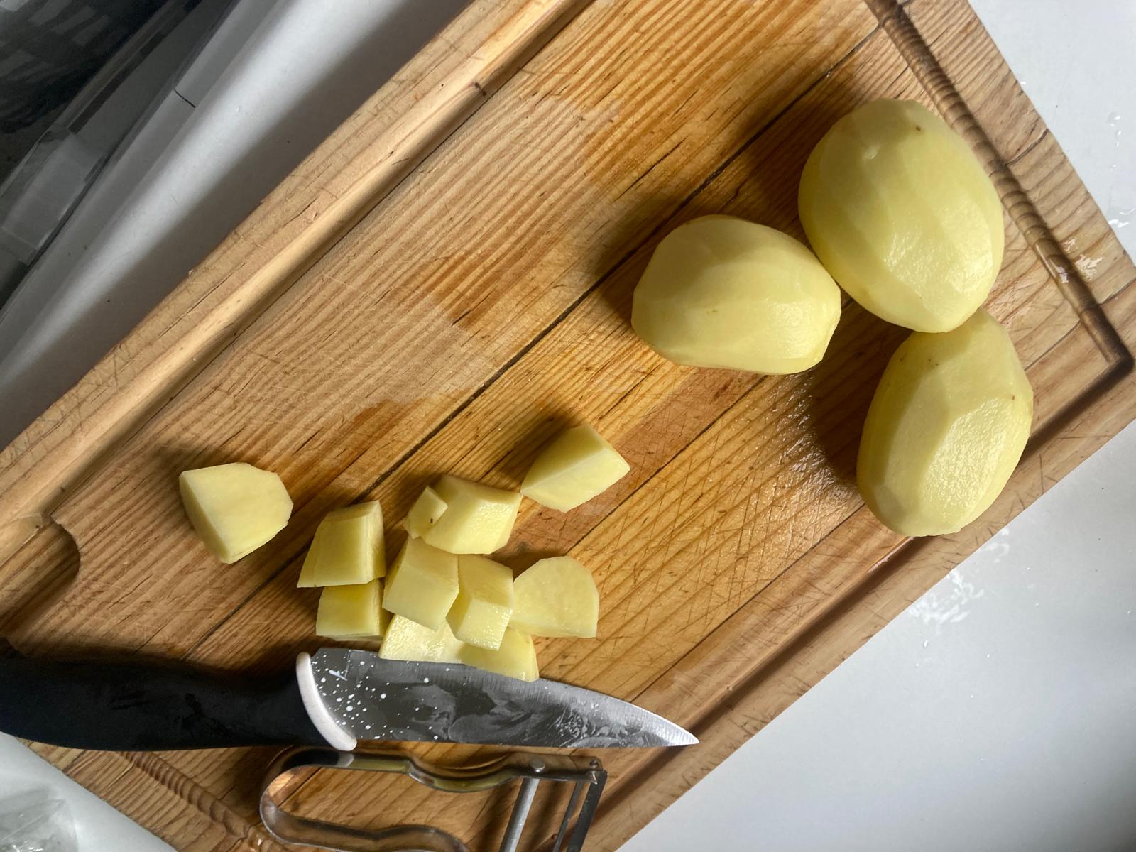 - Lavamos, pelamos y cortamos en trozos las patatas.