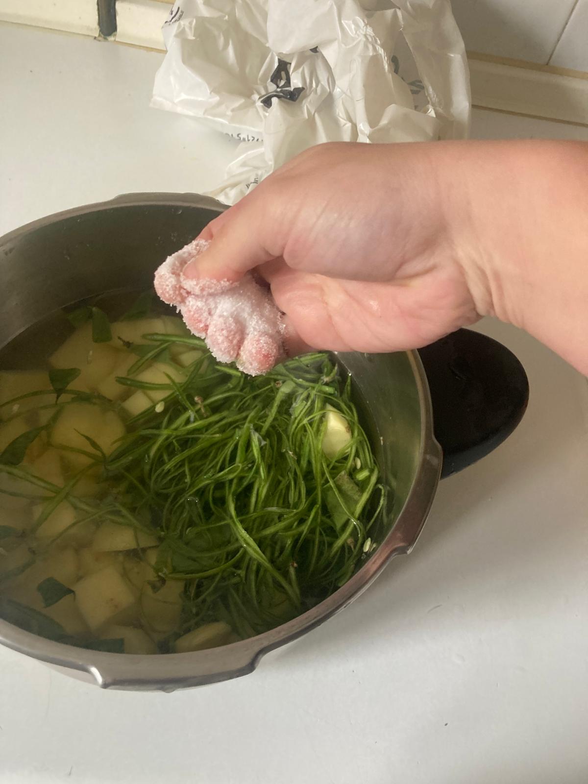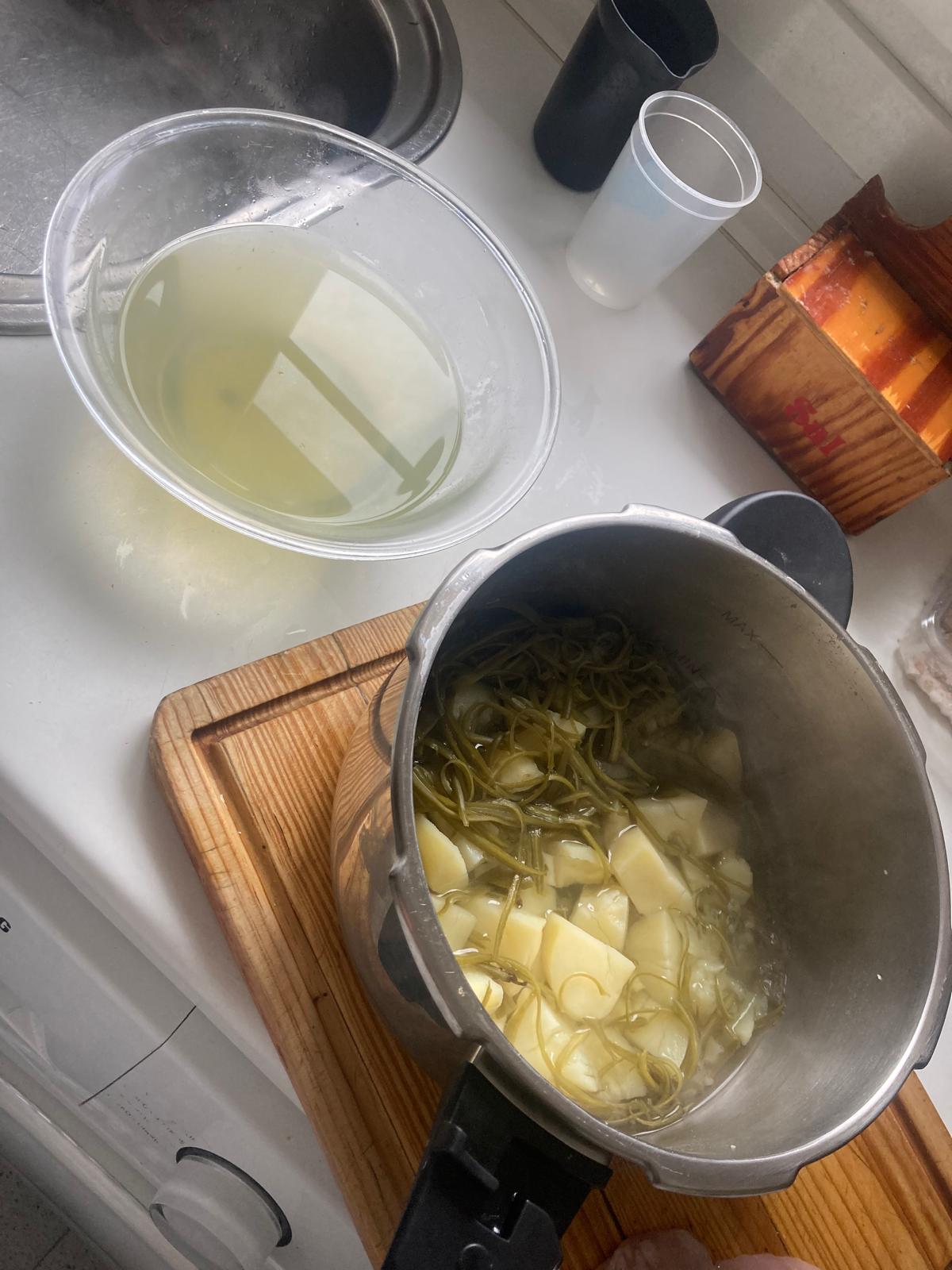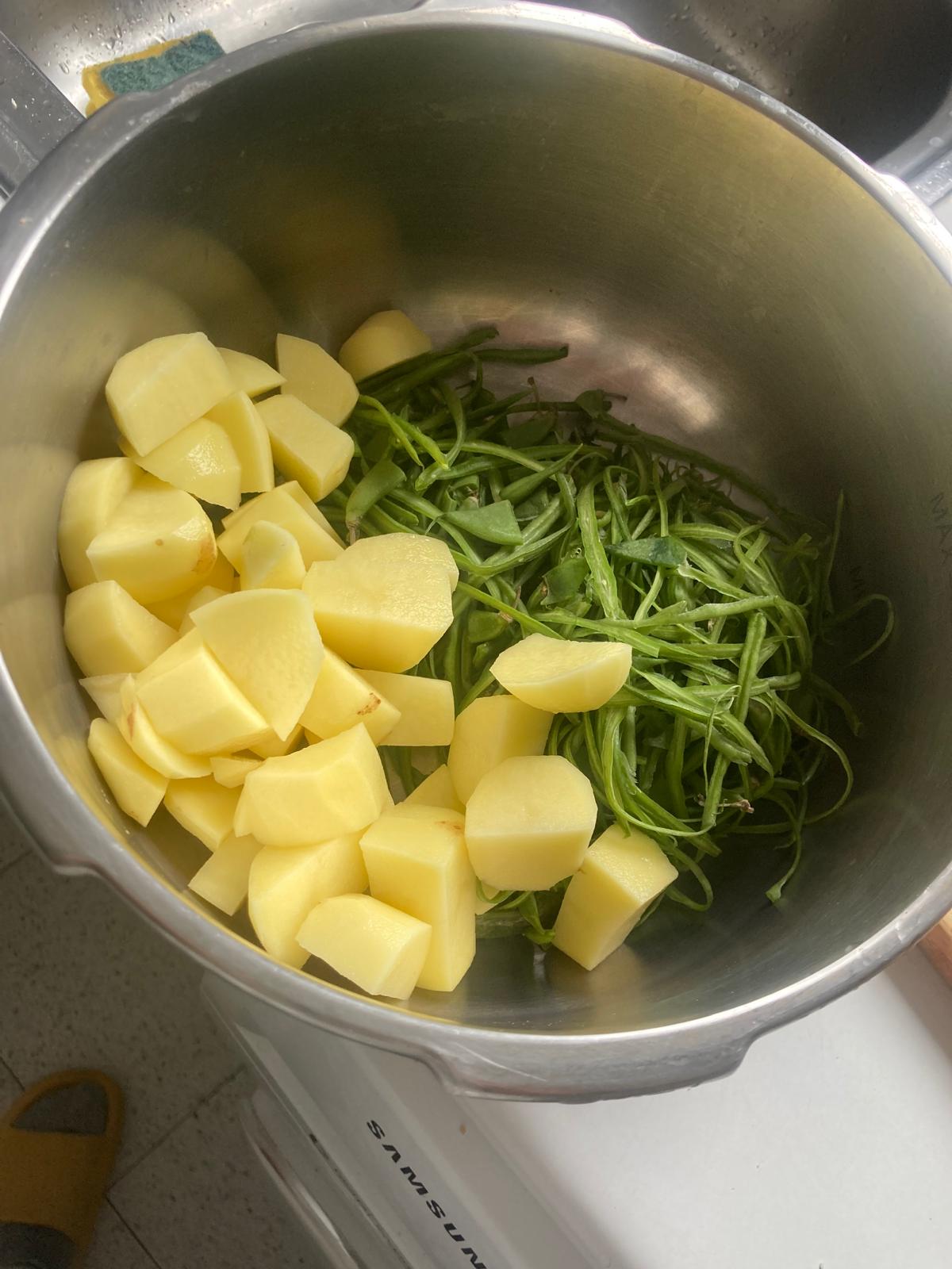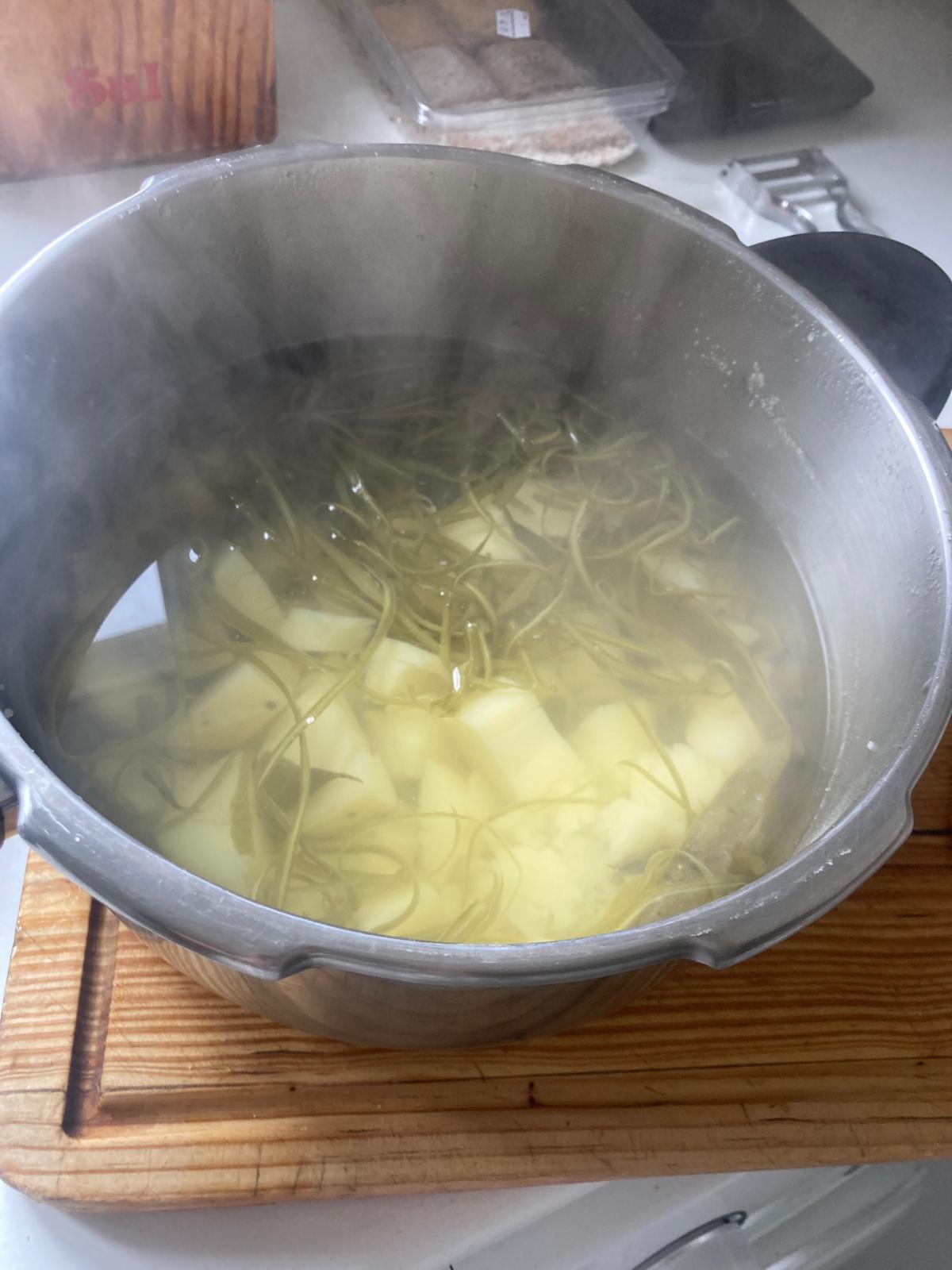 - Meter las peladuras de judía y las patatas en la olla exprés, cubrir con agua, y echar dos puñados de sal.