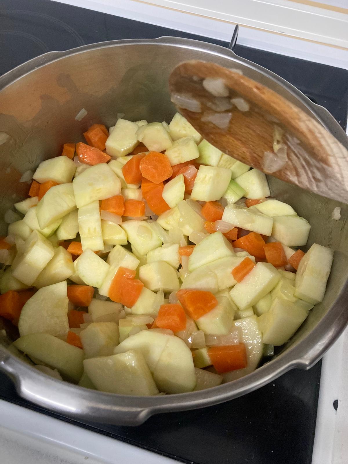 - Poner a calentar el fondo de una olla con aceite de oliva. Meter la cebolleta con un poquito de sal. Cuando esté traslúcida, meter la zanahoria y el calabacín con otro poco de sal y remover un rato.