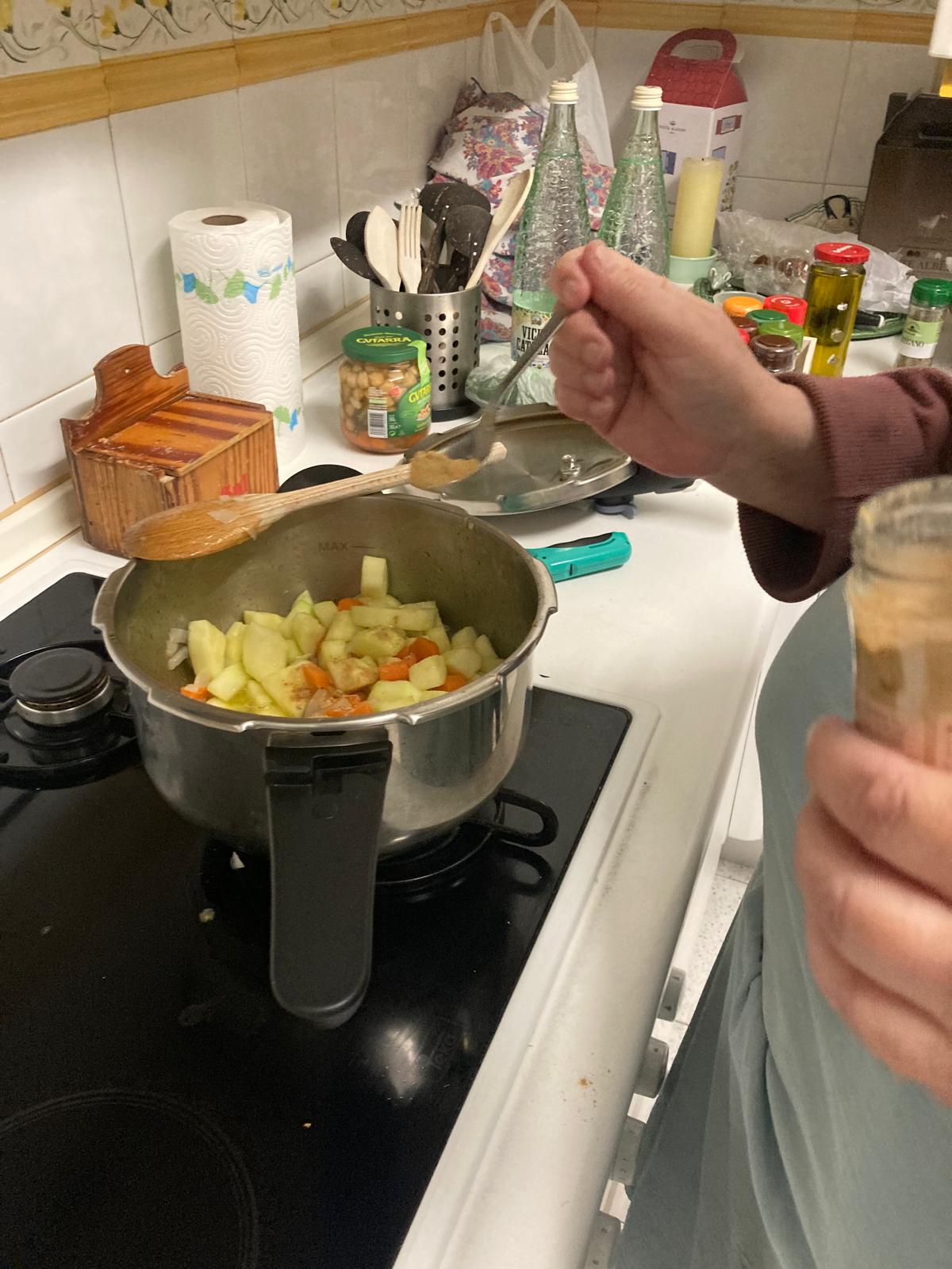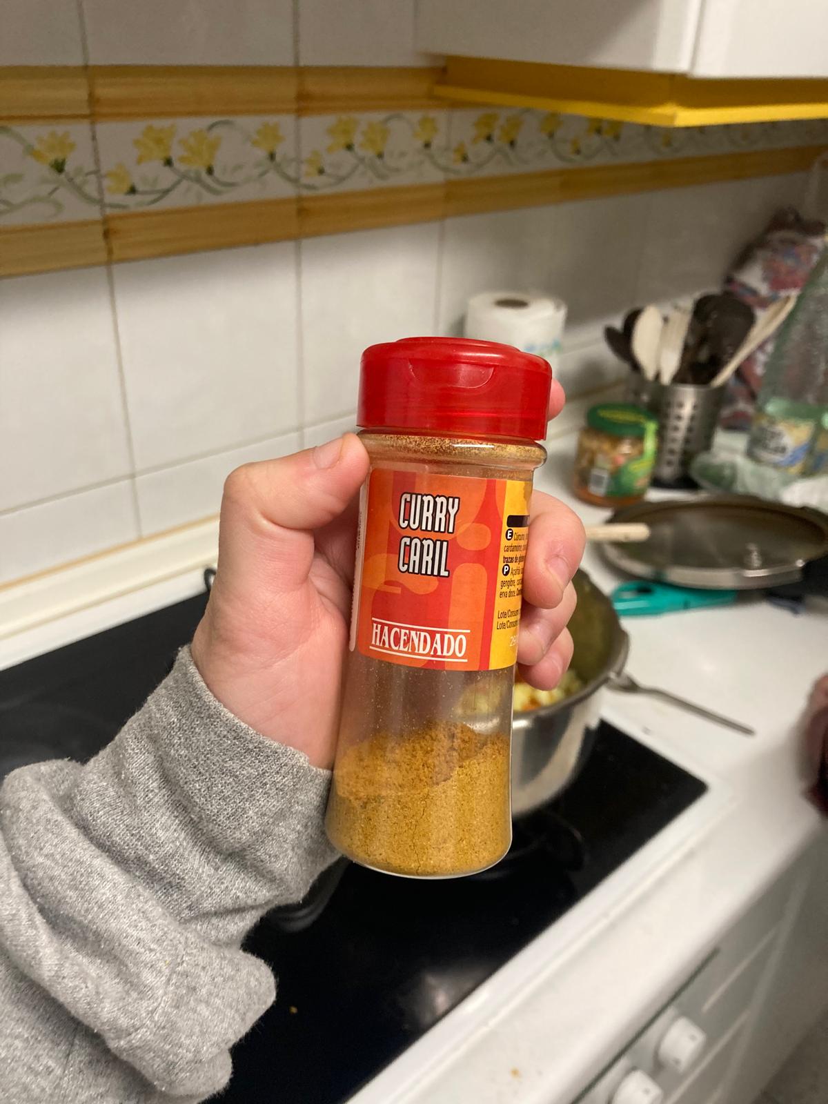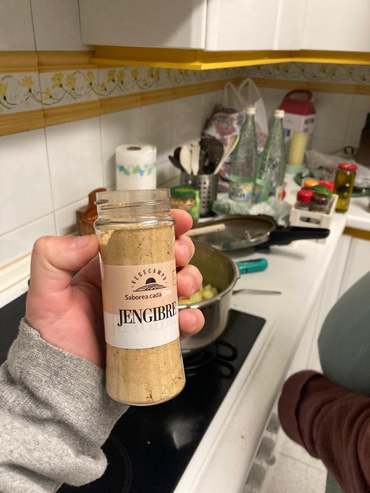 - Cuando la verdura empiece a dorarse, anadimos el jengibre molido, comino, y curry.