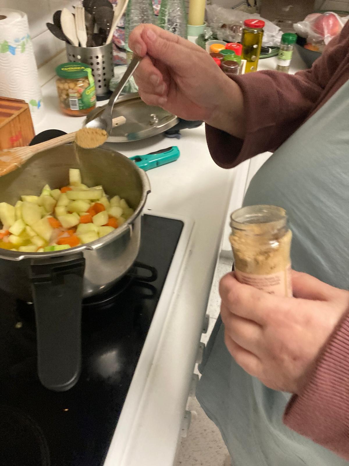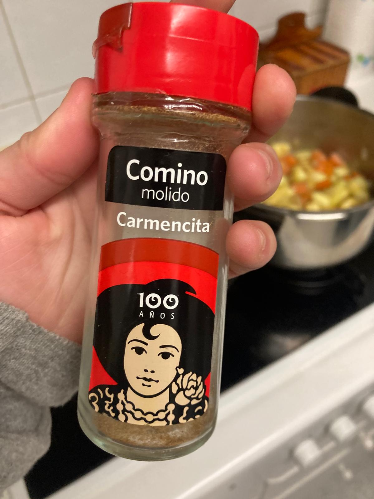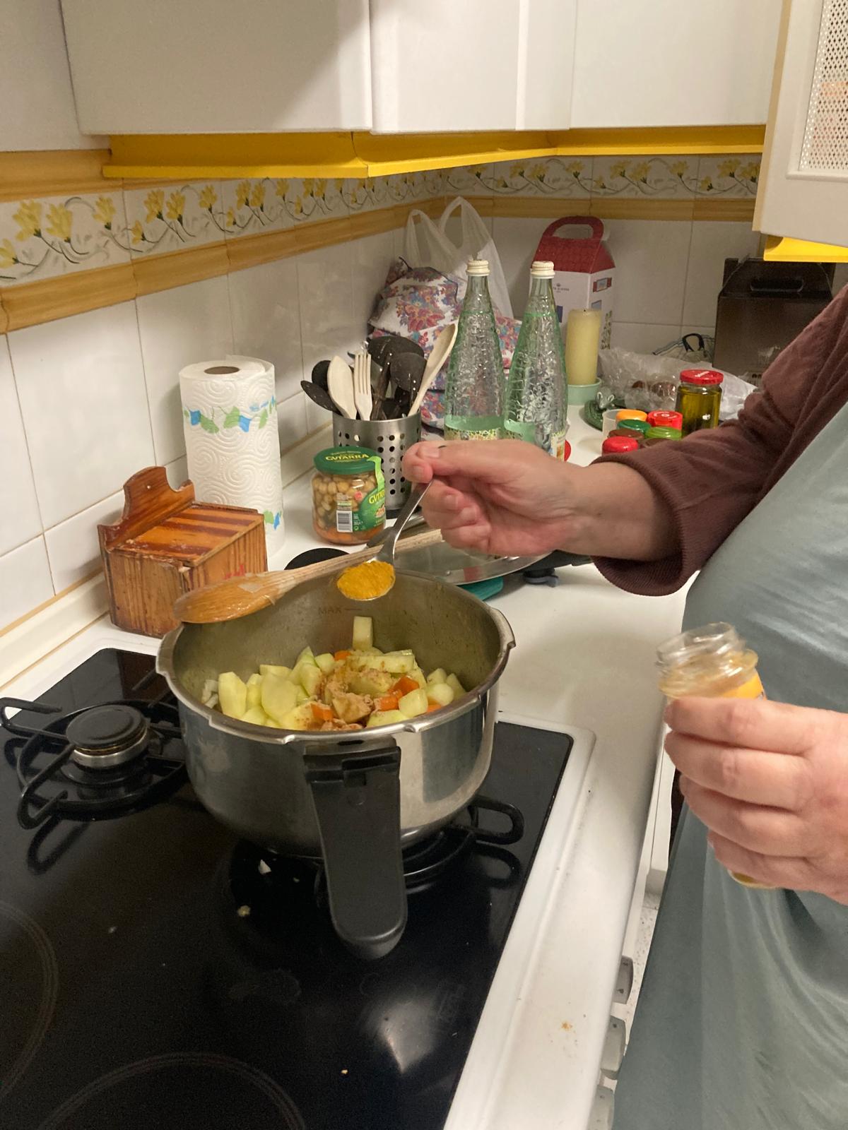 - Cuando la verdura empiece a dorarse, anadimos el jengibre molido, comino, y curry.