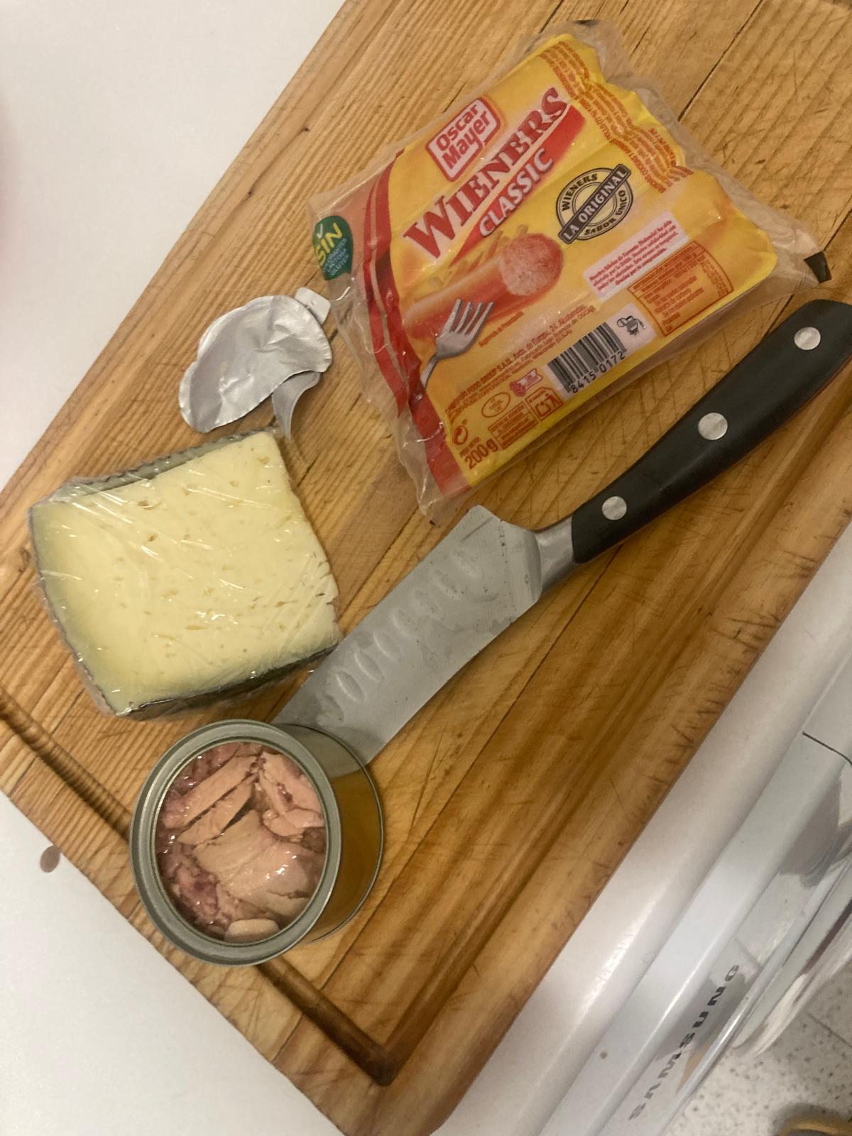 - Mientras tanto, cortamos queso y las salchichas.