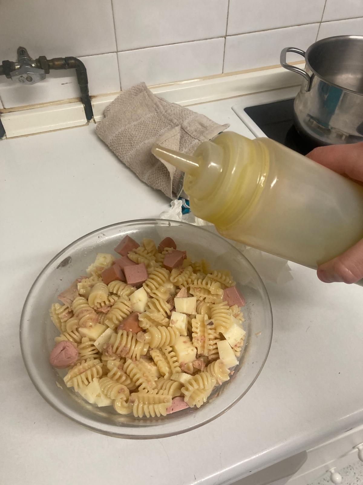 - Cuando la pasta esté hecha, la colamos y ponemos en un bol. Añadimos los trozos de queso y salchichas, el atún (con el aceite que lleva) y por último un buen chorro de aceite.