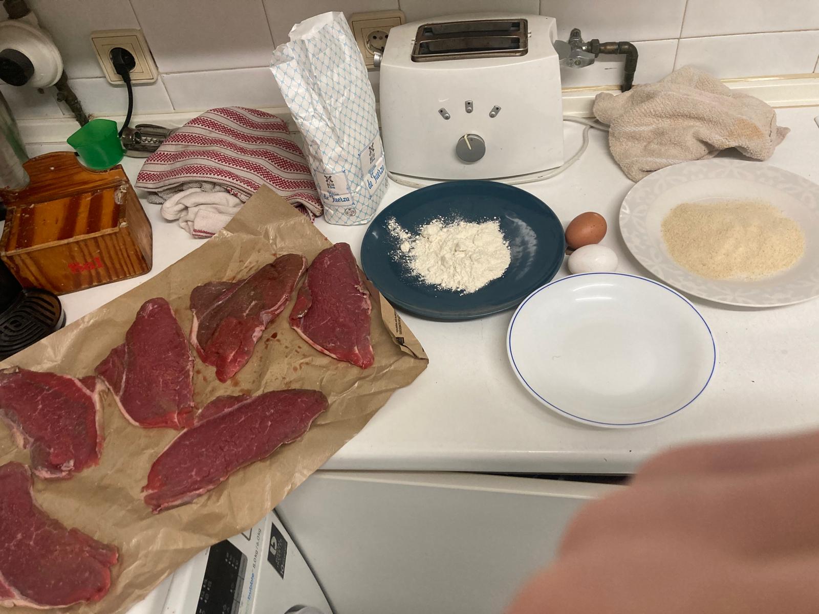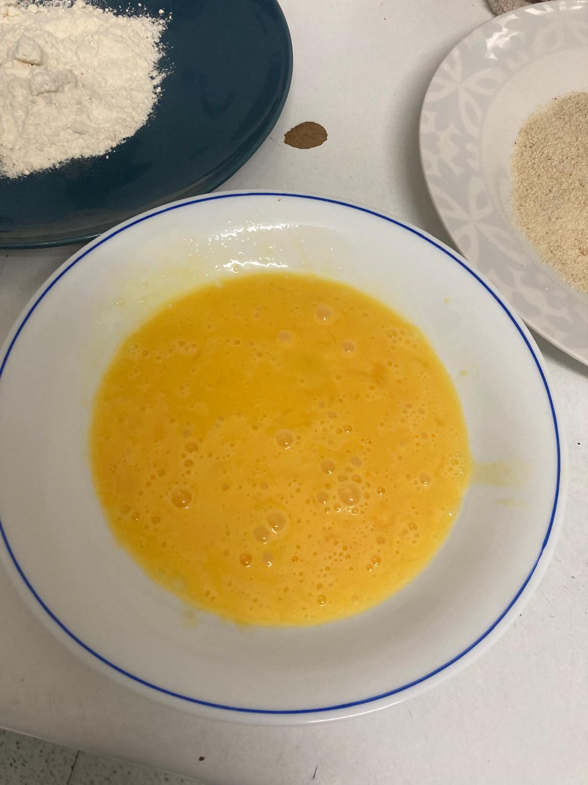 - Cubrir los filetes en harina, después huevo, y por último el pan rallado, en ese orden.