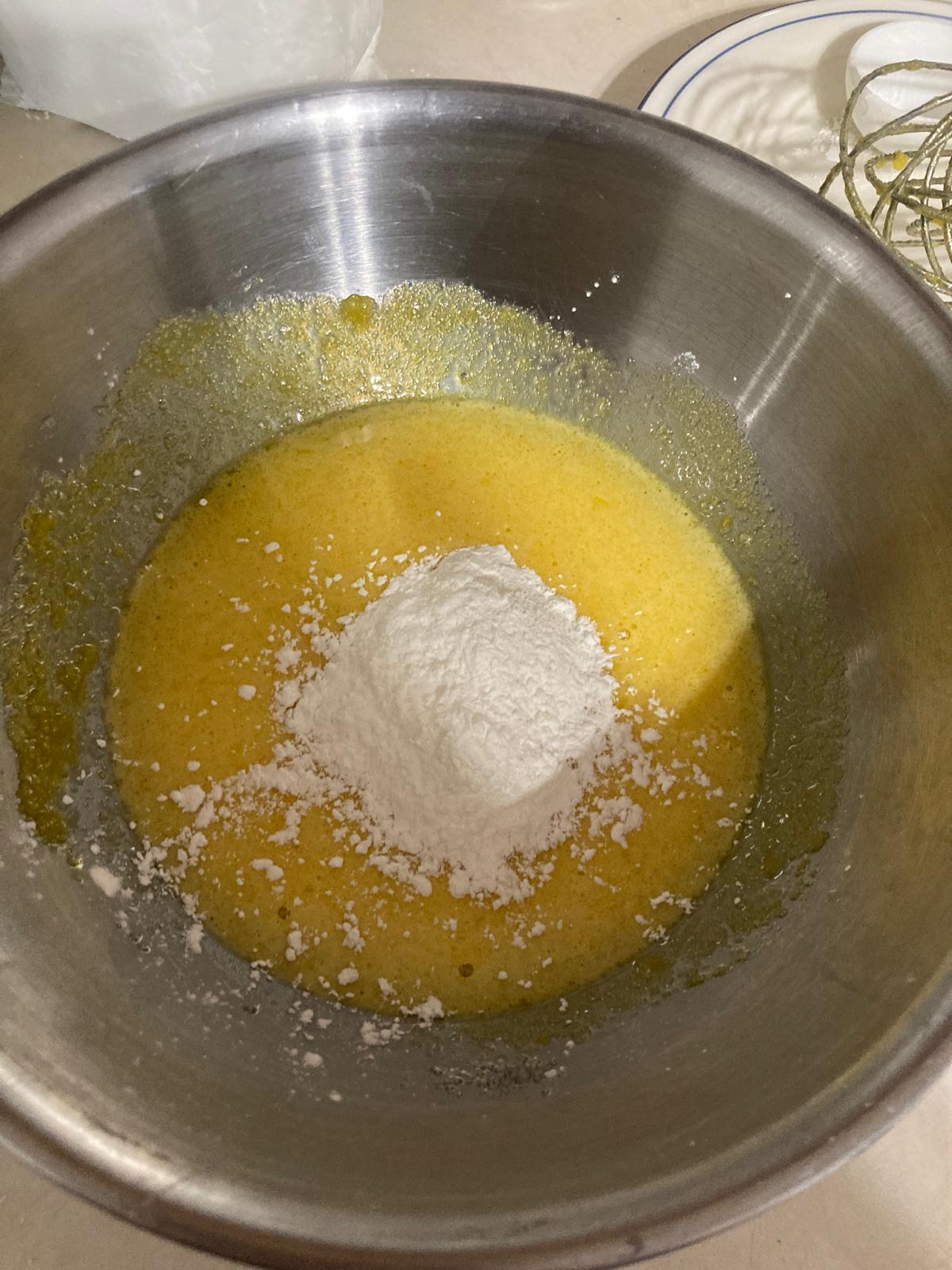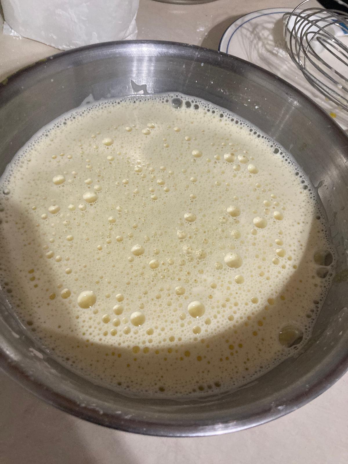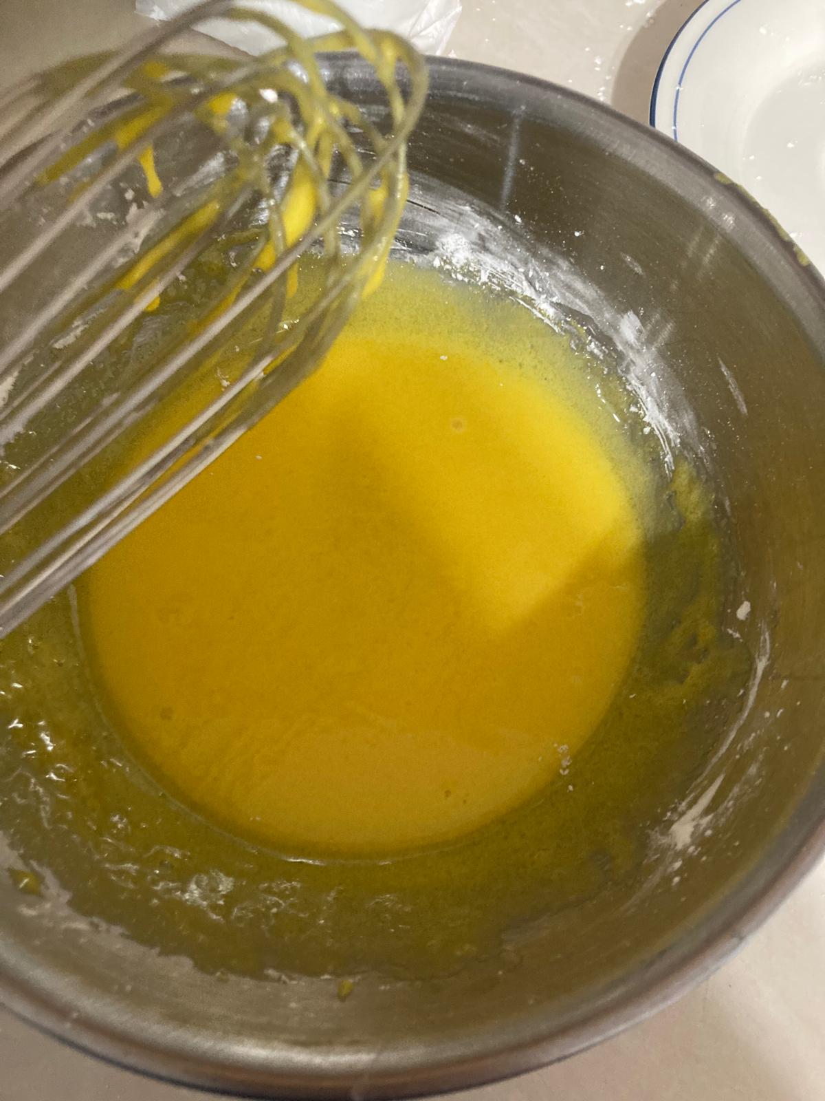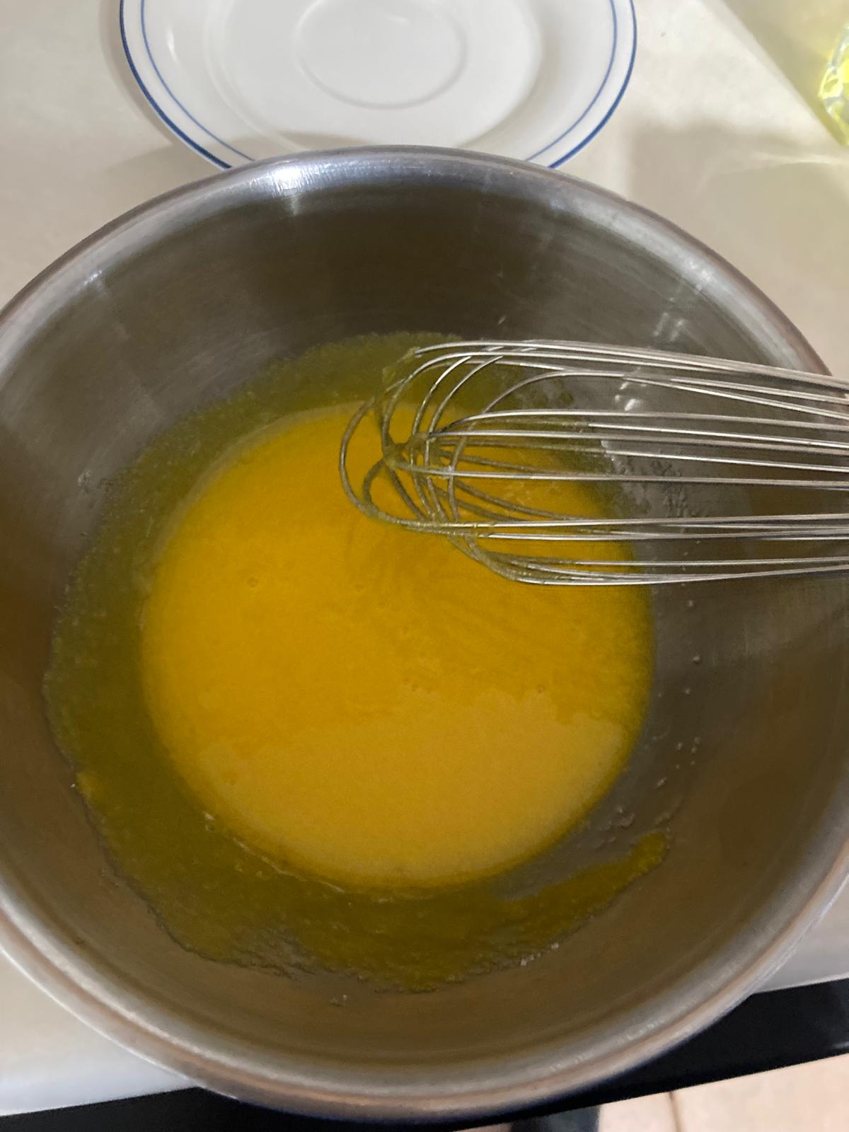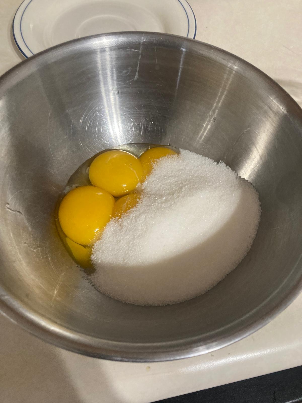 - Mezclamos las yemas con el azúcar y batimos con unas varillas. Añadimos la maizena y batimos bien. Echamos poco a poco la leche previamente colada mientras que mezclamos con las varillas.