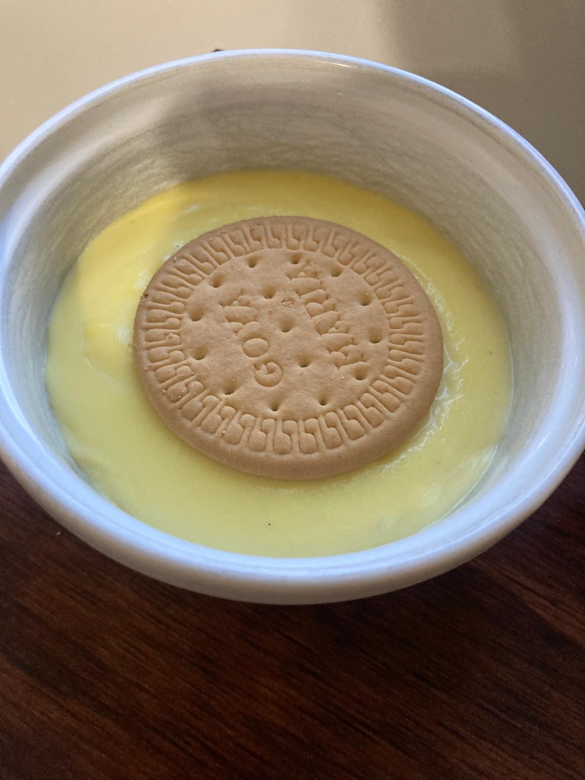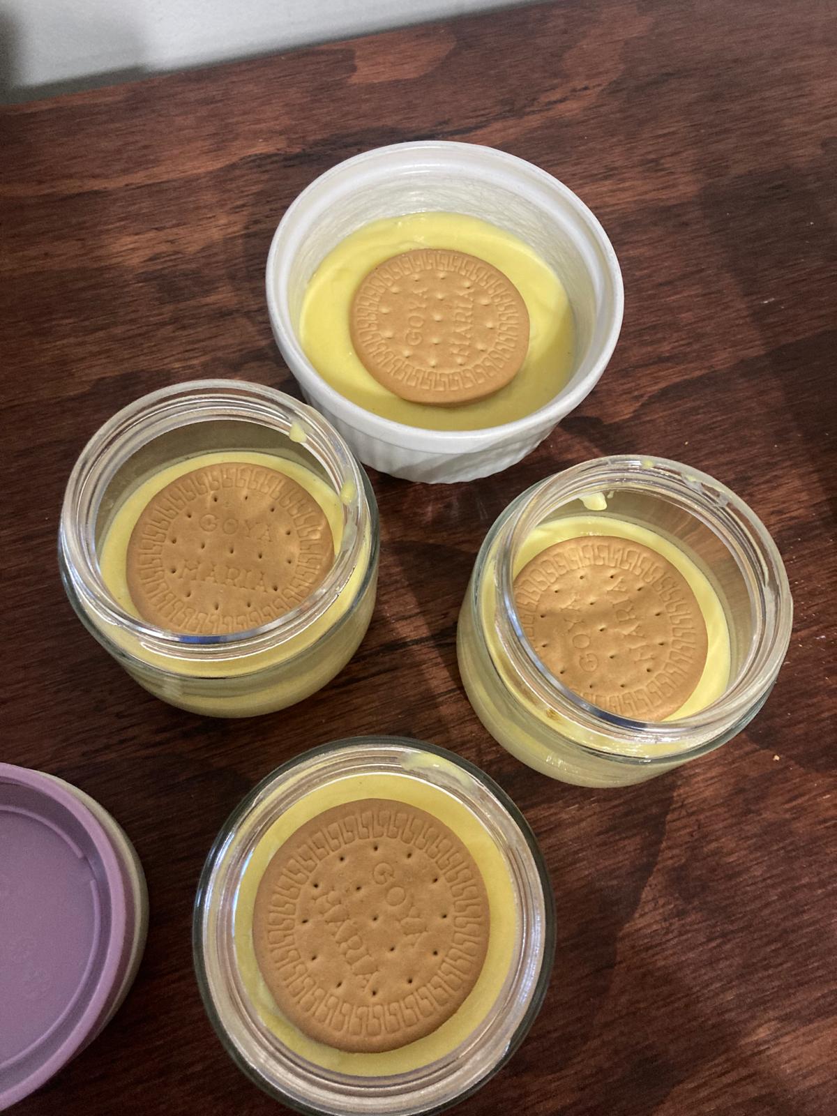 - Ponemos en cuencos y colocamos una galleta María encima. Metemos en la nevera y comemos en frío.