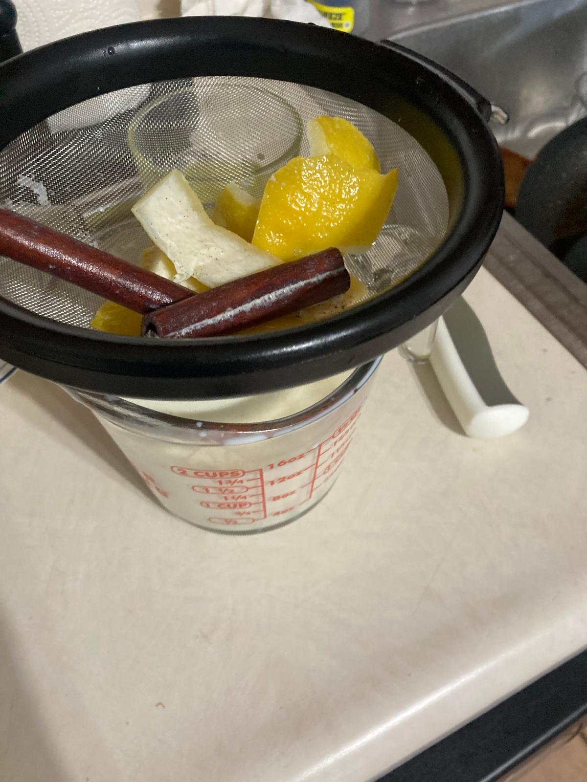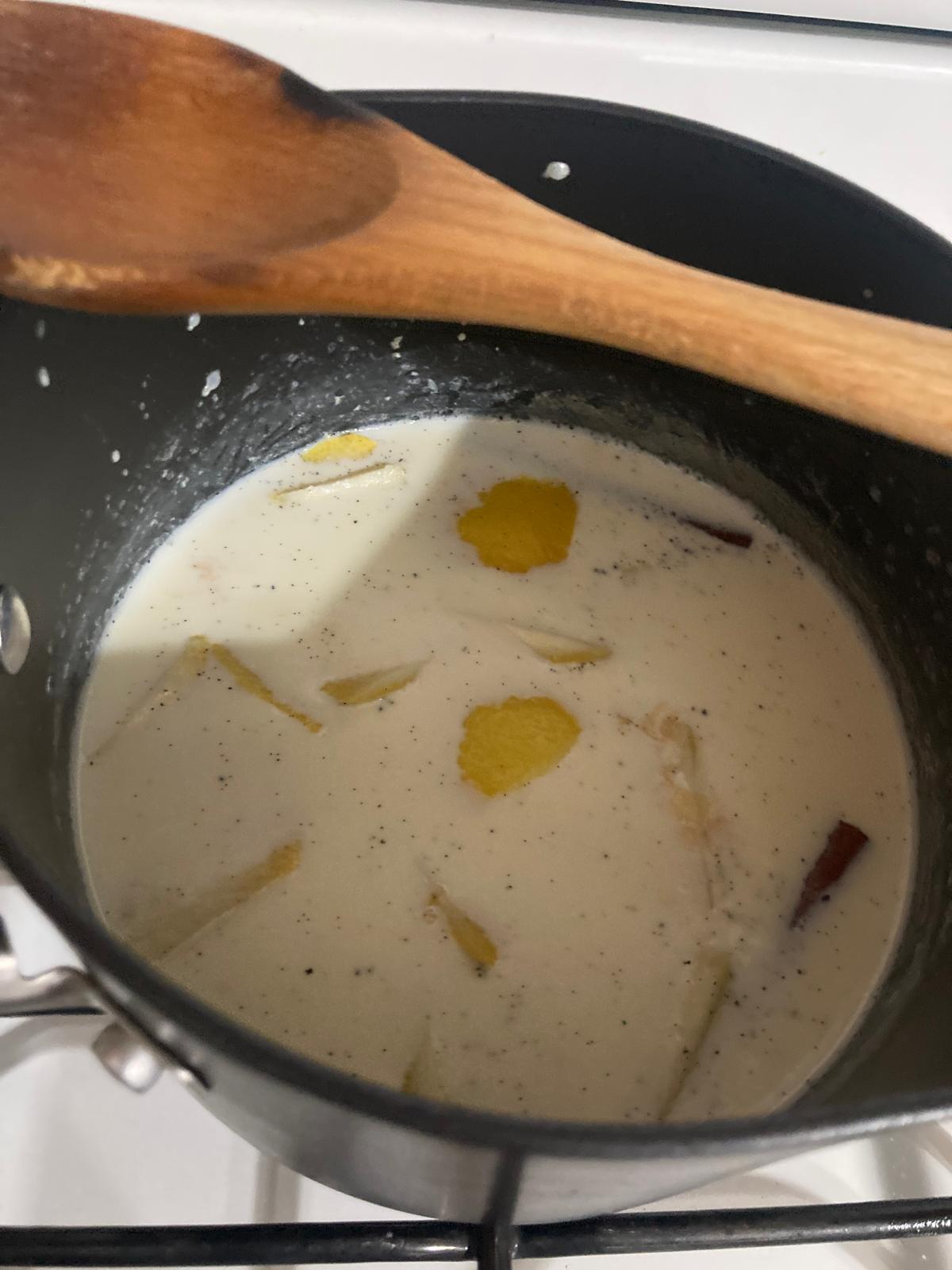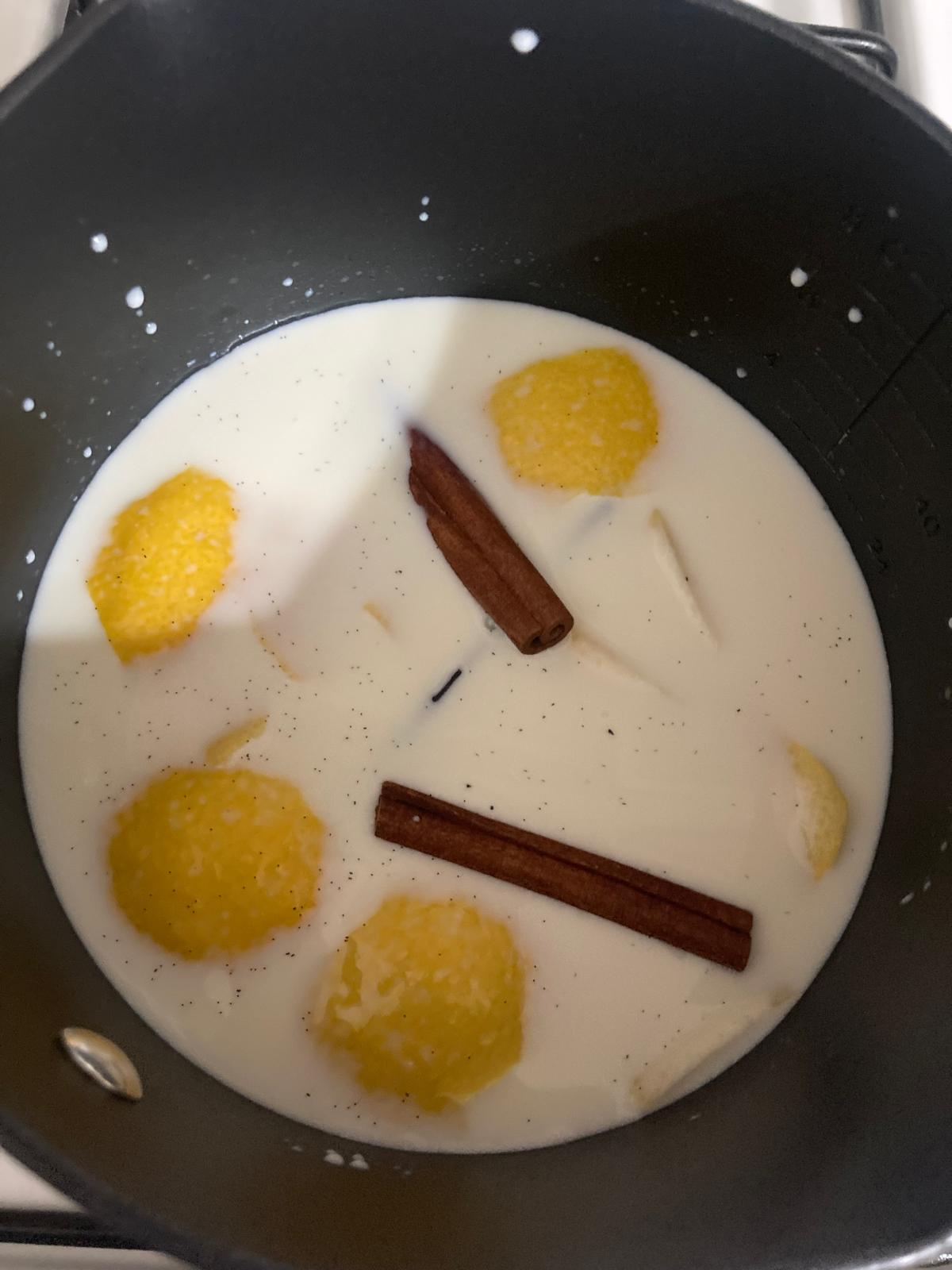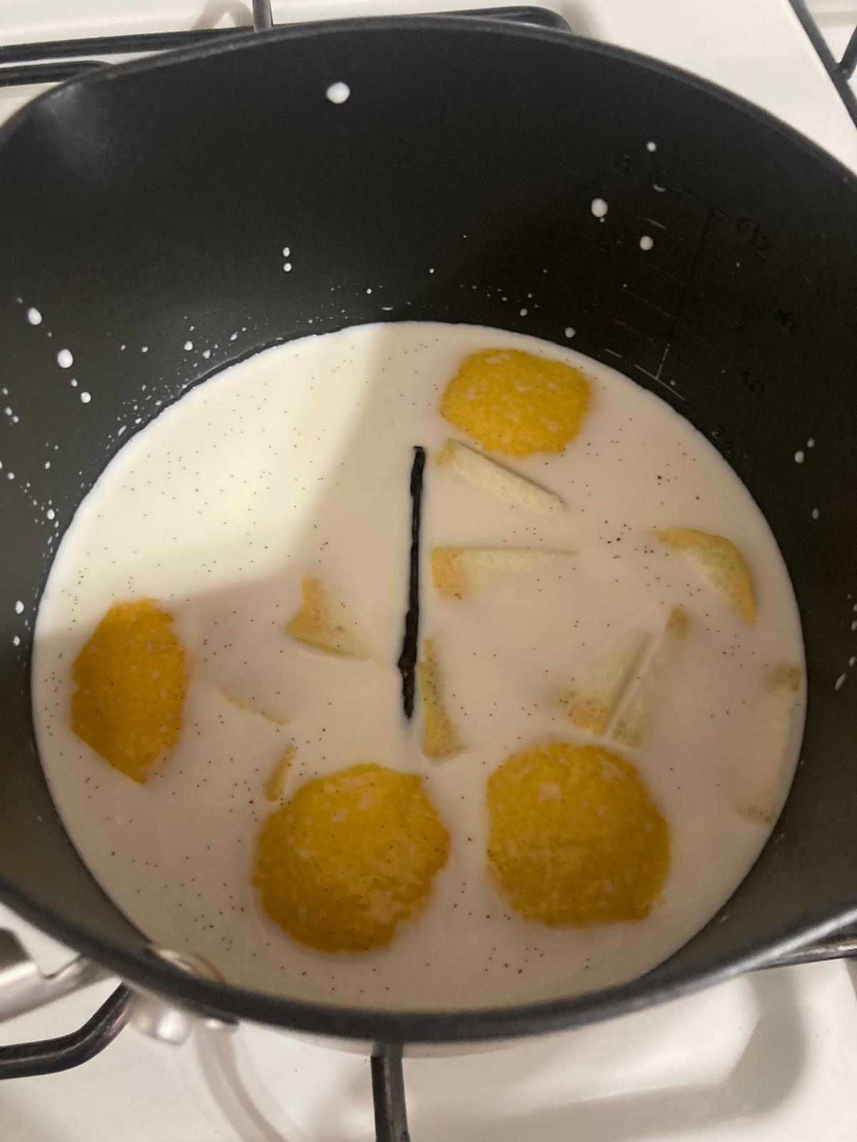 - Pelamos el limón y abrimos la vaina de vainilla. Introducimos en una olla la leche, vainilla, canela, y limón. Llevamos a ebullición y en cuanto hierva apartamos del fuego. Dejamos reposar 20min, que se mezclen los sabores.