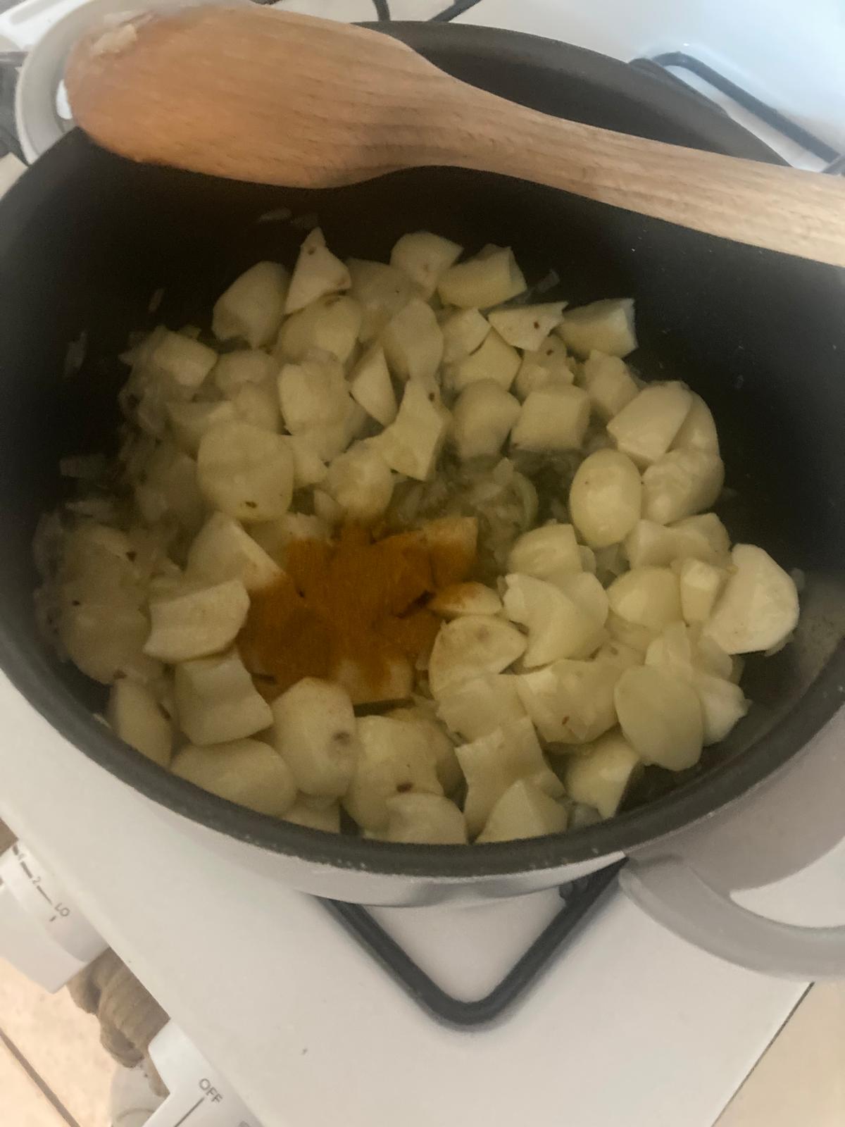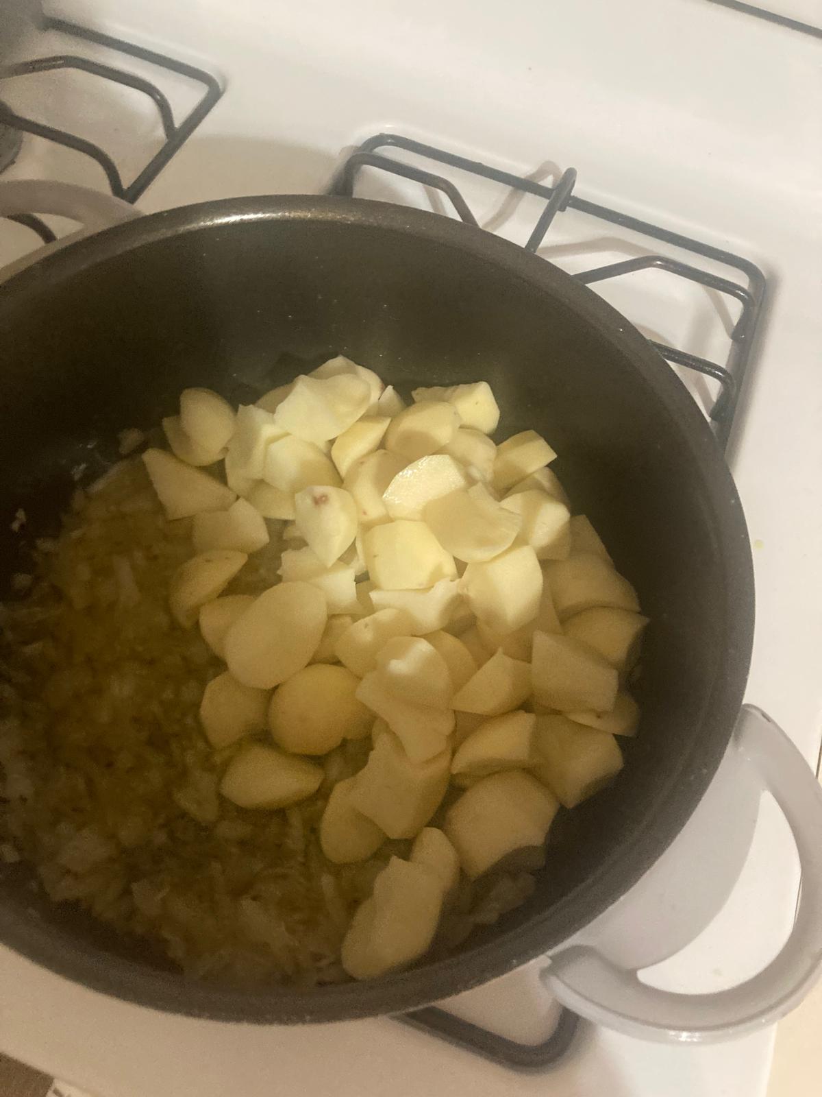 - Cuando la cebolla esté traslúcida, incorporamos las patatas con el pimentón. Las sofreímos un poco con la cebolla para que cojan sabor.