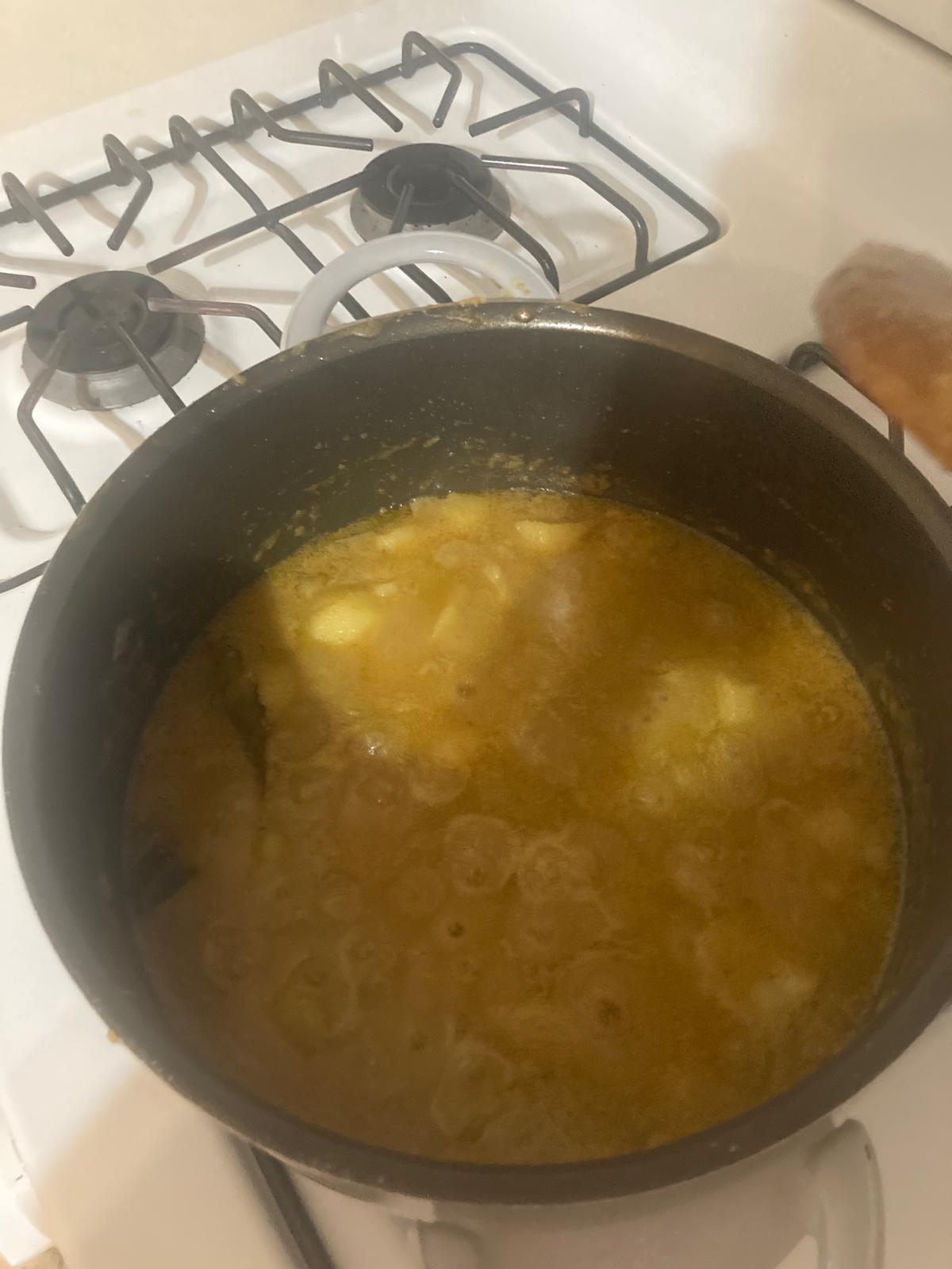 - Añadimos el majado, mezclamos, cubrimos todo con caldo de pollo, removemos. Salamos. Cocinamos a fuego medio-bajo durante alrededor de 45 minutos. Vamos probando y rectificamos de sal.