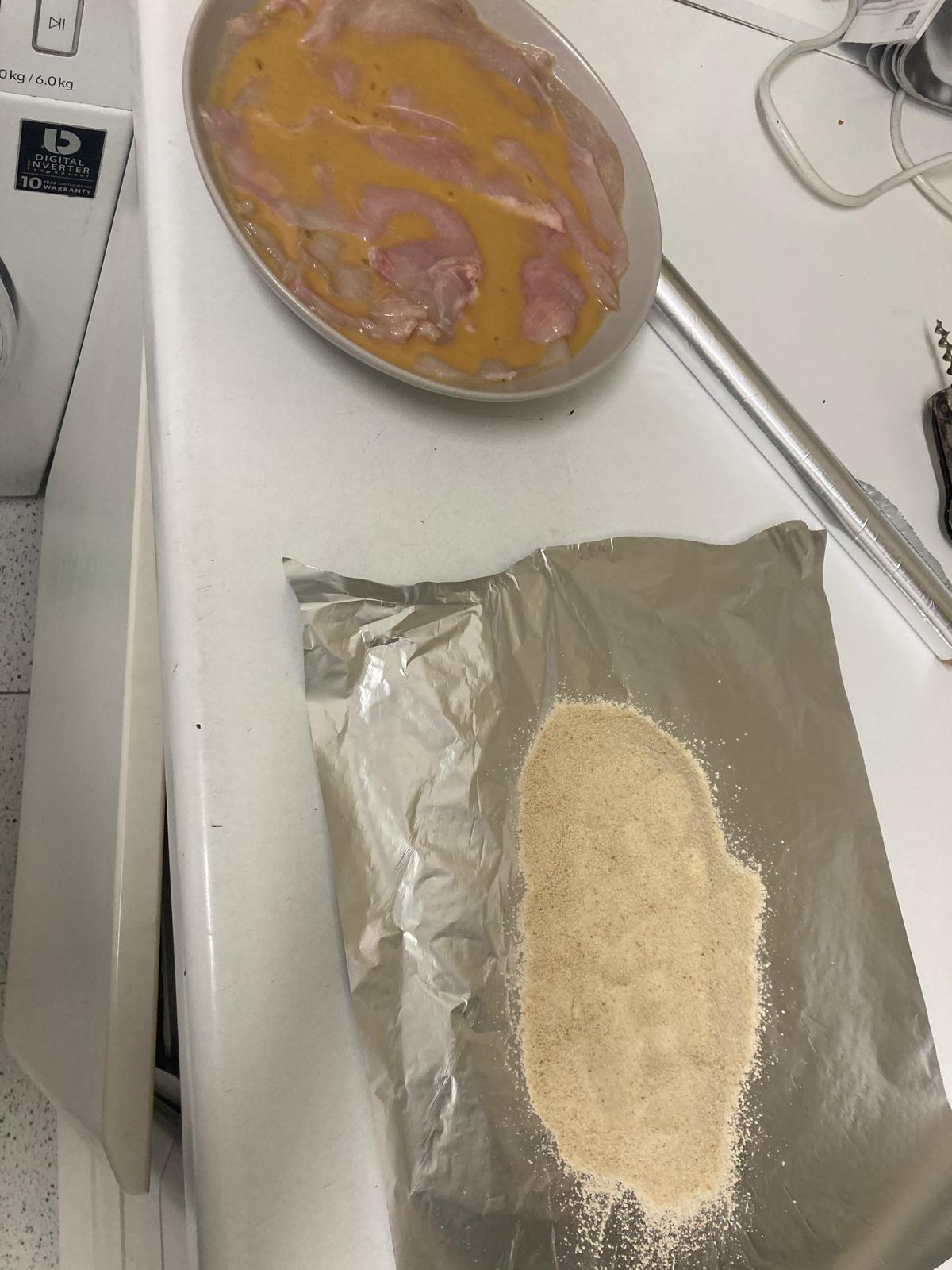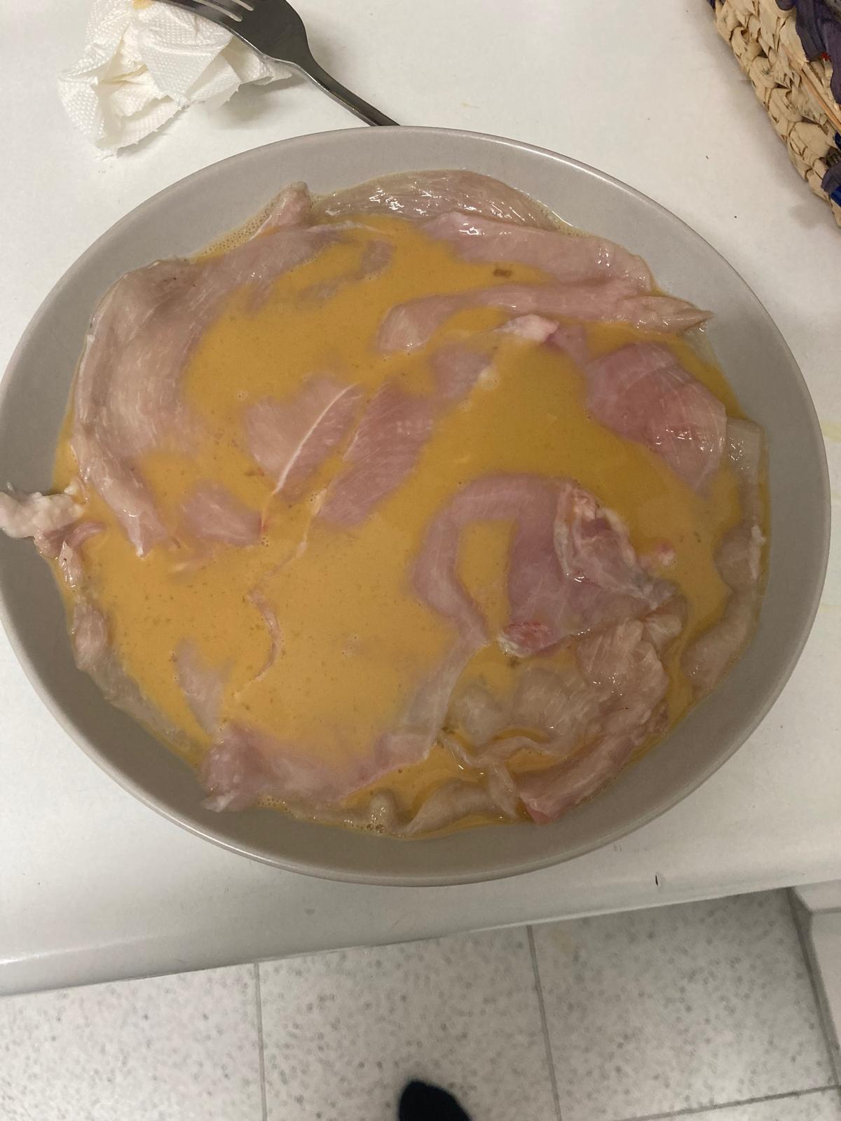 - Batimos dos huevos y los mezclamos con un chorro de vino de guisar o de leche entera. Metemos las pechugas de pollo en la mezcla y las dejamos ahí 10 o 15 minutos.