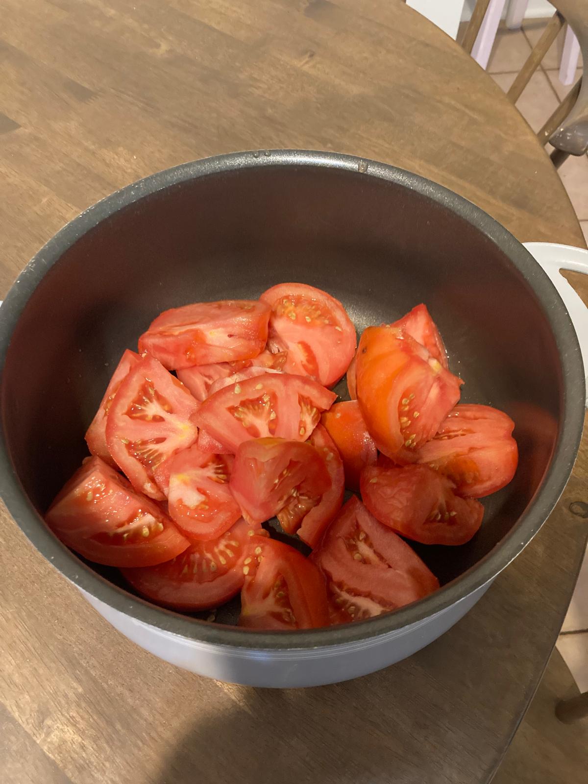 - Lavamos los tomates y quitamos el tallo. Cortamos en trozos. No hace falta pelarlos, al triturarlos no se notará la piel.