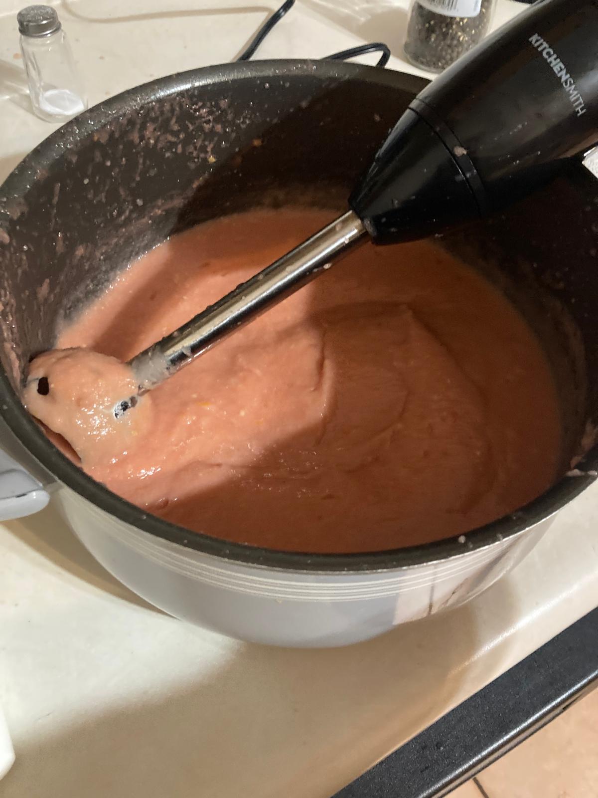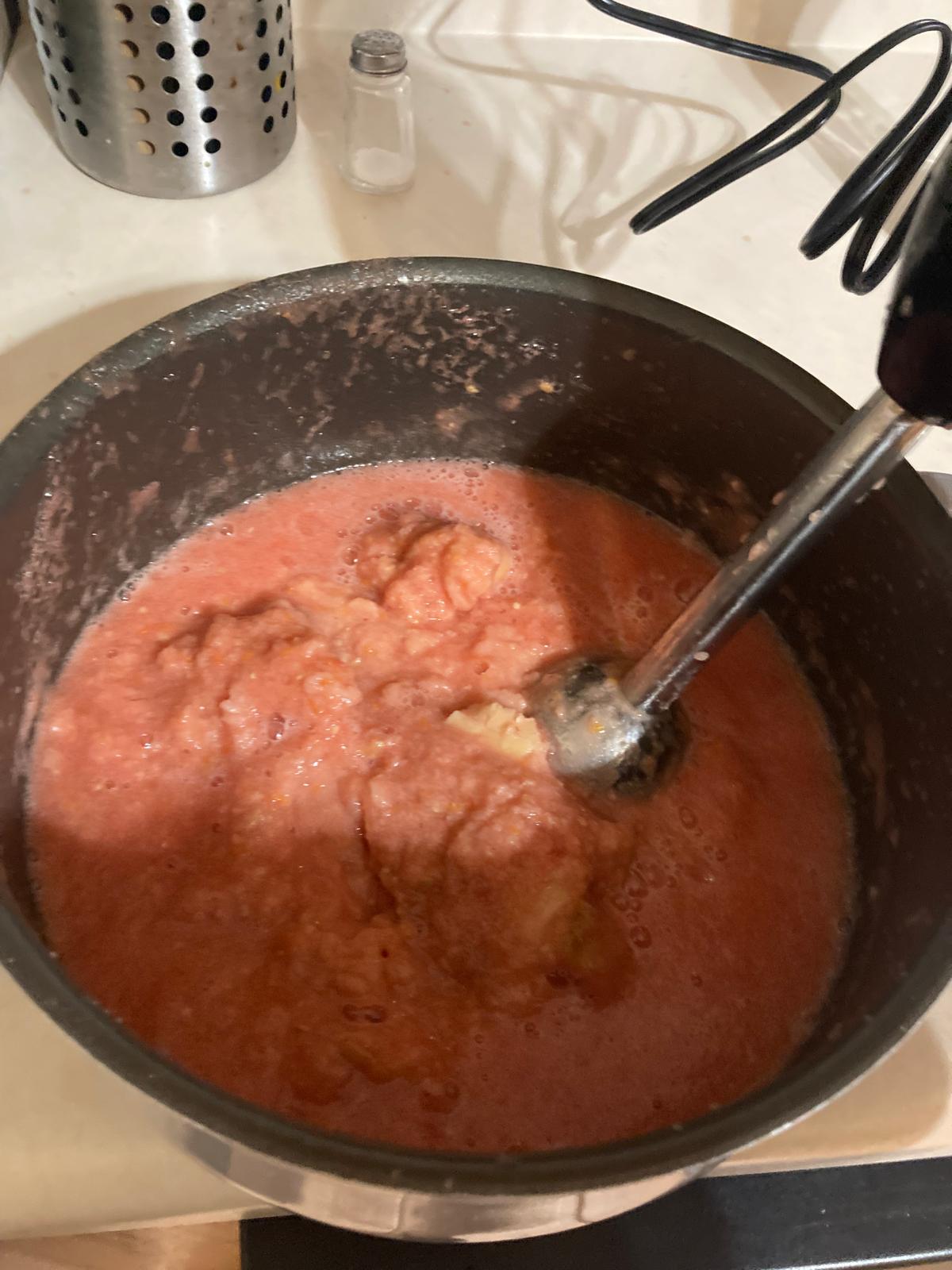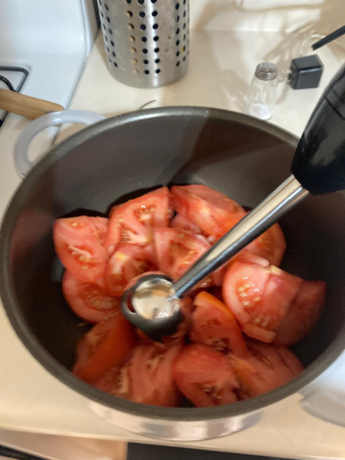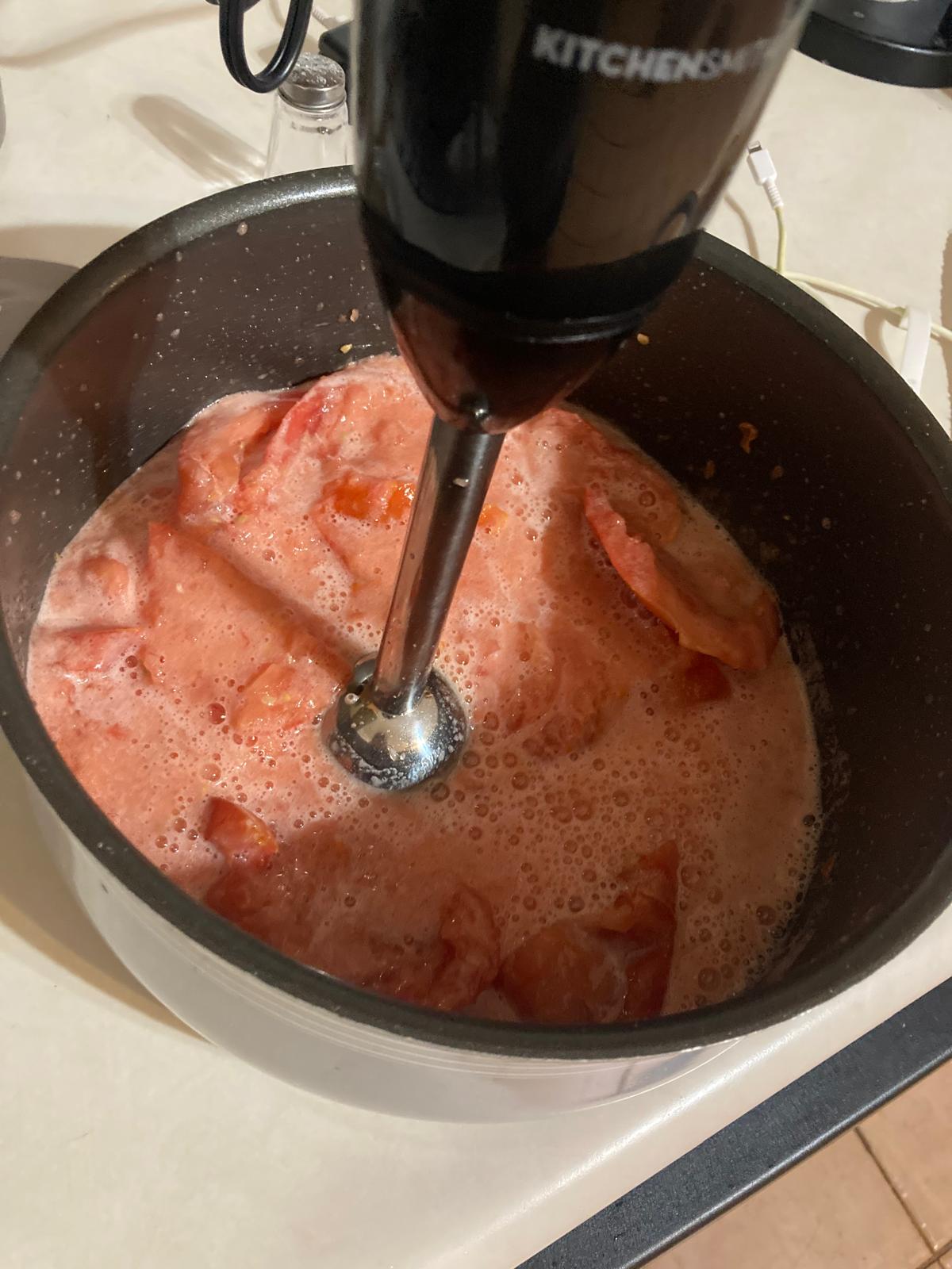 - Triturar los tomates bien con la batidora hasta que no se vean trozos de tomate o trozos de piel.