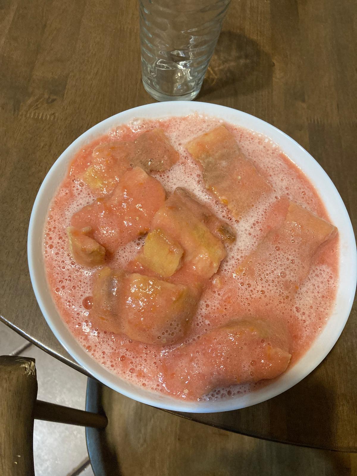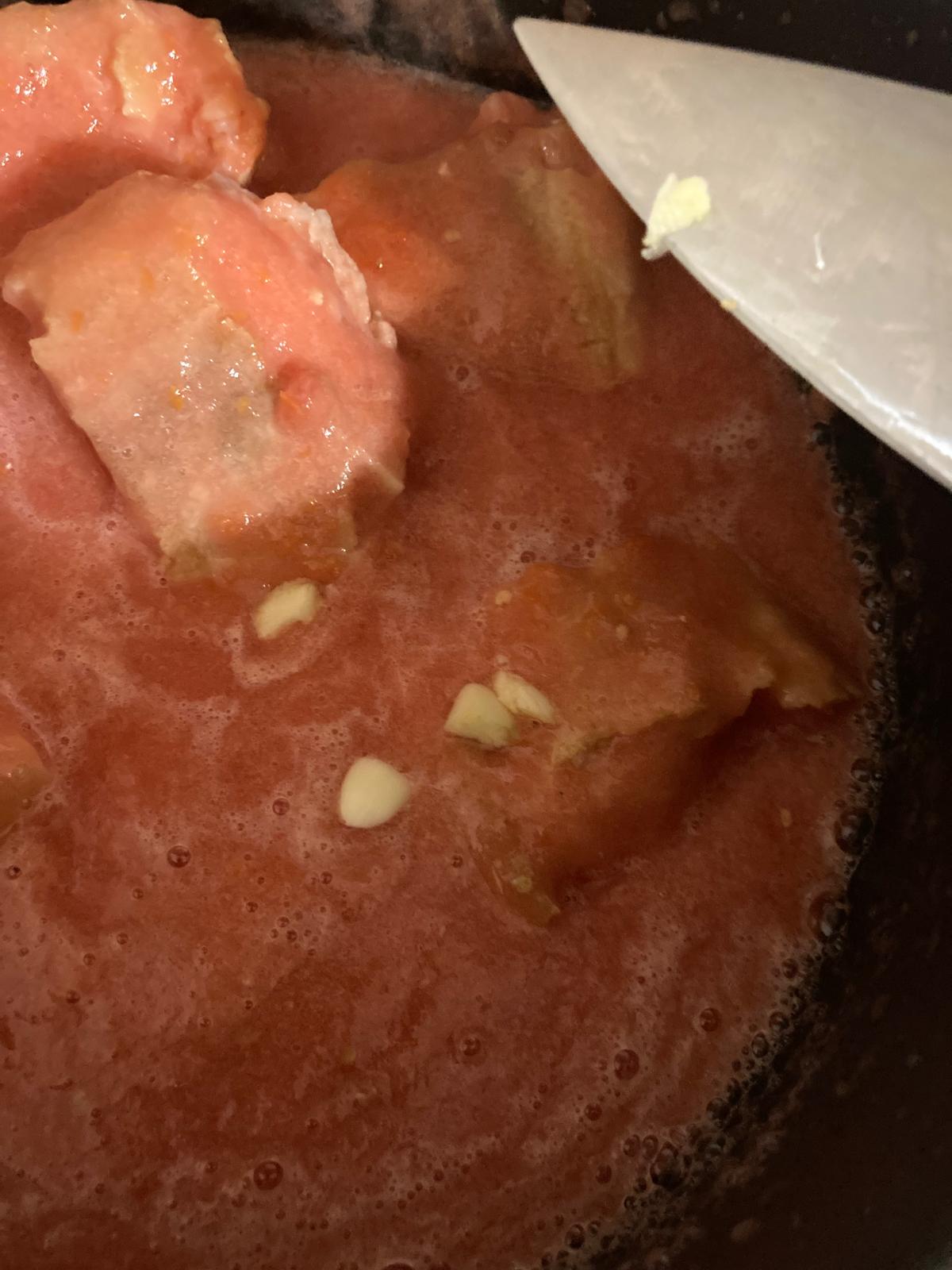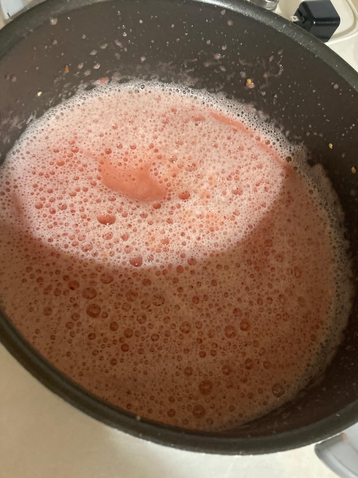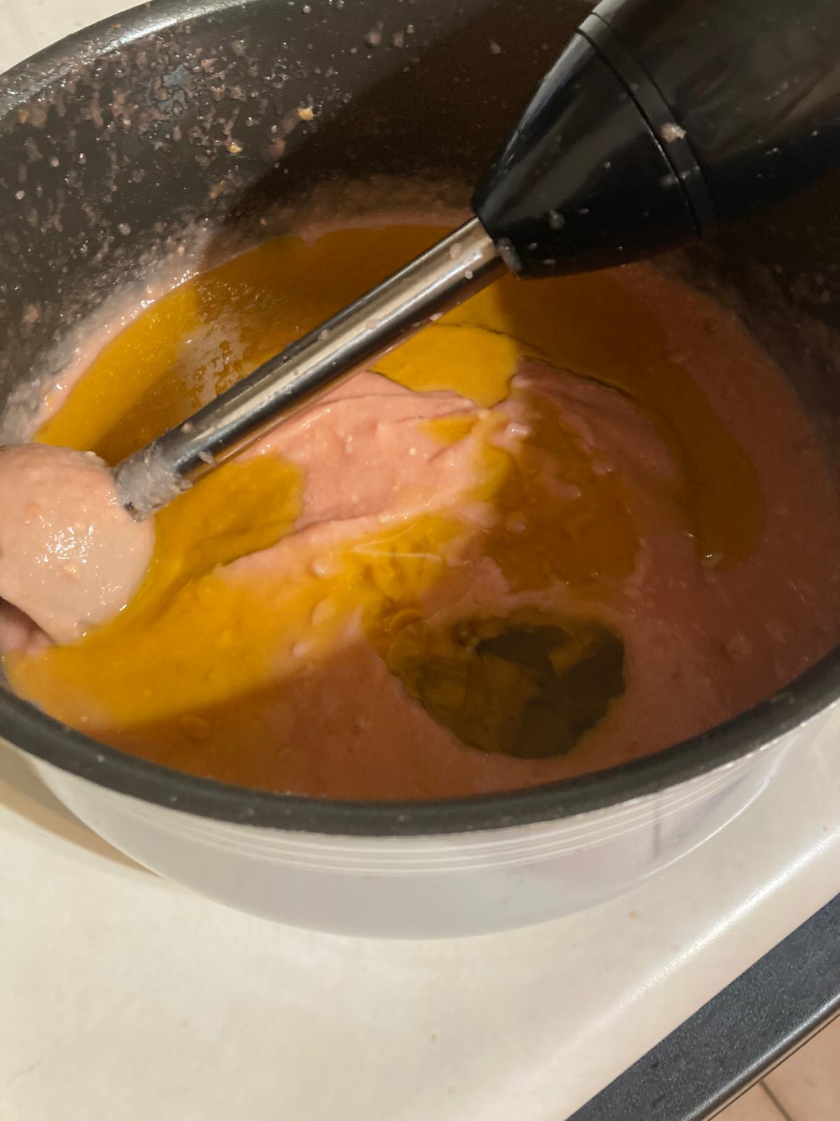 - Triturar los tomates bien con la batidora hasta que no se vean trozos de tomate o trozos de piel.