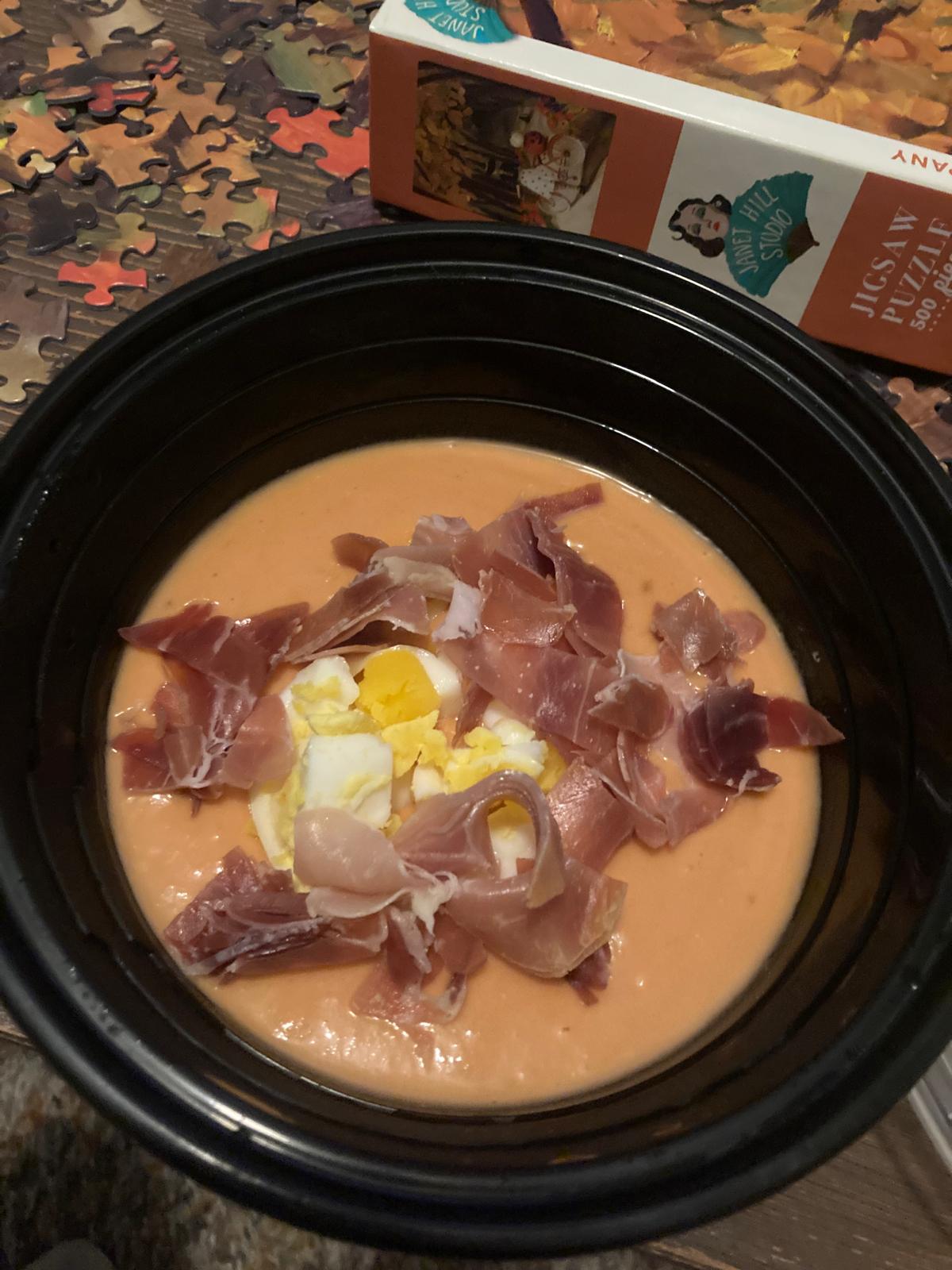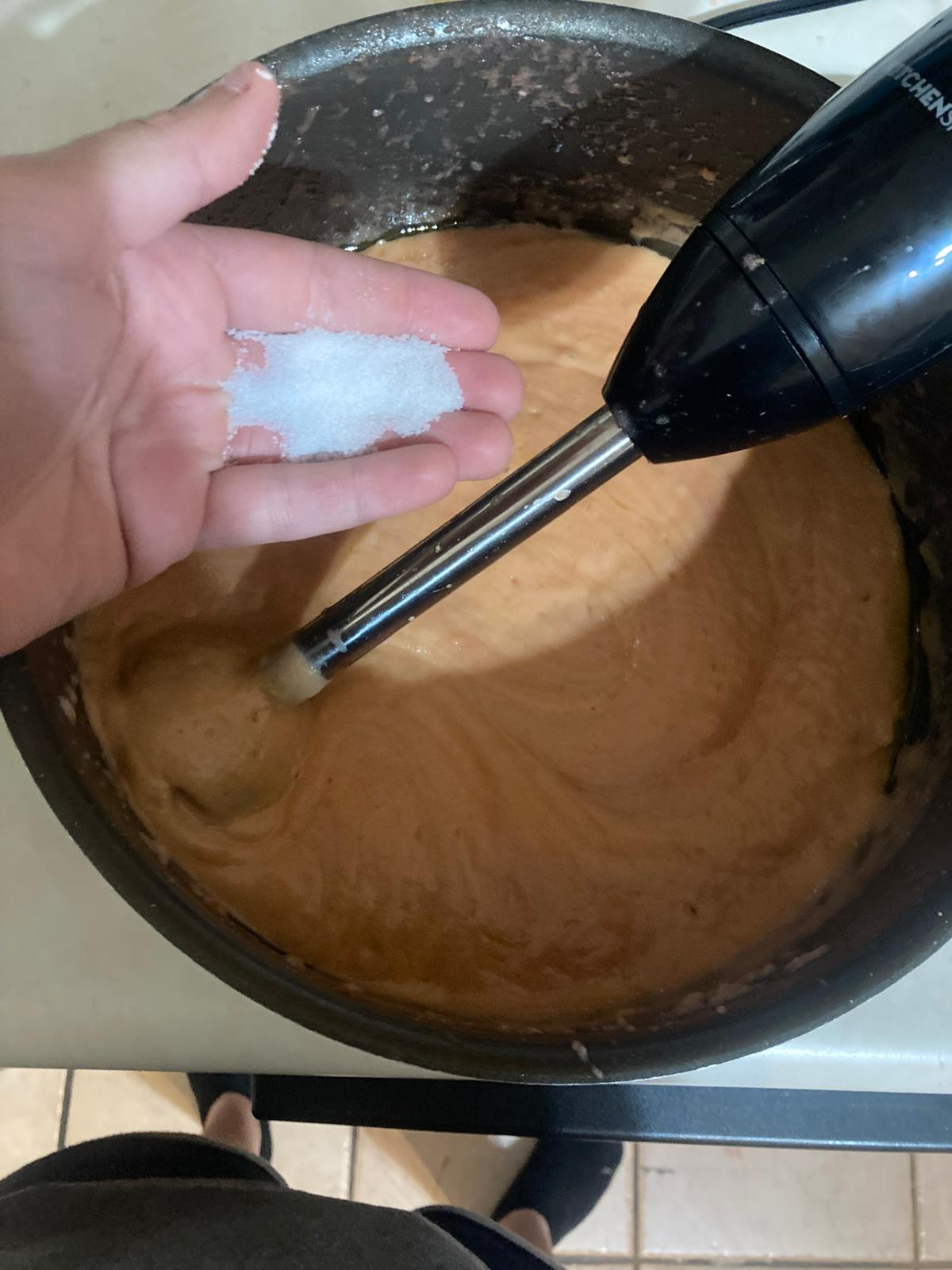 - Incorporamos el aceite y batimos todo hasta que el salmorejo sea uniforme, suficientemente compacto para aguantar en su superficie el jamón y huevo. En este momento añadimos también un puñado de sal.