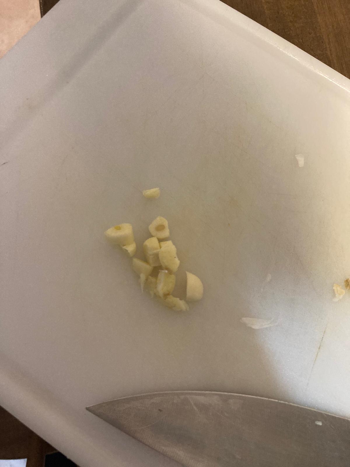 - Picamos el diente de ajo y lo añadimos a la mezcla. Trituramos todo bien hasta que no se noten muchos grumos de pan. Tendremos una crema espesa.