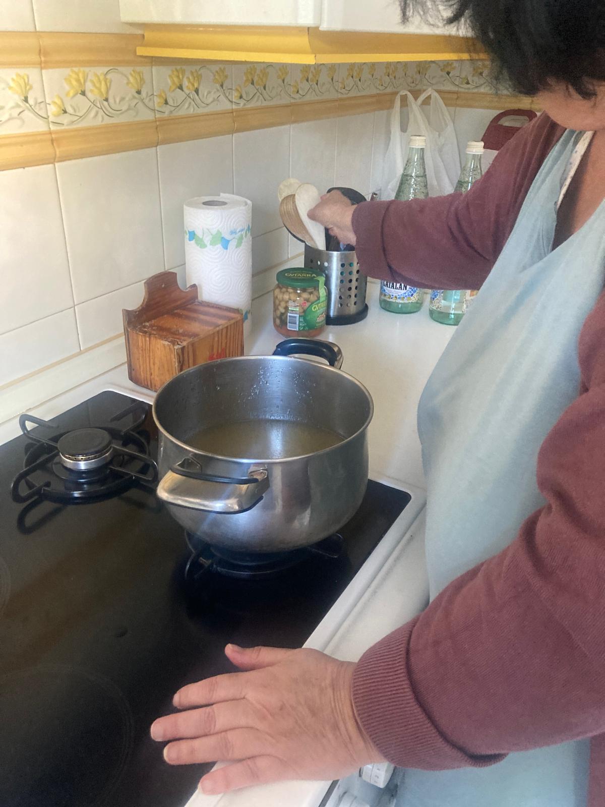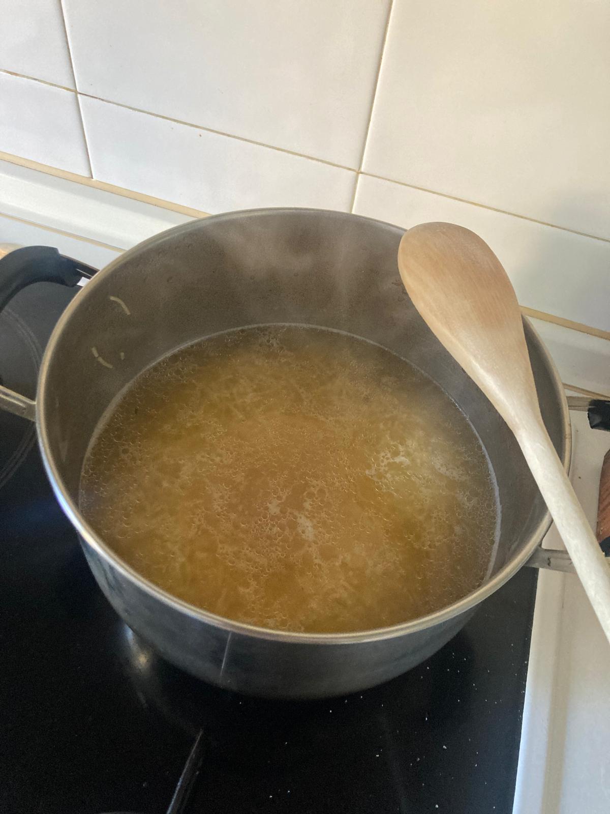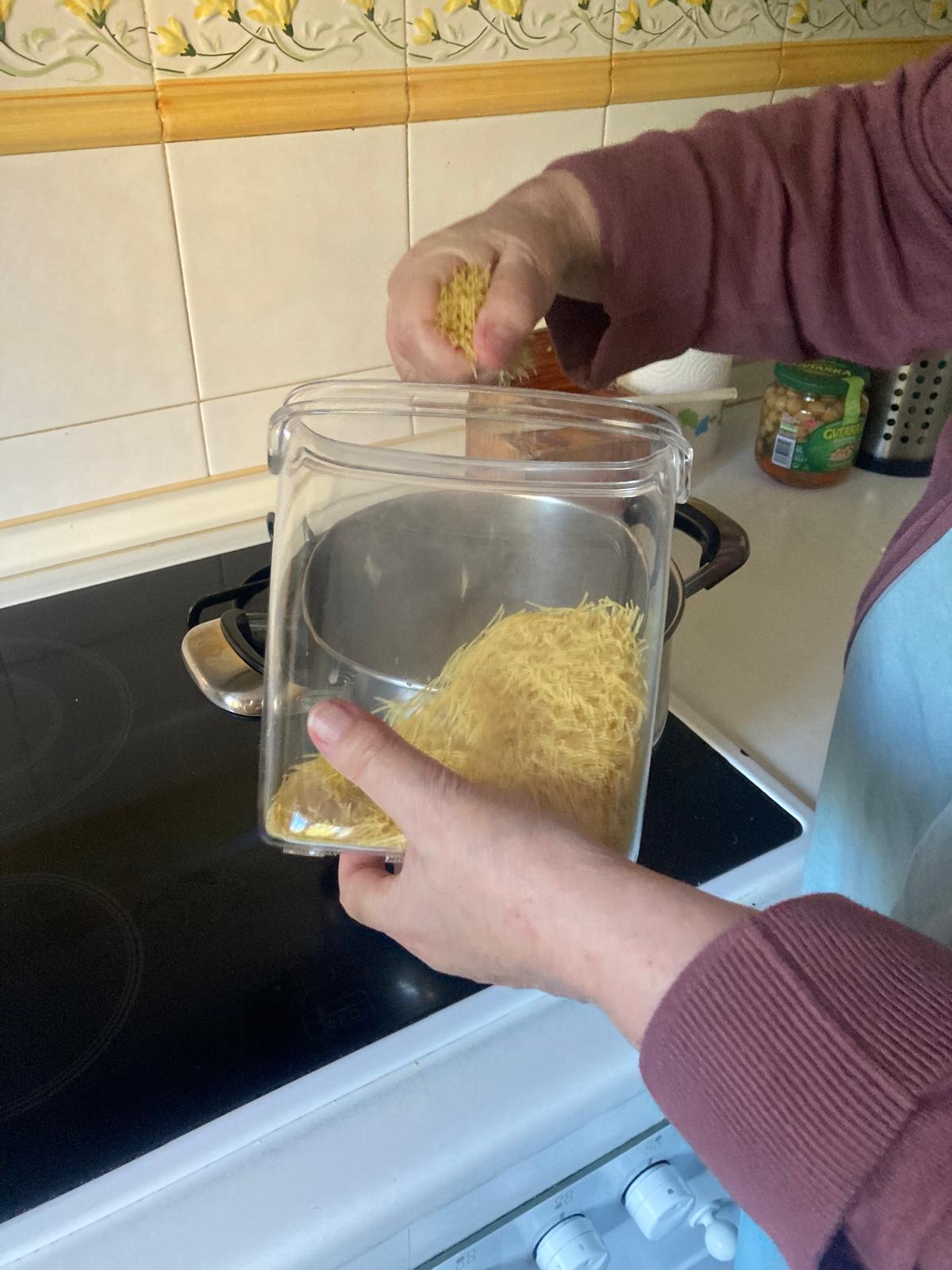 Ponemos a fuego alto y cuando hierva echamos los fideos al gusto y bajamos a fuego medio.Vamos probando hasta que se hagan los fideos y rectificamos de sal si fuera necesario