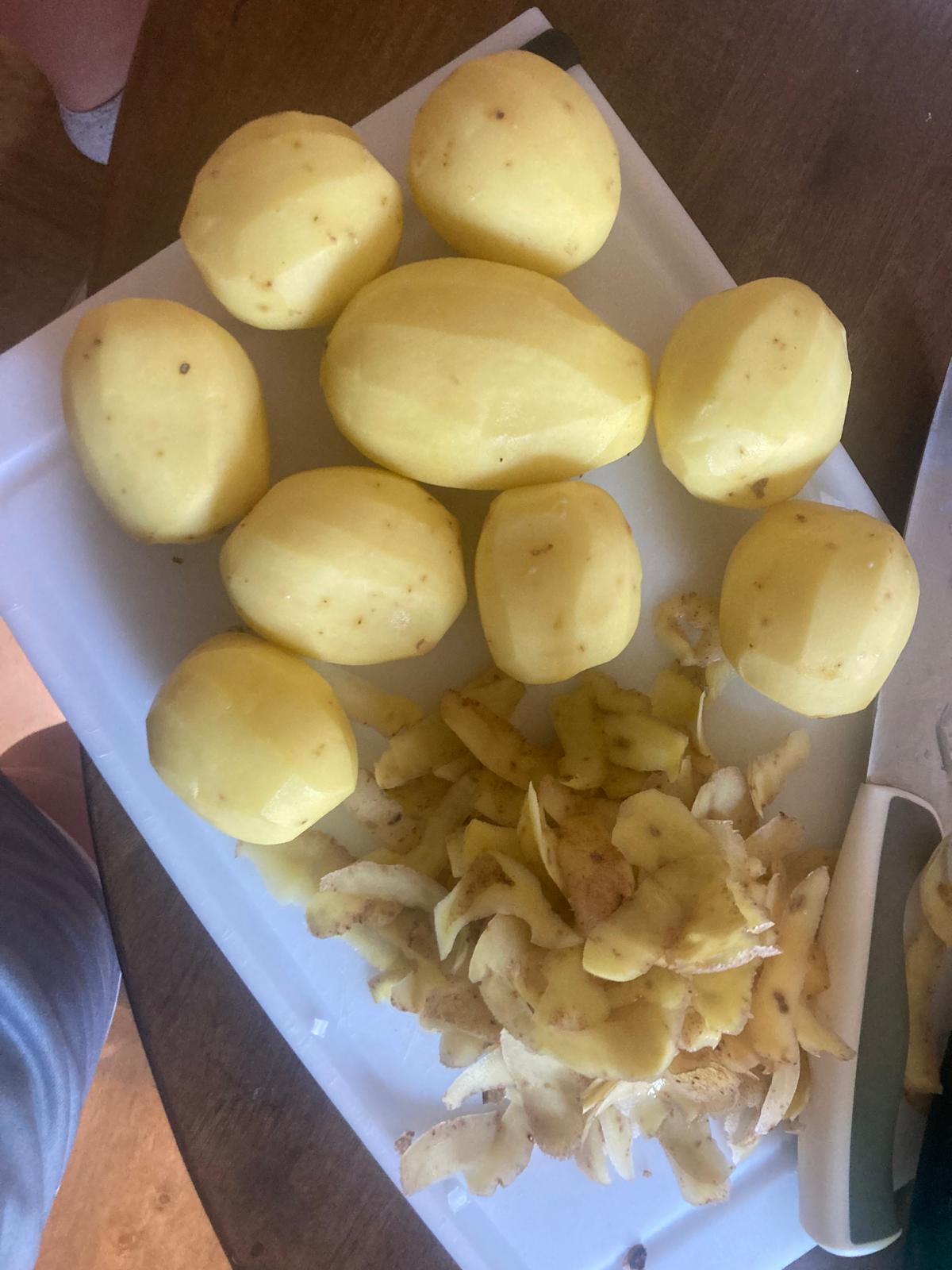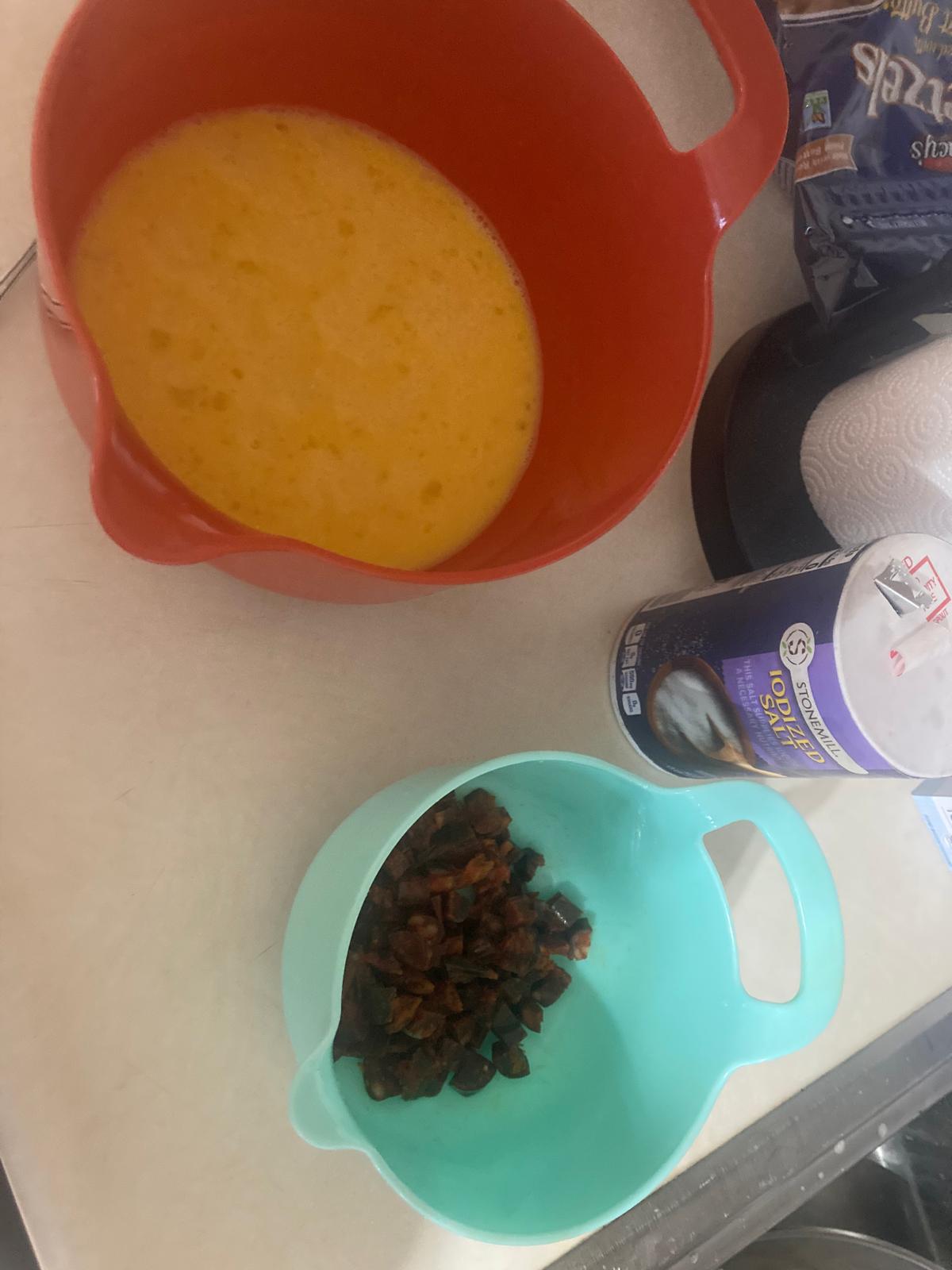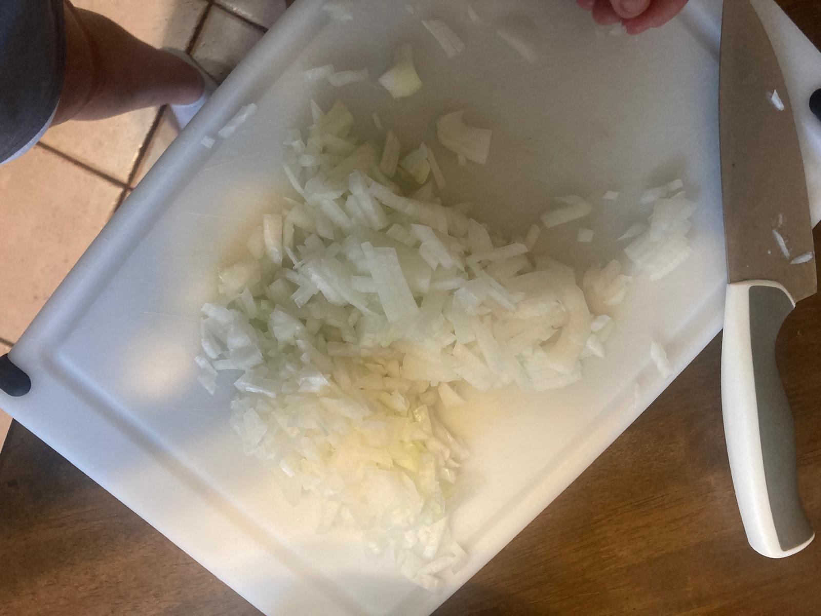 - Mientras se hace la cebolla, cortamos el chorizo en trozos pequeños, batimos los huevos, y pelamos, lavamos, y chascamos las patatas en trozos medianos.