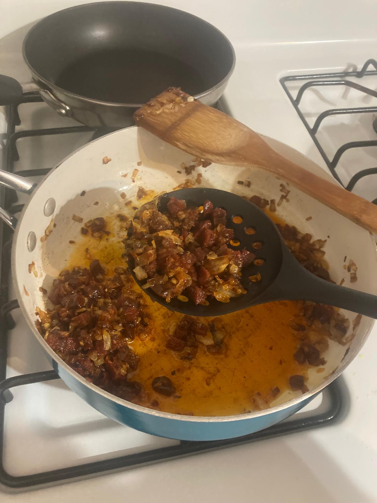 - Cuando haya pasado el tiempo, introducimos los trozos de chorizo en la sartén con la cebolla y los mezclamos un ratito, que se mezclen los sabores.