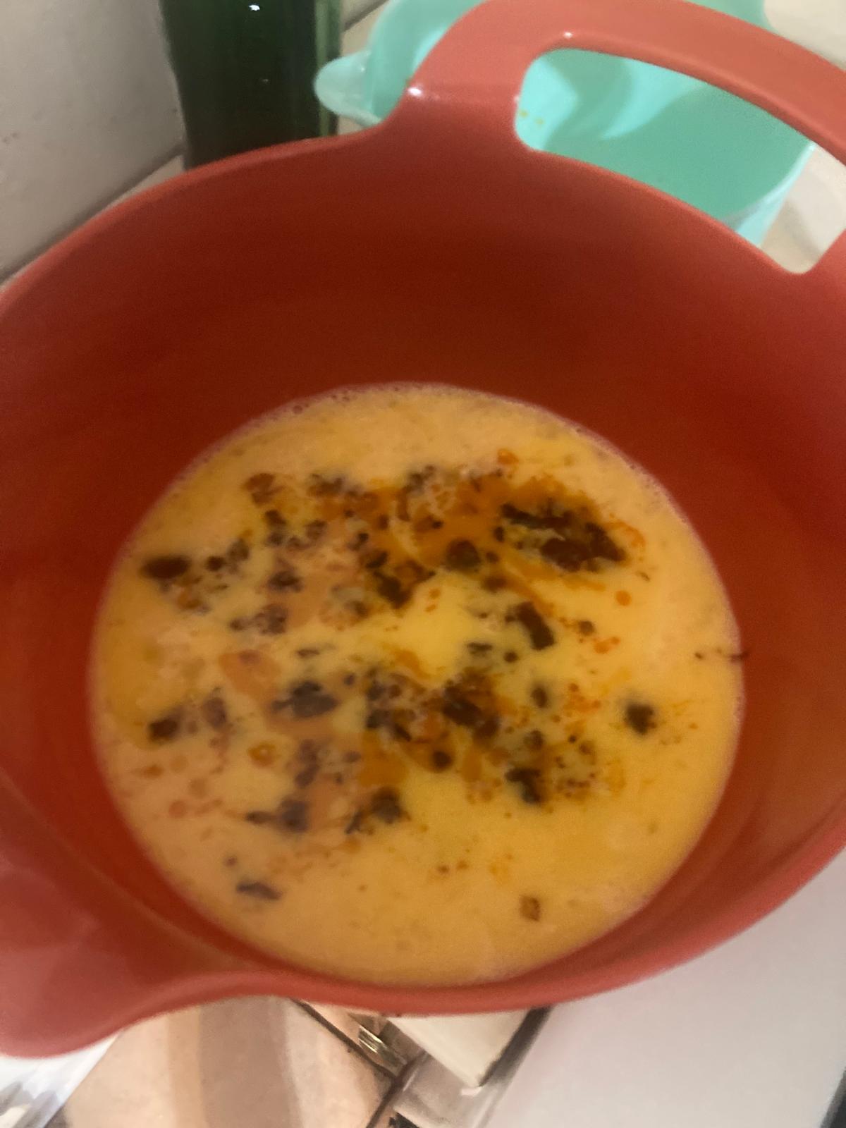 - Vamos escurriendo la mezcla de chorizo y cebolla y la introducimos en los huevos batidos. Mezclamos y dejamos un rato que se mezclen los sabores.