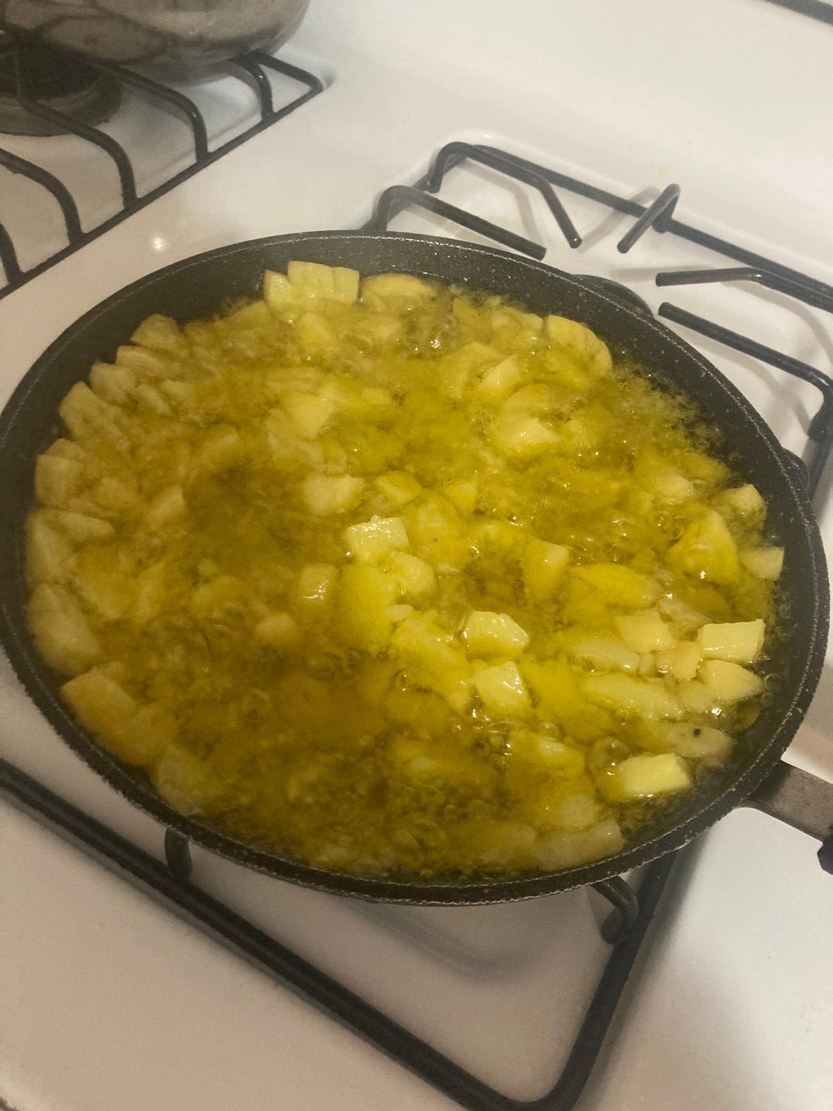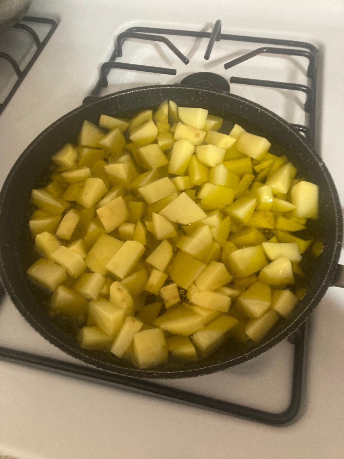- Echamos una cantidad generosa de aceite de oliva virgen extra en una sartén y freímos las patatas. Empezamos a fuego medio-bajo, y bajamos el fuego para que no se tueste. Con un tenedor, espachurramos un poco las patatas cuando estén blandas. Esto mejorará la consistencia.