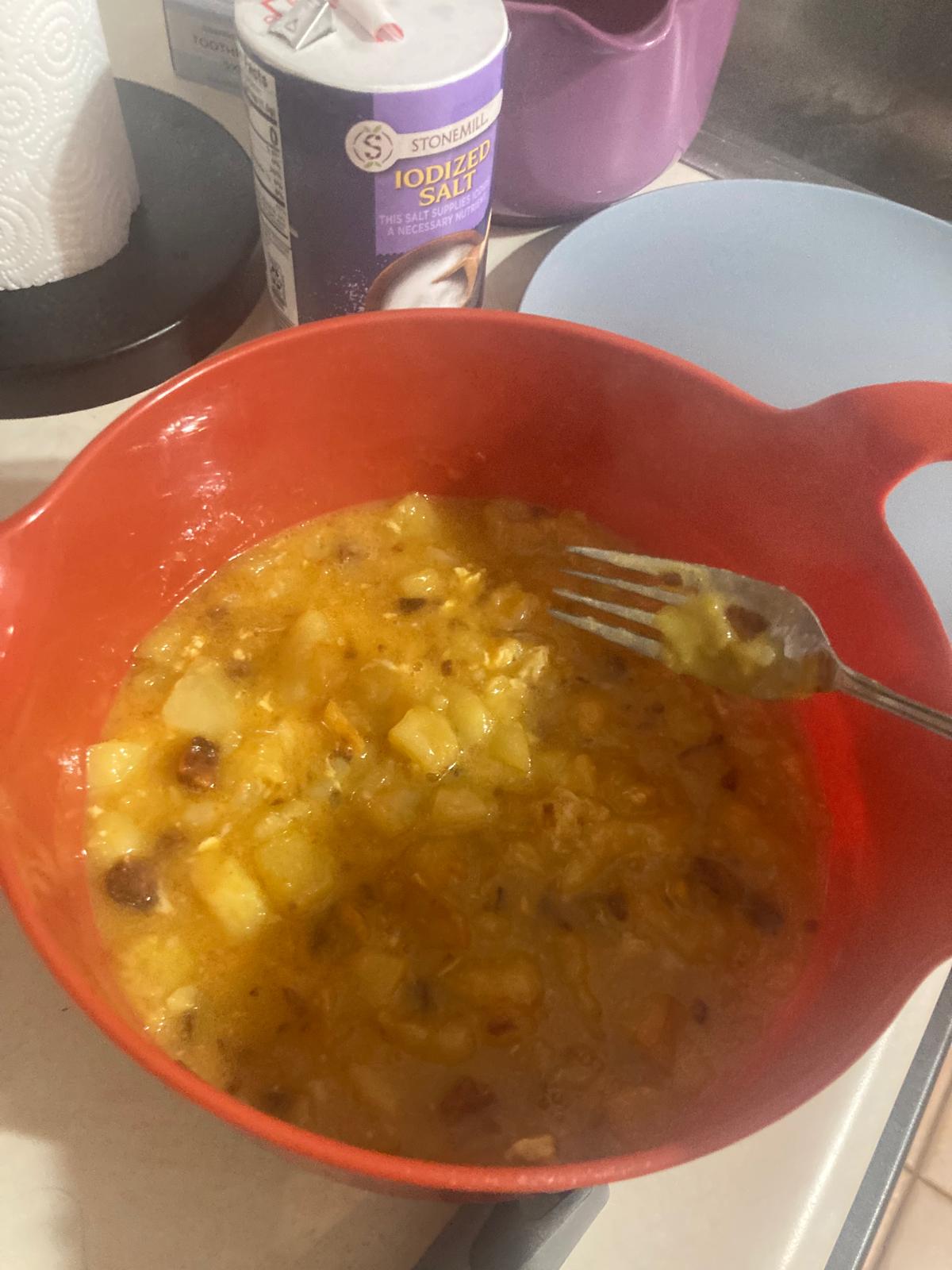 - Vamos escurriendo las patatas y metiéndolas en la mezcla con el huevo, el chorizo y la cebolla. Mezclamos bien y dejamos unos minutos reposando.