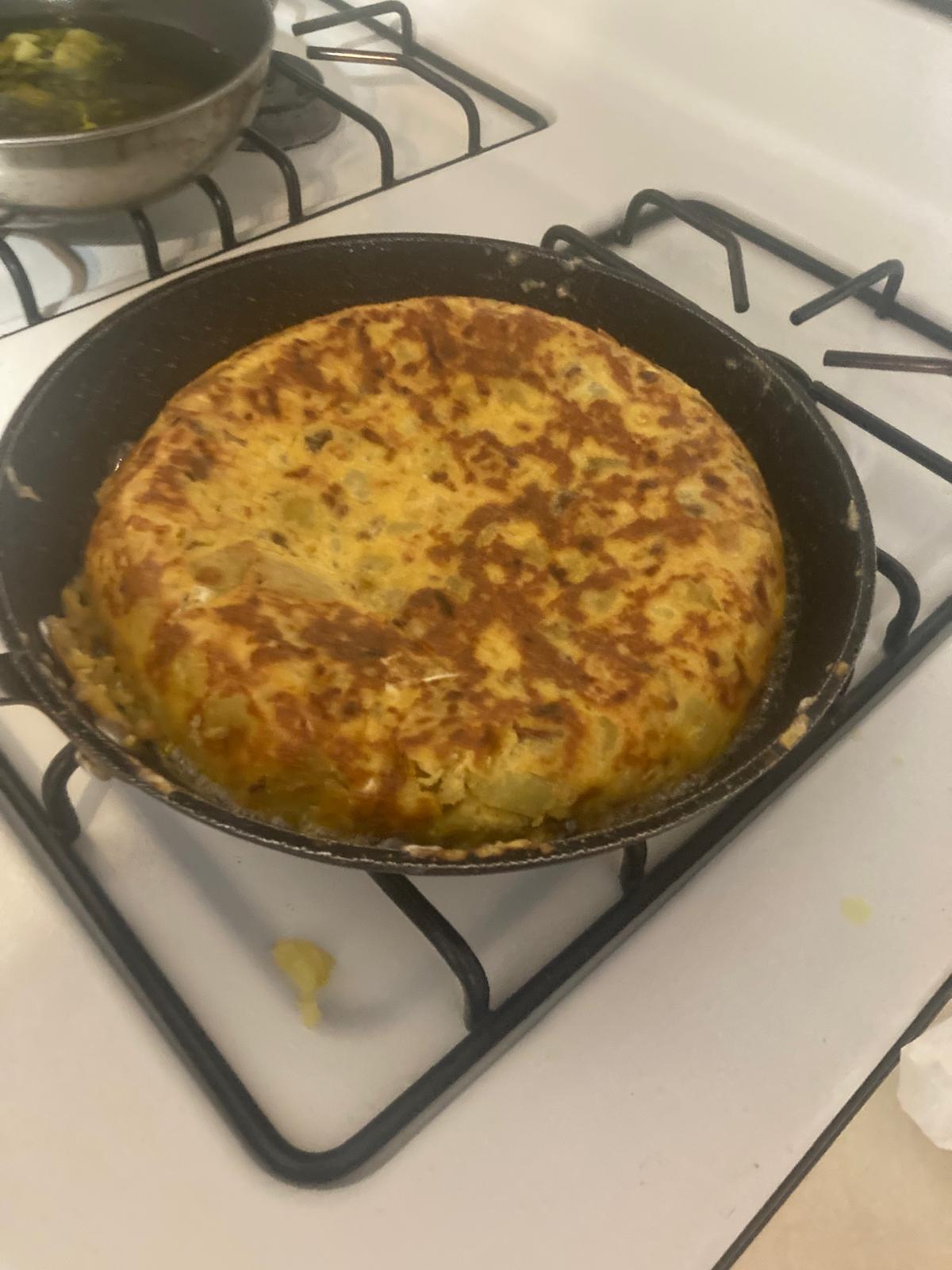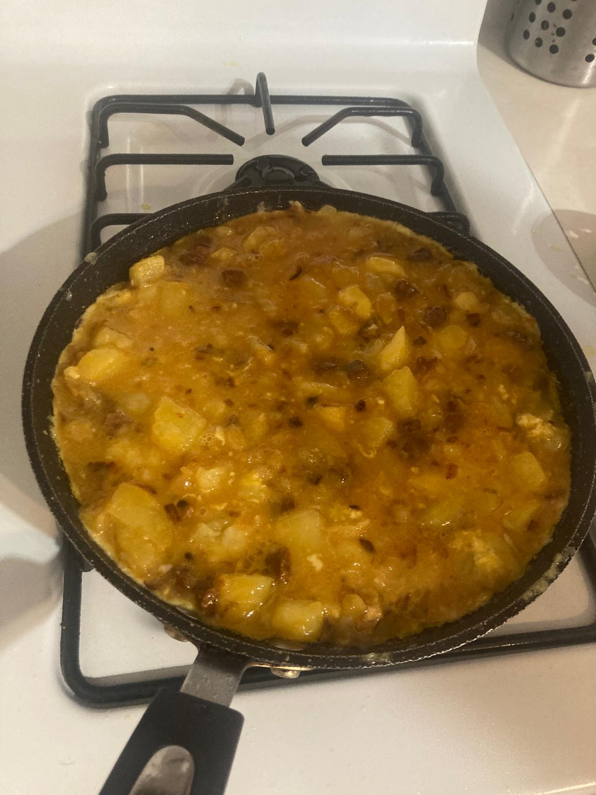- Echamos aceite en una sartén para que no se pegue la tortilla. Vertemos la mezcla de huevo y patata. Cocinamos 1 minuto y medio por cada lado, o de 2 a 3 minutos si nos gusta más cuajada.