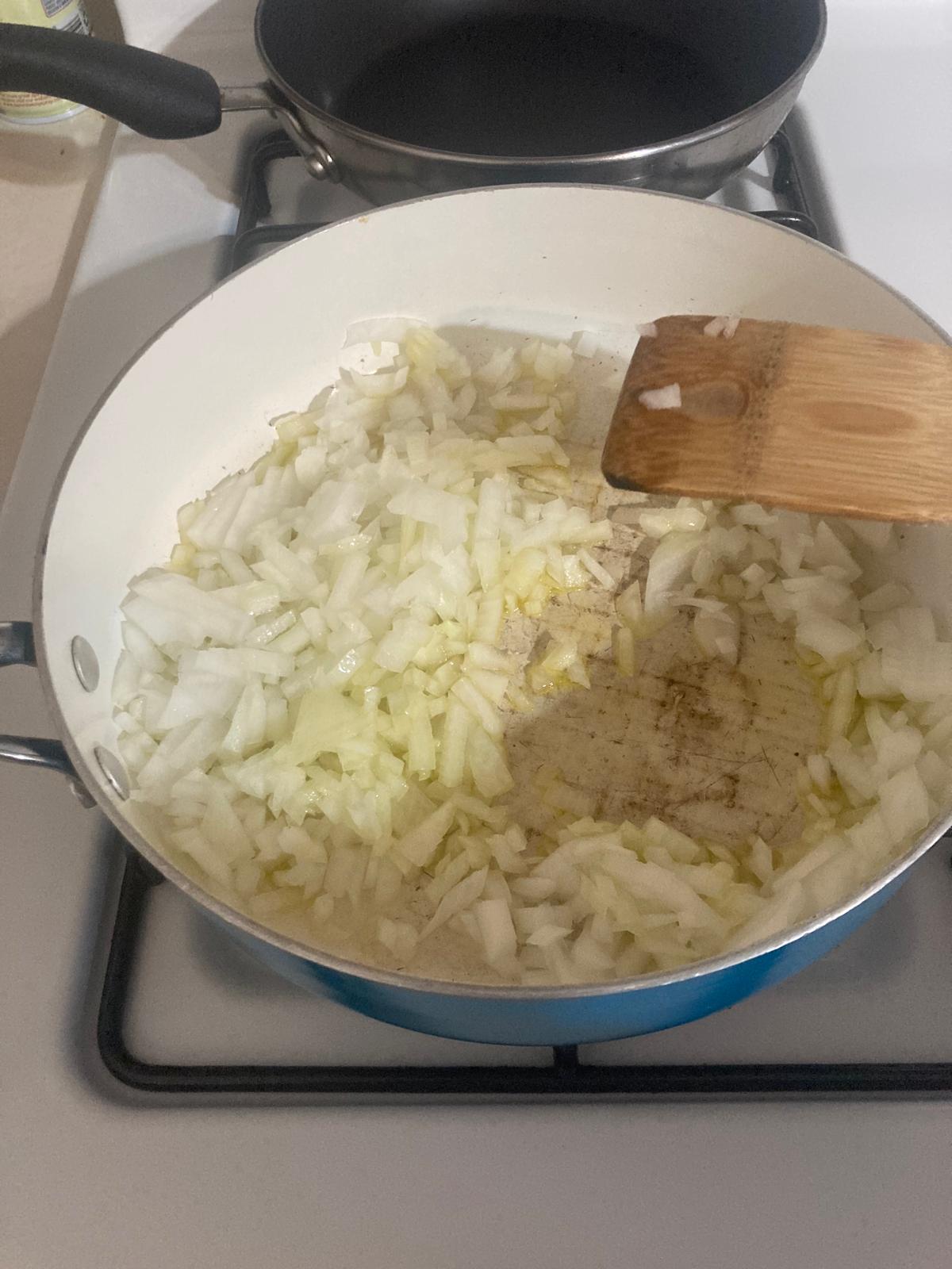 - Picamos la cebolla y la sofreímos en aceite de oliva virgen extra a fuego bajo. Echamos una pizca de sal. Dejamos que se haga 40min.