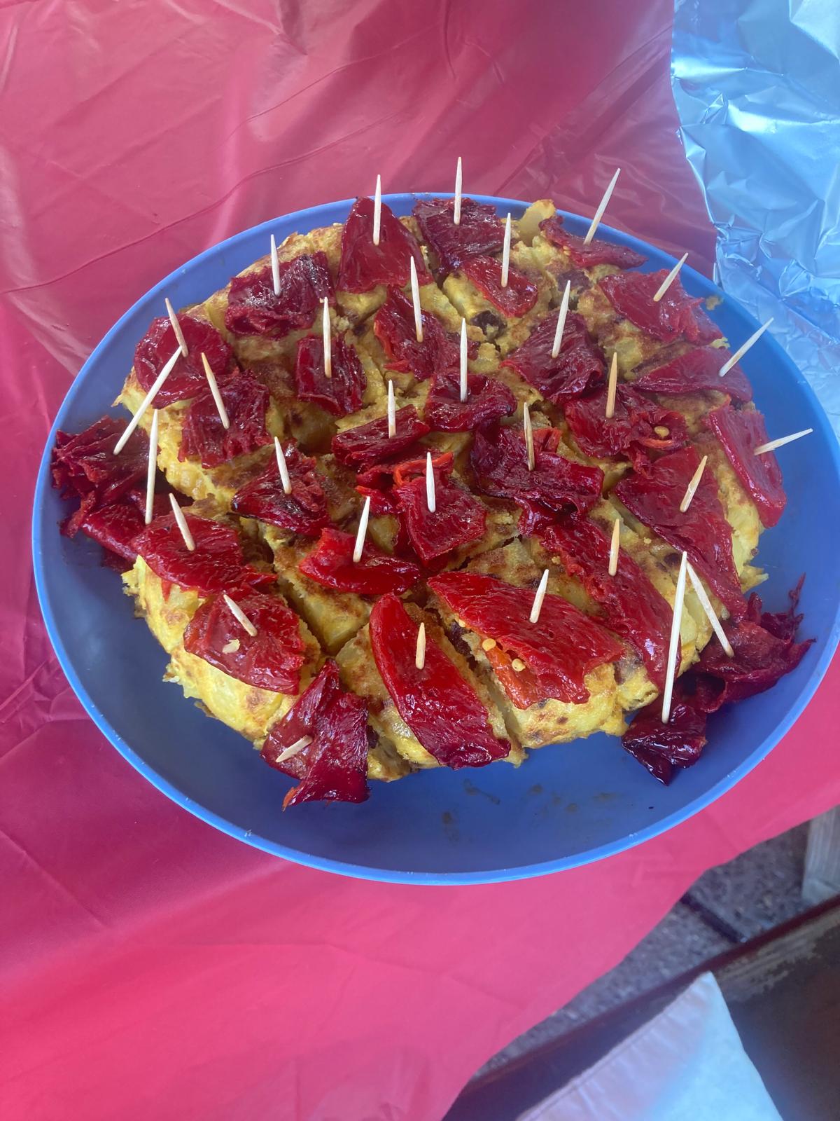 - Con unos palillos, vamos poniendo un trozo de pimiento encima de cada trozo de tortilla (cortada en cuadrados).