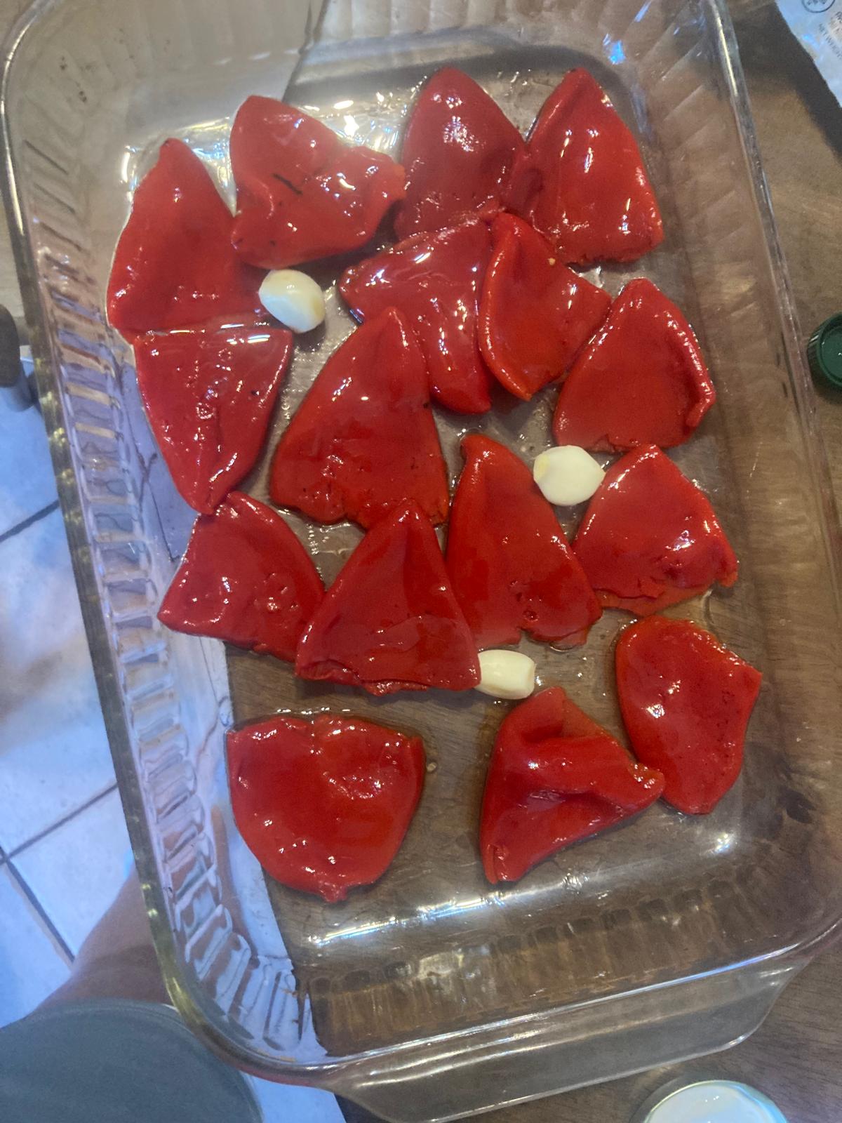 - Pelamos los ajos. En una fuente de horno, restregamos aceite de oliva y ponemos los pimientos y los dientes de ajo. Precalentamos el horno a 180 grados Celsius. Cuando esté caliente, metemos los pimientos 20-30min.